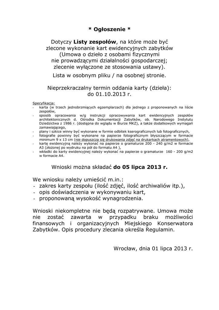 * Ogłoszenie * Dotyczy Listy zespołów, na które moŜe być zlecone wykonanie kart ewidencyjnych zabytków (Umowa o dzieło z osobami fizycznymi nie prowadzącymi działalności gospodarczej; zlecenie wyłączone ze stosowania ustawy). Lista w osobnym pliku / na osobnej stronie. Nieprzekraczalny termin oddania karty (dzieła): do 01.10.2013 r. Specyfikacja: karta (w trzech jednobrzmiących egzemplarzach) dla jednego z proponowanych na liście zespołów, sposób opracowania w/g instrukcji opracowywania kart ewidencyjnych zespołów architektonicznych d. Ośrodka Dokumentacji Zabytków, ob. Narodowego Instytutu Dziedzictwa z 1986 r. (dostępna do wglądu w Biurze MKZ), a takŜe dodatkowych wymagań zamawiającego, plany i szkice winny być wykonane w formie odbitek kserograficznych lub fotograficznych, fotografie powinny być wykonane na papierze fotograficznym błyszczącym w formacie minimum 9 x 13 cm (nie dopuszcza się drukowania zdjęć na drukarkach atramentowych), kartę ewidencyjną naleŜy wykonać na papierze o gramaturze 200 - 240 g/m2 w formacie A3 (złoŜonej po wydruku na pół do formatu A4 ), wkładki do karty ewidencyjnej naleŜy wykonać na papierze o gramaturze 160 - 200 g/m2 w formacie A4. Wnioski moŜna składać do 05 lipca 2013 r. We wniosku naleŜy umieścić m.in.: - zakres karty zespołu (ilość zdjęć, ilość archiwaliów itp.), - opis doświadczenia w wykonywaniu kart, - proponowaną wysokość wynagrodzenia. Wnioski niekompletne nie będą rozpatrywane. Umowa moŜe nie zostać zawarta w przypadku braku moŜliwości finansowych i organizacyjnych Miejskiego Konserwatora Zabytków. Opis procedury zlecania określa Regulamin. Wrocław, dnia 01 lipca 2013 r.