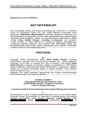 Kancelaria Notarialna Łukasz Gajos, Wojciech Małachowski s.c. Repertorium A numer 3047/2014 AKT NOTARIALNY Dnia dwunastego czerwca dwa tysiące czternastego roku (12.06.2014 r.) w budynku numer 44 (czterdzieści cztery) przy ulicy Józefa Maronia w Chorzowie przed notariuszem Wojciechem Małachowskim z Kancelarii Notarialnej w Gliwicach przy Alei Korfantego 8/1 prowadzonej w formie spółki cywilnej Notariuszy Łukasza Gajosa i Wojciecha Małachowskiego, odbyło się Zwyczajne Walne Zgromadzenie Spółki o firmie: Elkop Spółka Akcyjna z siedzibą w Chorzowie, pod adresem: 41-506 Chorzów, ul. Józefa Maronia 44, wpisanej do Rejestru Przedsiębiorców w Krajowym Rejestrze Sądowym pod numerem KRS 0000176582 (cztery zera sto siedemdziesiąt sześć tysięcy pięćset osiemdziesiąt dwa), REGON: 272549956, z którego notariusz spisał następującej treści: ----------------------------------------------------- PROTOKÓŁ § 1. Zwyczajne Walne Zgromadzenie Spółki Elkop Spółka Akcyjna z siedzibą w Chorzowie o godzinie 13:00 otworzył Prezes Zarządu Pan Jacek Koralewski, informując, że na dzień 12 czerwca 2014 roku na godzinę 13:00 Zarząd Elkop Spółki Akcyjnej z siedzibą w Chorzowie, działając na podstawie art. 399 Kodeksu spółek handlowych zwołał Zwyczajne Walne Zgromadzenie, a ogłoszenie o zwołaniu ukazało się na stronie internetowej Spółki i w raporcie bieżącym numer 28/2014 z dnia 16 maja 2014 roku. ------------------------------------------------------------------------------Następnie Pan Jacek Koralewski zaproponował aby funkcję Przewodniczącego Zgromadzenia objęła Pani Katarzyna Słupska. --------------------------------------------------- UCHWAŁA NUMER 1 Zwyczajnego Walnego Zgromadzenia spółki ELKOP Spółka Akcyjna z siedzibą w Chorzowie z dnia 12 czerwca 2014 roku w sprawie powołania Przewodniczącego Zwyczajnego Walnego Zgromadzenia §1 Na podstawie art. 409 § 1 Kodeksu spółek handlowych oraz § 10 pkt 6 Statutu Spółki Zwyczajne Walne Zgromadzenie na stanowisko Przewodniczącego Zwyczajnego Walnego Zgromadzenia Spółki powołuje Katarzynę Jolantę Słupską, córkę ________________, PESEL: _____________, zamieszkałą: ____________, ul. Strona 1 Kancelaria Notarialna Łukasz Gajos, Wojciech Małachowski s.c. _______________, legitymującą się dowodem osobistym o serii i numerze __________________ wydanym przez Prezydenta Miasta __________ – ważnym do dnia ______________ roku. -----------------------------------------------------------------------§2 Uchwała wchodzi w życie z dniem podjęcia. ------------------------------------------------------Uchwała została przyjęta przez aklamację.--------------------------------------------------------W tym miejscu Przewodnicząca Zgromadzenia stwierdziła, że Zwyczajne Walne Zgromadzenie odbywa się w trybie art. 399 Kodeksu spółek handlowych, na Zgromadzeniu obecni są akcjonariusze posiadający łącznie 11247582 (jedenaście milionów dwieście czterdzieści siedem tysięcy pięćset osiemdziesiąt dwa) akcji dysponujących tyluż głosami, co stanowi 74,27 % (siedemdziesiąt cztery i dwadzieścia siedem setnych procenta) kapitału zakładowego, co wynika z załączonej listy obecności, a zatem Walne Zgromadzenie zdolne jest do podejmowania uchwał w zakresie objętym ogłoszonym porządkiem obrad. -------------- UCHWAŁA NUMER 2 Zwyczajnego Walnego Zgromadzenia spółki ELKOP Spółka Akcyjna z siedzibą w Chorzowie z dnia 12 czerwca 2014 roku w sprawie uchylenia tajności głosowania wyboru Komisji Skrutacyjnej §1 Zwyczajne Walne Zgromadzenie postanawia uchylić tajność głosowania w wyborze Komisji Skrutacyjnej. -------------------------------------------------------------------------------------§2 Uchwała wchodzi w życie z dniem podjęcia. ------------------------------------------------------W głosowaniu jawnym, w którym brało udział 11247582 (jedenaście milionów dwieście czterdzieści siedem tysięcy pięćset osiemdziesiąt dwie) akcje dysponujących tyluż głosami, oddano 11247582 (jedenaście milionów dwieście czterdzieści siedem tysięcy pięćset osiemdziesiąt dwa) ważne głosy, co stanowi 74,27 % (siedemdziesiąt cztery i dwadzieścia siedem setnych procenta) kapitału zakładowego, za uchwałą oddano 11247582 (jedenaście milionów dwieście czterdzieści siedem tysięcy pięćset osiemdziesiąt dwa) głosy, głosów przeciwnych i wstrzymujących się nie było, zatem uchwała została podjęta jednogłośnie.--------- UCHWAŁA NUMER 3 Zwyczajnego Walnego Zgromadzenia spółki ELKOP Spółka Akcyjna z siedzibą w Chorzowie z dnia 12 czerwca 2014 roku Strona 2 Kancelaria Notarialna Łukasz Gajos, Wojciech Małachowski s.c. w sprawie wyboru Komisji Skrutacyjnej §1 Powołuje się Komisję Skrutacyjną w składzie Pan Michał Michalec. -----------------------§2 Uchwała wchodzi w życie z dniem podjęcia. ------------------------------------------------------W głosowaniu jawnym, w którym brało udział 11247582 (jedenaście milionów dwieście czterdzieści siedem tysięcy pięćset osiemdziesiąt dwie) akcje dysponujących tyluż głosami, oddano 11247582 (jedenaście milionów dwieście czterdzieści siedem tysięcy pięćset osiemdziesiąt dwa) ważne głosy, co stanowi 74,27 % (siedemdziesiąt cztery i dwadzieścia siedem setnych procenta) kapitału zakładowego, za uchwałą oddano 11247582 (jedenaście milionów dwieście czterdzieści siedem tysięcy pięćset osiemdziesiąt dwa) głosy, głosów przeciwnych i wstrzymujących się nie było, zatem uchwała została podjęta jednogłośnie.--------- UCHWAŁA NUMER 4 Zwyczajnego Walnego Zgromadzenia spółki ELKOP Spółka Akcyjna z siedzibą w Chorzowie z dnia 12 czerwca 2014 roku w sprawie przyjęcia porządku obrad §1 Zwyczajne Walne Zgromadzenie przyjmuje poniższy, ustalony przez Zarząd Spółki porządek obrad Walnego Zgromadzenia: ------------------------------------------------