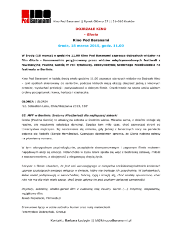 Kino Pod Baranami || Rynek Główny 27 || 31–010 Kraków DOJRZAŁE KINO - Gloria Kino Pod Baranami środa, 18 marca 2015, godz. 11.00 W środę (18 marca) o godzinie 11.00 Kino Pod Baranami zaprasza dojrzałych widzów na film Gloria - fenomenalnie przyjmowany przez widzów międzynarodowych festiwali z rewelacyjną Pauliną Garcíą w roli tytułowej, zdobywczynią Srebrnego Niedźwiedzia na festiwalu w Berlinie. Kino Pod Baranami w każdą środę około godziny 11.00 zaprasza starszych widzów na Dojrzałe Kino – cykl spotkań skierowany do seniorów, podczas których mają okazję obejrzeć jedną z kinowych premier, wysłuchać prelekcji i podyskutować o dobrym filmie. Oczekiwanie na seans umila widzom drobny poczęstunek: kawa, herbata i ciasteczka. GLORIA | GLORIA reż. Sebastián Lelio, Chile/Hiszpania 2013, 110’ 65. MFF w Berlinie: Srebrny Niedźwiedź dla najlepszej aktorki Gloria (Paulina García) to atrakcyjna kobieta w średnim wieku. Mieszka sama, z dziećmi widuje się rzadko, ale regularnie odwiedza dancingi. Spędza tam miło czas, choć zazwyczaj stroni od towarzystwa mężczyzn. Jej nastawienie się zmienia, gdy jednej z tanecznych nocy na parkiecie pojawia się Rodolfo (Sergio Hernández). Czarujący dżentelmen sprawia, że Gloria nabiera ochoty na płomienny romans. W tym wiarygodnym psychologicznie, przepięknie skomponowanym i zagranym filmie motorem napędowym akcji są emocje. Melancholia w życiu Glorii splata się więc z beztroską zabawą, miłość z rozczarowaniem, a obojętność z niegasnącą chęcią życia. Reżyser o filmie: Uważam, że jest coś wzruszającego w niespełna sześćdziesięcioletnich kobietach uparcie szukających swojego miejsca w świecie, który nie traktuje ich przychylnie. W bohaterkach, które nadal podśpiewują w samochodzie, tańczą, żyją i śmieją się, choć zostały opuszczone, choć nikt nie ma dla nich wiele czasu, choć życie upływa im pod znakiem bolesnej samotności. Dojrzały, subtelny, słodko-gorzki film z cudowną rolą Pauliny Garcii. (...) Intymny, niepozorny, wyjątkowy film. Jakub Popielecki, Filmweb.pl Brawurowo łączy w sobie subtelny humor oraz nutę melancholii. Przemysław Dobrzyński, Onet.pl Kontakt: Barbara Ładygin || [email protected] Kino Pod Baranami || Rynek Główny 27 || 31–010 Kraków Spotkania Dojrzałego Kina odbywają się co środę, w okolicach godziny 11.00. Uczestnicy cyklu prowadzą blog z recenzjami obejrzanych filmów: www.dojrzalekino.pl. Cykl zrealizowano przy wsparciu PISF. BILETY dla seniorów: tylko 12 zł Dojrzałe kino, jak dojrzałe wino – to pełnia smaku! PARTNERZY: Kontakt: Barbara Ładygin || [email protected]
