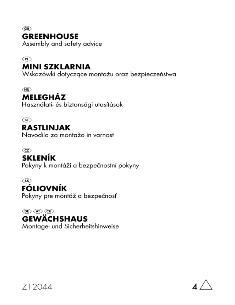 Greenhouse A ssembly and safety advice M ini szklarnia W skazówki dotyczące montażu oraz bezpieczeństwa M elegház H asználati- és biztonsági utasítások R astlinjak N avodila za montažo in varnost S kleník P okyny k montáži a bezpečnostní pokyny F óliovník P okyny pre montáž a bezpečnosť Gewächshaus M ontage- und Sicherheitshinweise Z12044 4 GB PL HU SI CZ SK DE / AT / CH Assembly and safety advice Wskazówki dotyczące montażu oraz bezpieczeństwa Használati- és biztonsági utasítások Navodila za montažo in varnost Pokyny k montáži a bezpečnostní pokyny Pokyny pre montáž a bezpečnosť Montage- und Sicherheitshinweise Page Strona Oldal Stran Strana Strana Seite 3 4 5 6 7 8 9 Greenhouse Q Introduction Familiarise yourself with the product prior to assembly. Carefully read the following assembly instructions and safety tips. Only use the product as instructed and only for the indicated field of application. Keep instructions in a safe place. Submit all documents to a third party if distributing the product. Q Proper Use This product is designed for cultivating plants under controlled conditions. Any use other than that described or any modification of the product is not permissible and may result in injury and/or damage to the product. The manufacturer is not liable for damage caused by improper use. The product is not intended for commercial use. Q 1 2 3 4 5 6 7 8 9 Q Description of Parts Connecting rod (gable) (approx. 73 cm) Connecting rod (roof) with taper (approx. 82 cm) Connecting rod (roof) without taper (approx. 82 cm) Connecting rod (roof slope) with hooks (approx. 95.5 cm) Connecting piece 1 Connecting piece 2 Connecting piece (roof) Earth spike Tarpaulin Dimensions and Material Dimensions: Material Connecting rods: Tarpaulin: Q approx. 180 x 94 x 140 cm (w x h x d) Metal Plastic Supply Scope Please check immediately on unpacking that the delivery is complete and that the product and all parts are in perfect condition. Do not under any circumstances assemble the product if the delivery is incomplete. 4 x Connecting rod (gable) (approx. 73 cm) 3 x Connecting rod (roof) with taper (approx. 82 cm) 3 x Connecting rod (roof) without taper (approx. 82 cm) 4 x Connecting rod (roof slope) with hooks (approx. 95.5 cm) 2 x Connecting piece 1 2 x Connecting piece 2 2 x Connecting piece (roof) 8 x Earth spike 1 x Tarpaulin 1 x Assembly instruction and have been assembled appropriately. Risk of injury exists if assembled incorrectly. Damaged parts can effect safety and function. m CAUTION! Do not leave children unattended. The product is not a climbing frame or toy. Make sure that nobody climbs or leans on the product, particularly children. The product could become imbalanced and tip up. This may result in injury and/or damage. J Make sure that the product is only assembled by competent persons. m CAUTION! RISK OF INJURY! Never under any circumstances assemble the product in a strong wind. J In heavy snow the product may collapse. Accumulated snow must be melted or shaken off periodically. J Make sure that you place the product on a solid, level surface and that it is firmly anchored in the ground. Failure to do this can result in injury and / or damage to the product. J Check regularly that all connections are intact and that the tarpaulin 9 is fitted securely. J Do not exert any pressure on the product. The product could become imbalanced and fall down. J CAUTION! RISK OF POISONING AND RISK OF DAMAGE TO PROPERTY! Never light a fire inside the product and always keep the product away from sources of heat. J Do not rely on the product as your shelter from extreme weather. Q Assembly j Assemble the product as shown in Figures A to C. Note: the window can be opened using the two side zippers. When the window is rolled up, it can be secured with the tapes at the top. Q Cleaning and Care j Clean the product with a dry, non-fluffing cloth. j Use a damp cloth and if necessary a mild detergent to remove more stubborn dirt. j Do not under any circumstances use abrasive or corrosive cleaning agents. Q Disposal The packaging is made entirely of recyclable materials, which you may dispose of at local recycling facilities. Contact your local refuse disposal authority for more details of how to dispose of your worn-out product. Product Description Greenhouse Model No.: Z12044 Version: 10/2010 Safety advice J Warning! RISK OF LOSS OF LIFE OR ACCIDENT TO INFANTS AND CHILDREN! Never leave children unsupervised with the packaging material or the product. The packaging material presents a suffocation hazard and there is a risk of loss of life from strangulation. Children often underestimate danger. Always keep the product out of reach of children. m CAUTION! RISK OF INJURY! Ensure that all parts are undamaged ® GB 3 Mini szklarnia Wstęp Q Przed rozpoczęciem montażu należy zapoznać się z produktem. W tym celu należy uważnie przeczytać instrukcję montażu i wskazówki dot. bezpieczeństwa. Produkt używać wyłącznie zgodnie z jego poniżej opisanym przeznaczeniem. Prosimy o zachowanie instrukcji io jej dobre przechowywanie. W przypadku przekazania produktu w ręce osoby trzeciej, prosimy o przekazanie także wszystkich należących do produktu instrukcji i innych dokumentów. Q Użycie zgodne z przeznaczeniem Produkt ten jest przeznaczony do kontrolowanego uprawiania roślin. Użycie inne niż wyżej opisane lub dokonywanie zmian produktu nie jest dozwolone i może prowadzić do jego uszkodzenia. Producent nie ponosi odpowiedzialności za szkody powstałe wskutek użycia produktu niezgodnego z jego przeznaczeniem. Produkt nie jest przeznaczony do użytku komercyjnego. Q 1 2 3 4 5 6 7 8 9 Q Opis części Drążek łączący (szczyt) (ok. 73 cm) Drążek łączący (dach) ze zwężeniem (ok. 82 cm) Drążek łączący (dach) bez zwężenia (ok. 82 cm) Drążek łączący (skos dachu) z hakiem (ok. 95,5 cm) Łącznik 1 Łącznik 2 Łącznik (dach) Kotwiczki Plandeka 