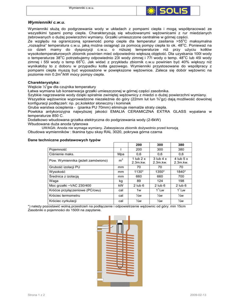 Wymienniki c.w.u. Wymienniki c.w.u. Wymienniki słuŜą do podgrzewania wody w układach z pompami ciepła i mogą współpracować ze wszystkimi typami pomp ciepła. Charakteryzują się wbudowanymi węŜownicami z rur miedzianych Ŝebrowanych o duŜej powierzchni wymiany. Grzałki umieszczone centralnie w górnej części. o Ze względu na ograniczoną sprawność pomp ciepła dla temperatur zasilania >55 C maksymalna o „rozsądna” temperatura c.w.u. jaką moŜna osiągnąć za pomocą pompy ciepła to ok. 48 C. PoniewaŜ na co dzień mamy do dyspozycji c.w.u. o niŜszej temperaturze niŜ przy uŜyciu kotłów wysokotemperaturowych zbiornik powinien mieć odpowiednio większą objętość. Dla uzyskania 100l wody o o o temperaturze 38 C potrzebujemy odpowiednio 23l wody zimnej i 77l wody o temp. 48 C lub 45l wody o zimnej i 55l wody o temp 65 C. Jak widać z przykładu zbiornik c.w.u powinien być 40% większy niŜ wynikałoby to z doboru w przypadku kotła gazowego. Wymienniki przystosowane do współpracy z pompami ciepła muszą być wyposaŜone w powiększone węŜownice. Zaleca się dobór węŜownic na 2 poziomie min 0.2m /kW mocy pompy ciepła. Charekterystyka: Wejście ½”gw dla czujnika temperatury Łatwa wymiana lub konserwacja grzałki umieszczonej w górnej części zasobnika. Szybkie nagrzewanie wody dzięki spiralnie zwiniętej węŜownicy z miedzi o duŜej powierzchni wymiany. Wszystkie węŜownice wyprowadzone niezaleŜnie do góry (22mm lut lun ¾”gz) dają moŜliwość dowolnej konfiguracji podłączeń: np. pc,kolektor słoneczny i kominek Gruba warstwa ocieplenia - (pianka PU 70mm) eliminuje niemalŜe straty ciepła. Powłoka antykorozyjna najwyŜszej jakości EMALIA CERAMICZNA EXTRA GLASS wypalana w temperaturze 850 C. Dodatkowo wbudowana grzałka elektryczna do podgrzewania wody (2-6kW) Wbudowana duŜa anoda tytanowa UWAGA: Anoda nie wymaga wymiany. Zabezpiecza zbiornik doŜywotnio przed korozją Obudowa wymienników : tkanina typu skay RAL 3020, pokrywa górna czarna Dane techniczne podstawowych typów Pow. Wymiennika (jeŜeli zamówiono) m Grubość izolacji PU Wysokość Średnica z izolacją Waga Moc grzałki ~VAC 230/400 Króćce przyłączeniowe (PC/cwu) mm mm mm kg kW cal 200 200 0,6 1 lub 2 x 2.3m.kw. 70 1130* 660 89 2 lub 6 1w Króciec termometru cal ½w ½w ½w Króciec cyrkulacji cal ½w ½w ½w Pojemność Ciśnienie maks. l Mpa 2 300 300 0,6 3 lub 4 x 2.3m.kw. 70 1350* 660 124 2 lub 6 1 1 /4 w 380 380 0,6 4 lub 5 x 2.3m.kw. 70 1840* 700 198 2 lub 6 1 1 /4 w *) naleŜy pozostawić wolną przestrzeń na podłączenie i odpowietrzenie węŜownic od góry: min 15cm Zasobniki o pojemności do 1500l na zapytanie. Strona 1 z 2 2009-02-13 Wymienniki c.w.u. Zbiorniki buforowe Zbiorniki buforowe pełnią rolę sprzęgła hydraulicznego i bufora (akumulatora) zarazem. Zbiornik buforowy pełni kilka zadań: • • • • rozdziela przepływy objętościowe obiegu pompy ciepła gdzie wymagane jest utrzymanie róŜnicy o temperatur na poziomie 5-7 C i obiegu grzewczego gdzie róŜnica temperatur moŜe wahać się od 7 o do 15 C. zezwala na buforowanie energii w okresach gdy energia elektryczna jest tańsza (taryfa nocna) eliminuje częste włączanie i wyłączanie się spręŜarek pomp ciepła w okresach niskiego zapotrzebowania w energię cieplną zwiększając trwałość wszystkich jej elementów zabezpiecza pompę ciepła przed nadmierną temperaturą powrotu wody w układach biwalentnych Charekterystyka: Wejście ½”gw dla czujnika temperatury Wejście w najwyŜszym punkcie zbiornika ½”gw dla odpowietrznika Łatwa wymiana lub konserwacja grzałki - (flansza mocowana na 6 śrub). Gruba warstwa ocieplenia - (pianka PU 70mm) eliminuje straty ciepła. Powłoka antykorozyjna najwyŜszej jakości EMALIA CERAMICZNA EXTRA GLASS wypalana w o temperaturze 850 C. Dodatkowo wbudowana grzałka elektryczna do podgrzewania wody (2-9kW) umieszczona w górnej części zbiornika. Dane techniczne podstawowych typów: Zalecany zakres mocy PC Pojemność Króćce przyłączeniowe Króciec termometru Króciec odpowietrznika Grubość izolacji PU Wysokość Średnica z izolacją Zasilanie grzałki Moc dodatkowej grzałki kW l cal cal cal mm mm mm V kW 140 200 300 400 16 140 1” ½ ½ 70 1280 510 1~230V 3~400V 2-6 do 20 200 1 1/4 ½ ½ 70 1130 660 1~230V 3~400V 2-6-9 do 32 300 1½ ½ ½ 70 1350 660 1~230V 3~400V 6-9 do 44 380 2 ½ ½ 70 1840 700 1~230V 3~400V 9-12 * ) dopuszcza się zwiększenie mocy podanej o 20% dla układów o zwiększonej pojemności wodnej (np. ogrz. podłogowe) Jeśli system będzie pracował w systemie zasilania dwutaryfowego zaleca się dobór większego zbiornika buforowego niŜ to wynika z powyŜszej tabeli o co najmniej jedną wielkość. W okresach grzewczych pozwoli to na akumulację energii w przedziałach tańszej energii elektrycznej (funkcja sterownika). Strona 2 z 2 2009-02-13