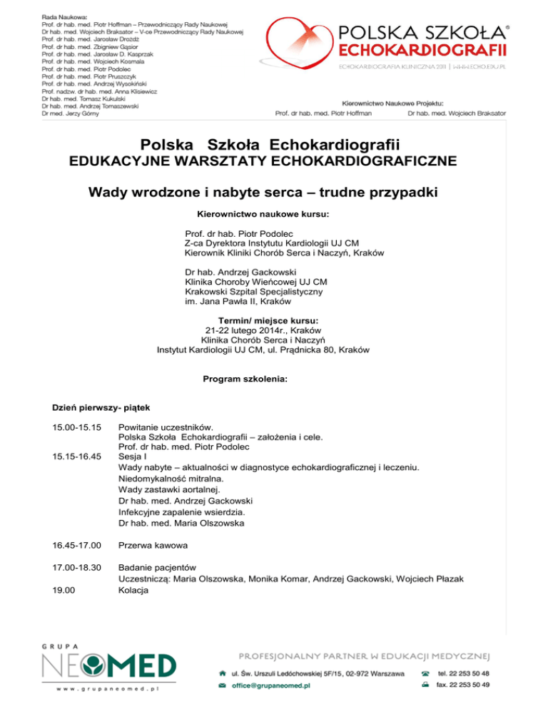 Polska Szkoła Echokardiografii EDUKACYJNE WARSZTATY ECHOKARDIOGRAFICZNE Wady wrodzone i nabyte serca – trudne przypadki Kierownictwo naukowe kursu: Prof. dr hab. Piotr Podolec Z-ca Dyrektora Instytutu Kardiologii UJ CM Kierownik Kliniki Chorób Serca i Naczyń, Kraków Dr hab. Andrzej Gackowski Klinika Choroby Wieńcowej UJ CM Krakowski Szpital Specjalistyczny im. Jana Pawła II, Kraków Termin/ miejsce kursu: 21-22 lutego 2014r., Kraków Klinika Chorób Serca i Naczyń Instytut Kardiologii UJ CM, ul. Prądnicka 80, Kraków Program szkolenia: Dzień pierwszy- piątek 15.00-15.15 15.15-16.45 Powitanie uczestników. Polska Szkoła Echokardiografii – założenia i cele. Prof. dr hab. med. Piotr Podolec Sesja I Wady nabyte – aktualności w diagnostyce echokardiograficznej i leczeniu. Niedomykalność mitralna. Wady zastawki aortalnej. Dr hab. med. Andrzej Gackowski Infekcyjne zapalenie wsierdzia. Dr hab. med. Maria Olszowska 16.45-17.00 Przerwa kawowa 17.00-18.30 Badanie pacjentów Uczestniczą: Maria Olszowska, Monika Komar, Andrzej Gackowski, Wojciech Płazak Kolacja 19.00 Dzień drugi - sobota 9.00-10.30 Sesja II. Wady wrodzone – anatomia, diagnostyka, postępowanie. ASD/PFO. Prof. dr hab. med. Piotr Podolec VSD/PDA. Anomalia Ebsteina. Dr med. Monika Komar Ocena prawej komory. Dr hab. med. Wojciech Płazak 10.30-10.45 Przerwa kawowa 10.45-12.15 Badanie pacjentów Uczestniczą: Lidia Tomkiewicz-Pająk, Monika Komar, Andrzej Gackowski, Wojciech Płazak Przerwa kawowa 12.15-12.30 12.30-14.00 Badanie pacjentów Uczestniczą: Lidia Tomkiewicz-Pająk, Monika Komar, Andrzej Gackowski, Wojciech Płazak 14.00-15.00 Lunch 15.00-16:20 Sesja III. Wady wrodzone – anatomia, diagnostyka, postępowanie. TOF. l-TGA, d-TGA. Pacjenci po operacji Fontana. Ciąża u pacjentów z wadami wrodzonymi serca. Dr med. Lidia Tomkiewicz-Pająk 16.20-17.00 Quiz podsumowujący warsztaty. 17.00 Zakończenie warsztatu, rozdanie certyfikatów. *Przypadki kliniczne obejmują m.in. problemy echokardiograficzne egzaminu specjalizacyjnego z kardiologii *Organizator zastrzega sobie prawo do zmiany programu.