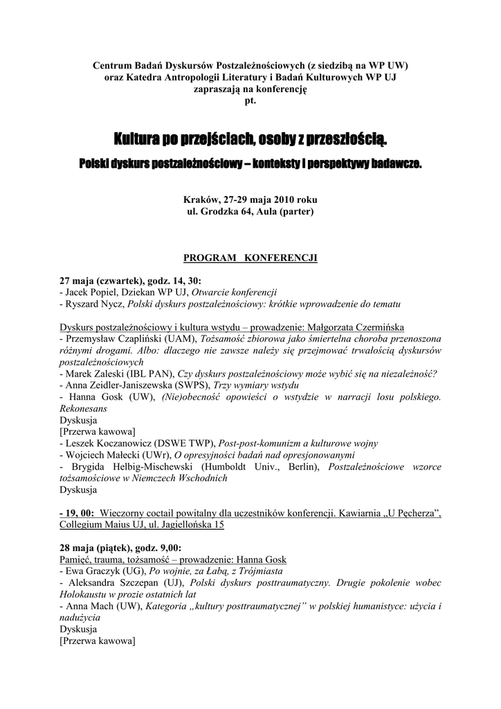 Centrum Badań Dyskursów Postzależnościowych (z siedzibą na WP UW) oraz Katedra Antropologii Literatury i Badań Kulturowych WP UJ zapraszają na konferencję pt. Kultura po przejściach, osoby z przeszłością. Polski dyskurs postzależnościowy – konteksty i perspektywy badawcze. Kraków, 27-29 maja 2010 roku ul. Grodzka 64, Aula (parter) PROGRAM KONFERENCJI 27 maja (czwartek), godz. 14, 30: - Jacek Popiel, Dziekan WP UJ, Otwarcie konferencji - Ryszard Nycz, Polski dyskurs postzależnościowy: krótkie wprowadzenie do tematu Dyskurs postzależnościowy i kultura wstydu – prowadzenie: Małgorzata Czermińska - Przemysław Czapliński (UAM), Tożsamość zbiorowa jako śmiertelna choroba przenoszona różnymi drogami. Albo: dlaczego nie zawsze należy się przejmować trwałością dyskursów postzależnościowych - Marek Zaleski (IBL PAN), Czy dyskurs postzależnościowy może wybić się na niezależność? - Anna Zeidler-Janiszewska (SWPS), Trzy wymiary wstydu - Hanna Gosk (UW), (Nie)obecność opowieści o wstydzie w narracji losu polskiego. Rekonesans Dyskusja [Przerwa kawowa] - Leszek Koczanowicz (DSWE TWP), Post-post-komunizm a kulturowe wojny - Wojciech Małecki (UWr), O opresyjności badań nad opresjonowanymi - Brygida Helbig-Mischewski (Humboldt Univ., Berlin), Postzależnościowe wzorce tożsamościowe w Niemczech Wschodnich Dyskusja - 19, 00: Wieczorny coctail powitalny dla uczestników konferencji. Kawiarnia „U Pęcherza”, Collegium Maius UJ, ul. Jagiellońska 15 28 maja (piątek), godz. 9,00: Pamięć, trauma, tożsamość – prowadzenie: Hanna Gosk - Ewa Graczyk (UG), Po wojnie, za Łabą, z Trójmiasta - Aleksandra Szczepan (UJ), Polski dyskurs posttraumatyczny. Drugie pokolenie wobec Holokaustu w prozie ostatnich lat - Anna Mach (UW), Kategoria „kultury posttraumatycznej” w polskiej humanistyce: użycia i nadużycia Dyskusja [Przerwa kawowa] - Bartosz Dąbrowski (UG), Postpamięć, lokalność i trauma. Formy postzależności w literaturze najnowszej - Justyna Tabaszewska (UJ), Miejsce zależności. Podmiot pozbawiony miejsca – postawy i strategie tożsamościowe - Monika Żółkoś (UG), Tworzenie pamięci. Intymistyka Ewy Kuryluk Dyskusja 28 maja (piątek), godz. 15,00: Dominacja, gender, uzależnienie – prowadzenie: Ewa Kraskowska - Małgorzata Czermińska (UG), O dwuznaczności bycia ofiarą - Bożena Karwowska (British Columbia Univ.), „Kult ofiary” w oczach polskich pisarekemigrantek a „kult ocaleńca” w refleksji krytycznej na temat dyskursów wyzwoleńczych - Inga Iwasiów (USz), Feminizm jako wyłom w murze kultury głównego nurtu. Plan budowy. Dyskusja [Przerwa kawowa] - Arleta Galant (USz), Polskie konteksty „teorii umiejscowienia”. Przykład autobiografii - Marcin Filipowicz (UW/Hradec Kralove Univ.), Wzorce męskości podporządkowanych grup etnicznych na obszarze Europy Środkowej w II poł. XIX w. Przykład czeskiego wszczepiania subwersji wobec praktyk dyscyplinujących jako możliwa inspiracja dla badania kultury polskiej - Piotr Krupiński (USz), „W objęciach kapo”. Obóz koncentracyjny w twórczości Mariana Pankowskiego jako labirynt pożądania Dyskusja 29 maja (sobota), godz. 9,00: Postkolonialna Europa (w tym Polska) – prowadzenie: Inga Iwasiów - Janusz Korek (Stockholm Univ.), Europa Środkowo-Wschodnia w perspektywie postkolonialnej - Bogusław Bakuła (UAM), Studia postkolonialne w Europie Środkowej i Wschodniej. Kwerenda wybranych problemów - Grażyna Borkowska (IBL PAN), Badania postkolonialne na gruncie polskim – pytania sceptyka Dyskusja [Przerwa kawowa] - Dorota Kołodziejczyk (UWr), Postkolonialny transfer w badaniach nad dyskursami postzależnościowymi – kreowanie przestrzeni porównawczej - Eugenia Prokop-Janiec (UJ), Żydzi i Europa. Dyskursy i kontrdyskursy - Paweł Wolski (USz), Razem osobno. Polska literatura powojenna skolonializowana przez kanon emancypacyjny (na przykładzie „Literatury Europy. Historii literatur europejskich”) Dyskusja 29 maja (sobota) godz. 15, 00: Historia i władza – prowadzenie: Dorota Kołodziejczyk - Ewa Kraskowska (UAM), Po zaborach i po PRL-u: postzależnościowe niewspółmierności - Łukasz Pawłowski (UW), O ustanowieniu władzy nad rzeczywistością po zaborach w „Generale Barczu” Juliusza Kadena-Bandrowskiego. Dwie interpretacje - Aleksander Fiut (UJ), Oblicza tyranii. Wokół tryptyku Jacka Bocheńskiego „Boski Juliusz”, „Nazo poeta”, „Tyberiusz Cezar” Dyskusja [Przerwa kawowa] - Andrzej Zieniewicz (UW), Przyległość zdań do materii historycznej. Doświadczenie zintegrowania i niezintegrowania w prozie ostatniej dekady PRL-u - Maria Kobielska (UJ), „Stan wojenny trzeba zrobić” (Jacek Dukaj) – literackie strategie i ich rezultaty - Paulina Małochleb (UJ), Imperium odchodzi – Rosja w literaturze polskiej po 1989 roku Dyskusja - Zakończenie konferencji *** Zespół organizacyjny konferencji: Anna Jarmuszkiewicz ( [email protected] ), Maria Kobielska ( [email protected] ), Ryszard Nycz ( [email protected] ), Justyna Tabaszewska ( [email protected] ). Konferencyjny adres kontaktowy: [email protected]