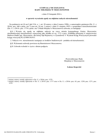 UCHWAŁA NR XXIX/219/16 RADY MIEJSKIEJ W MSZCZONOWIE z dnia 23 listopada 2016 r. w sprawie wyrażenia zgody na odpłatne nabycie nieruchomości Na podstawie art.18 ust.2 pkt 9 lit. a i art. 58 ustawy z dnia 8 marca 1990r. o samorządzie gminnym (Dz. U. z 2016r. poz. 446 z późn. zm.1)) oraz art. 24 ust. 3 ustawy z dnia 21 sierpnia 1997r. o gospodarce nieruchomościami (Dz. U. z 2015r. poz. 1774 z późn. zm.2)) Rada Miejska w Mszczonowie uchwala, co następuje: § 1. 1. Wyraża się zgodę na odpłatne nabycie na rzecz mienia komunalnego Gminy Mszczonów niezabudowanej nieruchomości oznaczonej jako działka nr ew. 17/2 o pow. 0,0400ha położonej w miejscowości Badowo-Dańki gm. Mszczonów, dla której Sąd Rejonowy w Żyrardowie V Wydział Ksiąg Wieczystych prowadzi księgę wieczystą PL1Z/00015634/3. 2. Nabycie ww. nieruchomości następuje ze środków budżetowych - podatku od nieruchomości. § 2. Wykonanie uchwały powierza się Burmistrzowi Mszczonowa. § 3. Uchwała wchodzi w życie z dniem podjęcia. Przewodniczący Rady Miejskiej w Mszczonowie Łukasz Koperski 1) zmiany 2) zmiany ustawy zostały ogłoszone w Dz. U. z 2016r. poz. 1579 ustawy zostały ogłoszone w Dz. U. z 2015r. poz. 1777 oraz w Dz. U. z 2016r. poz. 65, poz. 1250, poz. 1271, poz. 1579 Id: 89443C03-9AAB-4358-A44E-3506C4F5A73C. Uchwalony Strona 1
