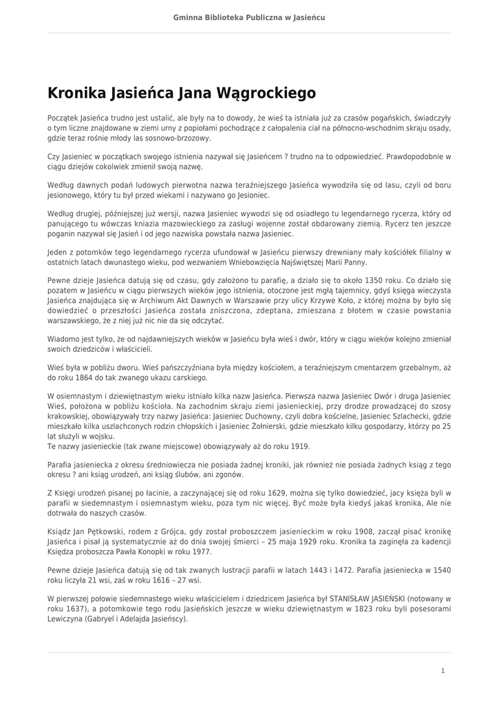 Gminna Biblioteka Publiczna w Jasieńcu Kronika Jasieńca Jana Wągrockiego Początek Jasieńca trudno jest ustalić, ale były na to dowody, że wieś ta istniała już za czasów pogańskich, świadczyły o tym liczne znajdowane w ziemi urny z popiołami pochodzące z całopalenia ciał na północno-wschodnim skraju osady, gdzie teraz rośnie młody las sosnowo-brzozowy. Czy Jasieniec w początkach swojego istnienia nazywał się Jasieńcem ? trudno na to odpowiedzieć. Prawdopodobnie w ciągu dziejów cokolwiek zmienił swoją nazwę. Według dawnych podań ludowych pierwotna nazwa teraźniejszego Jasieńca wywodziła się od lasu, czyli od boru jesionowego, który tu był przed wiekami i nazywano go Jesioniec. Według drugiej, późniejszej już wersji, nazwa Jasieniec wywodzi się od osiadłego tu legendarnego rycerza, który od panującego tu wówczas kniazia mazowieckiego za zasługi wojenne został obdarowany ziemią. Rycerz ten jeszcze poganin nazywał się Jasień i od jego nazwiska powstała nazwa Jasieniec. Jeden z potomków tego legendarnego rycerza ufundował w Jasieńcu pierwszy drewniany mały kościółek filialny w ostatnich latach dwunastego wieku, pod wezwaniem Wniebowzięcia Najświętszej Marii Panny. Pewne dzieje Jasieńca datują się od czasu, gdy założono tu parafię, a działo się to około 1350 roku. Co działo się pozatem w Jasieńcu w ciągu pierwszych wieków jego istnienia, otoczone jest mgłą tajemnicy, gdyś księga wieczysta Jasieńca znajdująca się w Archiwum Akt Dawnych w Warszawie przy ulicy Krzywe Koło, z której można by było się dowiedzieć o przeszłości Jasieńca została zniszczona, zdeptana, zmieszana z błotem w czasie powstania warszawskiego, że z niej już nic nie da się odczytać. Wiadomo jest tylko, że od najdawniejszych wieków w Jasieńcu była wieś i dwór, który w ciągu wieków kolejno zmieniał swoich dziedziców i właścicieli. Wieś była w pobliżu dworu. Wieś pańszczyźniana była między kościołem, a teraźniejszym cmentarzem grzebalnym, aż do roku 1864 do tak zwanego ukazu carskiego. W osiemnastym i dziewiętnastym wieku istniało kilka nazw Jasieńca. Pierwsza nazwa Jasieniec Dwór i druga Jasieniec Wieś, położona w pobliżu kościoła. Na zachodnim skraju ziemi jasienieckiej, przy drodze prowadzącej do szosy krakowskiej, obowiązywały trzy nazwy Jasieńca: Jasieniec Duchowny, czyli dobra kościelne, Jasieniec Szlachecki, gdzie mieszkało kilka uszlachconych rodzin chłopskich i Jasieniec Żołnierski, gdzie mieszkało kilku gospodarzy, którzy po 25 lat służyli w wojsku. Te nazwy jasienieckie (tak zwane miejscowe) obowiązywały aż do roku 1919. Parafia jasieniecka z okresu średniowiecza nie posiada żadnej kroniki, jak również nie posiada żadnych ksiąg z tego okresu ? ani ksiąg urodzeń, ani ksiąg ślubów, ani zgonów. Z Księgi urodzeń pisanej po łacinie, a zaczynającej się od roku 1629, można się tylko dowiedzieć, jacy księża byli w parafii w siedemnastym i osiemnastym wieku, poza tym nic więcej. Być może była kiedyś jakaś kronika, Ale nie dotrwała do naszych czasów. Ksiądz Jan Pętkowski, rodem z Grójca, gdy został proboszczem jasienieckim w roku 1908, zaczął pisać kronikę Jasieńca i pisał ją systematycznie aż do dnia swojej śmierci – 25 maja 1929 roku. Kronika ta zaginęła za kadencji Księdza proboszcza Pawła Konopki w roku 1977. Pewne dzieje Jasieńca datują się od tak zwanych lustracji parafii w latach 1443 i 1472. Parafia jasieniecka w 1540 roku liczyła 21 wsi, zaś w roku 1616 – 27 wsi. W pierwszej połowie siedemnastego wieku właścicielem i dziedzicem Jasieńca był STANISŁAW JASIEŃSKI (notowany w roku 1637), a potomkowie tego rodu Jasieńskich jeszcze w wieku dziewiętnastym w 1823 roku byli posesorami Lewiczyna (Gabryel i Adelajda Jasieńscy). 1 Gminna Biblioteka Publiczna w Jasieńcu Prawdopodobnie obowiązywała wówczas inna pisownia, bo w księdze Cudów i Łask Najśw. Marii Panny z Lewiczyna jest notatka z siedemnastego wieku, że doznał tam łaski w Lewiczynie Ksiądz Obrąbalski, proboszcz jasieński. W roku 1656, 7 kwietnia, w czasie tak zwanego potopu szwedzkiego, po bitwie w okolicy Warki, gdzie wojska polskie pod dowództwem hetmana Stefana Czarnieckiego rozgromiły armię szwedzką, wycofujący się na zachód Szwedzi spalili wtedy drugi już kościół drewniany w Jasieńcu. Wiadomość tę potwierdził ksiądz arcybiskup Aleksander Kakowski, metropolita warszawski, gdy był na wizytacji parafii jasienieckiej w Zielone Świątki 1918 roku. Po wojnie szwedzkiej w miejscu spalonego kościoła zbudowano tymczasową kaplicę, która przetrwała dziewięćdziesiąt osiem lat, aż do roku 1754. W roku 1683 w czasie odsieczy wiedeńskiej parafianin jasieniecki, Władysław Grzegorzewski, jako młody osiemnastoletni ochotnik pojechał na wojnę z artylerią polską przeciwko Turkom oblegającym Wiedeń, stolicę Austrii i tak dzielnie walczył z Turkami, że Król Jan III Sobieski za zasługi wojenne mianował go kapitanem artylerii. W roku 1983 w trzechsetną rocznicę odsieczy wiedeńskiej bardzo uroczyście obchodzonej w Krakowie, do Jasieńca przybyła delegacja profesorów krakowskich i wypożyczyli na mającą się tam odbyć wystawę jedyny w Polsce portret Władysława Grzegorzewskiego. Po przeszło dwu latach portret zwrócono, a w nagrodę za wypożyczenie Jasieniec został obdarowany obrazem panoramy odsieczy wiedeńskiej., W roku 1727 Władysław Grzegorzewski, właściciel trzech wielkich dworów w parafii jasienieckiej – Częstoniewa, Falencina i Dużej Zbroszy – postanowił ufundować w Jasieńcu nowy murowany kościół i w tym celu sprowadził do Jasieńca i przygotował odpowiednią ilość wapna do zaplanowanej budowy świątyni. (Wtedy jeszcze nie znano cementu). W roku 1736 Władysław Grzegorzewski wówczas już generał major gwardii królewskiej Augusta III Sasa i kasztelan ciechanowski ufundował