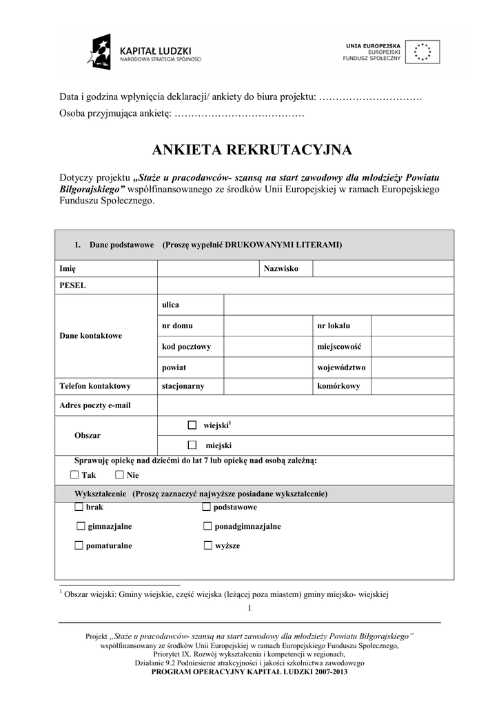 Data i godzina wpłynięcia deklaracji/ ankiety do biura projektu: …………………………. Osoba przyjmująca ankietę: ………………………………… ANKIETA REKRUTACYJNA Dotyczy projektu „Staże u pracodawców- szansą na start zawodowy dla młodzieży Powiatu Biłgorajskiego” współfinansowanego ze środków Unii Europejskiej w ramach Europejskiego Funduszu Społecznego. 1. Dane podstawowe (Proszę wypełnić DRUKOWANYMI LITERAMI) Imię Nazwisko PESEL ulica nr domu nr lokalu kod pocztowy miejscowość powiat województwo stacjonarny komórkowy Dane kontaktowe Telefon kontaktowy Adres poczty e-mail wiejski1 Obszar miejski Sprawuję opiekę nad dziećmi do lat 7 lub opiekę nad osobą zależną: Tak Nie Wykształcenie (Proszę zaznaczyć najwyższe posiadane wykształcenie) 1 brak podstawowe gimnazjalne ponadgimnazjalne pomaturalne wyższe Obszar wiejski: Gminy wiejskie, część wiejska (leżącej poza miastem) gminy miejsko- wiejskiej 1 Projekt „Staże u pracodawców- szansą na start zawodowy dla młodzieży Powiatu Biłgorajskiego” współfinansowany ze środków Unii Europejskiej w ramach Europejskiego Funduszu Społecznego, Priorytet IX. Rozwój wykształcenia i kompetencji w regionach, Działanie 9.2 Podniesienie atrakcyjności i jakości szkolnictwa zawodowego PROGRAM OPERACYJNY KAPITAŁ LUDZKI 2007-2013 2. Status, kryteria kwalifikacyjne 1. Jestem uczniem: ……………………………………………………………………………………………………………………………………………… (Podaj nazwę szkoły lub zespołu szkół zawód w jakim się kształcisz) 2. Pochodzę z rodziny o niskich dochodach2 Tak Nie (jeśli TAK to dołącz do ankiety oświadczenie o dochodach) 3. Mam ukończone 18 lat Tak Nie 4. Jestem uczniem klasy: ……………………………………………………………………………………………………………………………………………. (Podaj nazwę klasy i zawód w jakim się kształcisz) 5. Przedmioty punktowane dla mojej klasy i otrzymane oceny na koniec ubiegłego roku szkolnego: 1……………………………………………………………………………………………………… (Podaj nazwę pierwszego przedmiotu punktowanego) …………………………. (ocena z przedmiotu 1) 2………………………………………………………………………………………………………. (Podaj nazwę drugiego przedmiotu punktowanego) …………………………. (ocena z przedmiotu 2) 6. Moja średnia ocen z dwóch punktowanych przedmiotów wynosi: 3. …………………………………………………….. (średnia z dokładnością do 2 miejsc po przecinku) Preferowane szkolenie Chciałbym/chciałabym uczestniczyć w: Stażach zawodowych realizowanych u pracodawców. 4. Źródło informacji o projekcie z ogłoszenia w mediach z plakatu, ulotki informacyjnej Skąd dowiedział/a się Pan/i o projekcie? z Internetu ze strony internetowej RCEZ w Biłgoraju od znajomych od nauczyciela inne źródła, jakie? ………………………………………….. 2 Uczniowie z rodzin, których miesięczny dochód netto przypadający na jednego członka rodziny wyliczony jako średnia z ostatnich trzech miesięcy jest nie wyższy niż 539,00 zł 2 Projekt „Staże u pracodawców- szansą na start zawodowy dla młodzieży Powiatu Biłgorajskiego” współfinansowany ze środków Unii Europejskiej w ramach Europejskiego Funduszu Społecznego, Priorytet IX. Rozwój wykształcenia i kompetencji w regionach, Działanie 9.2 Podniesienie atrakcyjności i jakości szkolnictwa zawodowego PROGRAM OPERACYJNY KAPITAŁ LUDZKI 2007-2013 5. 1. 2. 3. 4. 5. Oświadczenia Oświadczam, że: Zapoznałem/łam się z Regulaminem projektu „Staże u pracodawców- szansą na start zawodowy dla młodzieży Powiatu Biłgorajskiego” i akceptuję jego warunki. Zgodnie z wymogami jestem uprawniony do uczestnictwa w projekcie. Zostałem/łam poinformowany/a, że projekt współfinansowany jest ze środków Unii Europejskiej w ramach Europejskiego Funduszu Społecznego. Jestem świadomy/a, że złożenie Ankiety Rekrutacyjnej nie jest równoznaczne z zakwalifikowaniem do udziału w projekcie. Mam świadomość, że Staż może odbywać się w miejscowości innej od mojego miejsca zamieszkania. W związku z przystąpieniem do projektu: Wyrażam dobrowolną zgodę na gromadzenie, przetwarzanie i przekazywanie moich danych osobowych zawartych w niniejszym formularzu (zgodnie z Ustawą z dnia 29 sierpnia 1997 r. o ochronie danych osobowych Dz. U. z 2002 r. Nr 101 poz. 926, ze zm.), do celów związanych z przeprowadzeniem szkolenia, monitoringu i ewaluacji projektu, a także w zakresie niezbędnym do wywiązania się Beneficjenta projektu z obowiązków sprawozdawczych wobec Instytucji Zarządzającej tj Departament Zaradzania Europejskim Funduszem Społecznym w Ministerstwie Rozwoju Regionalnego. Moja zgoda obejmuje również przetwarzanie danych o których mowa w punkcie a) w przyszłości, pod warunkiem, że nie zostanie zmieniony cel przetwarzania. b) Wyrażam dobrowolnie zgodę na przetwarzanie moich danych osobowych, obejmujących informacje wymienione w punkcie a) przez Instytucję Zarządzającą lub podmiot przez niego upoważniony do celów sprawozdawczych z realizacji usługi szkolenia, w której brałem udział oraz monitoringu i ewaluacji projektu. c) Oświadczam, że zostałem poinformowany o prawie dostępu do treści swoich danych osobowych oraz ich poprawiania, przetwarzanych przez Beneficjenta projektu oraz Instytucję Zarządzającą. a) Oświadczam, iż przyjmuję do wiadomości, że podanie danych jest dobrowolne, aczkolwiek odmowa ich podania jest równoznaczna z brakiem możliwości udzielenia wsparcia w ramach projektu. Uprzedzony/a o odpowiedzialności karnej z art. 233 Kodeksu Karnego za złożenie nieprawdziwego oświadczenia lub zatajenie
