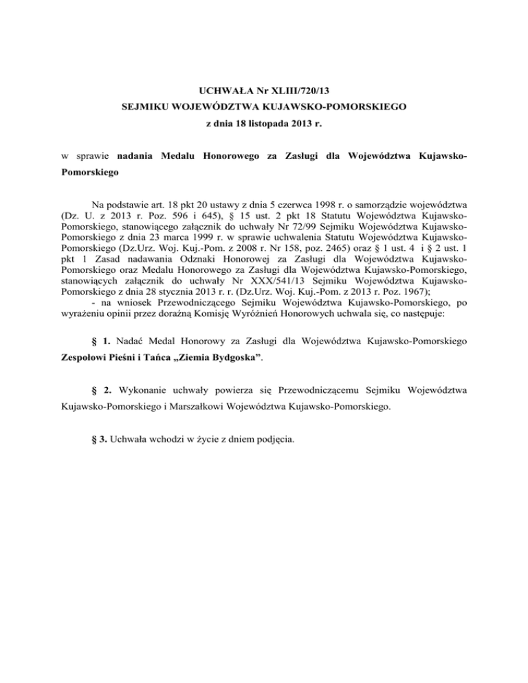 UCHWAŁA Nr XLIII/720/13 SEJMIKU WOJEWÓDZTWA KUJAWSKO-POMORSKIEGO z dnia 18 listopada 2013 r. w sprawie nadania Medalu Honorowego za Zasługi dla Województwa KujawskoPomorskiego Na podstawie art. 18 pkt 20 ustawy z dnia 5 czerwca 1998 r. o samorządzie województwa (Dz. U. z 2013 r. Poz. 596 i 645), § 15 ust. 2 pkt 18 Statutu Województwa KujawskoPomorskiego, stanowiącego załącznik do uchwały Nr 72/99 Sejmiku Województwa KujawskoPomorskiego z dnia 23 marca 1999 r. w sprawie uchwalenia Statutu Województwa KujawskoPomorskiego (Dz.Urz. Woj. Kuj.-Pom. z 2008 r. Nr 158, poz. 2465) oraz § 1 ust. 4 i § 2 ust. 1 pkt 1 Zasad nadawania Odznaki Honorowej za Zasługi dla Województwa KujawskoPomorskiego oraz Medalu Honorowego za Zasługi dla Województwa Kujawsko-Pomorskiego, stanowiących załącznik do uchwały Nr XXX/541/13 Sejmiku Województwa KujawskoPomorskiego z dnia 28 stycznia 2013 r. r. (Dz.Urz. Woj. Kuj.-Pom. z 2013 r. Poz. 1967); - na wniosek Przewodniczącego Sejmiku Województwa Kujawsko-Pomorskiego, po wyrażeniu opinii przez doraźną Komisję Wyróżnień Honorowych uchwala się, co następuje: § 1. Nadać Medal Honorowy za Zasługi dla Województwa Kujawsko-Pomorskiego Zespołowi Pieśni i Tańca „Ziemia Bydgoska”. § 2. Wykonanie uchwały powierza się Przewodniczącemu Sejmiku Województwa Kujawsko-Pomorskiego i Marszałkowi Województwa Kujawsko-Pomorskiego. § 3. Uchwała wchodzi w życie z dniem podjęcia. UZASADNIENIE W roku bieżącym Zespół Pieśni i Tańca „Ziemia Bydgoska” obchodzi 55-lecie działalności. Zespół został utworzony w 1958 r. w oparciu o istniejący przy Filharmonii Pomorskiej Chór Chłopięcy. Do młodych śpiewaków dokooptowano 20-osobową orkiestrę i 30-osobowy balet. Pod koniec 1958 r. zespół otrzymał status stowarzyszenia kulturalnego, którego prezesem został inż. Edmund Gorzaniak. Zespół przez lata był zagraniczną wizytówką bydgoskiej kultury, lecz nie mógł dorobić się własnej siedziby i przez 25 lat miejscem jego prób była sala gimnastyczna Szkoły Podstawowej nr 24 przy ul. Kruszwickiej. Począwszy od lat 60. zespół wyjeżdżał regularnie na występy zagraniczne. Uczestniczył we wszystkich ważniejszych przeglądach folklorystycznych w niemal całej Europie. Występował m.in. w Monako, parlamencie duńskim, Niemczech, Hiszpanii, we Włoszech, Francji i na Litwie. Jego spektakle transmitowały stacje telewizyjne polskie i zagraniczne. Przez Zespół przewinęły się w ciągu lat setki zdolnej młodzieży. Od lat 90. współpracuje z Pałacem Młodzieży w Bydgoszczy. Ziemia Bydgoska to kilka pokoleń bydgoszczan, entuzjastów folkloru, których pasją jest muzyka, śpiew i taniec. Inspiracją dla Zespołu jest kultura ludowa, głównie Kujaw i Pomorza. ZPiTZB obecnie tworzy 130-osobowa grupa dzieci, młodzieży i dorosłych, którym niezmiennie przekazuje się wartości kultury ludowej, którą uczy się współpracy i godnego prezentowania kraju i regionu podczas licznych koncertów i festiwali. Kierownikiem artystycznym i prezesem Zespołu jest Elżbieta Kornaszewska. Dzięki jej staraniom ZPiT Ziemia Bydgoska od 2010 r. posiada status organizacji pożytku publicznego. W ostatnim dziesięcioleciu ZPiTZB promował województwo kujawsko-pomorskie, m.in. na: - festiwalu folklorystycznym w Turcji i podczas Igrzyskach Olimpijskich w Atenach (2004 r.), - koncertach w Watras w Grecji i Wilhelmshaven w Niemczech (2005 r.), Pitesti w Rumunii (2008 r.), miastach partnerskich Bydgoszczy, - festiwalu folklorystycznym w Hiszpanii (2006 r.), we Francji (2008 r.), we Włoszech (2009 r.), - koncercie podczas Wystawy EXPO w Szanghaju (2010 r.), - festiwalu folklorystycznym w Gruzji w ramach inauguracji prezydencji Polski w Unii Europejskiej (2011 r.), - festiwalach folklorystycznych w Macedonii i Chorwacji, w ramach Święta Województwa Kujawsko-Pomorskiego (2012 r.) - Dożynkach Prezydenckich w Spale, Festiwalu Orkiestr Wojskowych w Gdyni, w USA na festiwalu folklorystycznym w Antonii (2013 r.) Cyklicznie Zespół uświetnia uroczystości i imprezy takie, jak: - koncerty patriotyczne z okazji Święta Niepodległości oraz uchwalenia Konstytucji 3-go Maja, - koncerty świąteczne bożonarodzeniowe i wielkanocne dla mieszkańców województwa kujawsko-pomorskiego, - Bydgoskie Impresje Muzyczne, - koncerty podczas dożynek w miastach województwa kujawsko-pomorskiego (np. Witosław, Barcin, Mrocza, Nakło, Żnin, Sadki, Sępólno Krajeńskie). Zespół Pieśni i Tańca „Ziemia Bydgoska” jest wizytówką naszego regionu, sławi Kujawsko-Pomorskie w kraju i na świecie.