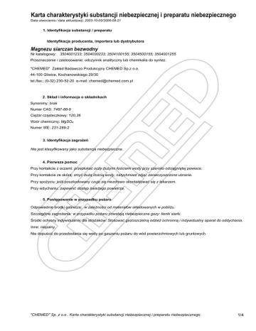 Karta charakterystyki substancji niebezpiecznej i preparatu niebezpiecznego Data utworzenia / data aktualizacji: 2003-10-05/2006-08-21 1. Identyfikacja substancji / preparatu Identyfikacja producenta, importera lub dystrybutora Magnezu siarczan bezwodny Nr katalogowy: 3504001233; 3504030233; 3504100155; 3504500155; 3504001255 Przeznaczenie / zastosowanie: odczynnik analityczny lub chemikalia do syntez. "CHEMED" Zakład Badawczo Produkcyjny CHEMED Sp.z o.o. 44-100 Gliwice, Kochanowskiego 29/30 tel./fax:; (0-32) 230-52-20 e-mail: [email protected] 2. Skład i informacja o składnikach Synonimy: brak Numer CAS: 7487-88-9 Ciężar cząsteczkowy: 120,36 Wzór chemiczny: MgSO4 Numer WE: 231-289-2 3. Identyfikacja zagrożeń Nie jest klasyfikowany jako substancja niebezpieczna. 4. Pierwsza pomoc Przy kontakcie z oczami: przepłukać oczy dużymi ilościami wody przy szeroko odciągniętej powiece. Przy kontakcie ze skórą: zmyć dużą ilością wody, natychmiast zdjąć zanieczyszczone ubranie. Przy spożyciu: jeśli poszkodowany czuje się niezdrowo skontaktować się z lekarzem. Przy wdychaniu: zapewnić dostęp świeżego powietrza. 5. Postępowanie w przypadku pożaru Odpowiednie środki gaśnicze: w zależności od materiałów składowanych w pobliżu. Szczególne zagrożenia: w przypadku pożaru powstają niebezpieczne gazy: tlenki siarki. Środki ochrony indywidualnej dla strażaków: Stosować gazoszczelną odzież ochronną i indywidualny aparat do oddychania. Inne: niepalny. Nie dopuścić do przedostania się wody po gaszeniu pożaru do wód powierzchniowych lub gruntowych. "CHEMED" Sp. z o.o . Karta charakterystyki substancji niebezpiecznej i preparatu niebezpiecznego 1/4 Magnezu siarczan bezwodny 6. Postępowanie w przypadku niezamierzonego uwolnienia do środowiska Zebrać na sucho, przekazać do likwidacji. Oczyścić zanieczyszczony teren (zmyć wodą). Nie dopuścić do dostania się do wód, ścieków i gleby. Unikać pylenia. Nie wdychać pyłów. 7. Postępowanie z substancją / preparatem i jej / jego magazynowanie Obchodzenie się z substancją: Zapewnić skuteczną wymianę powietrza (wentylacja). Postępować zgodnie z zasadami dobrej praktyki przemysłowej oraz ogólnymi zasadami bezpieczeństwa i higieny pracy z substancjami chemicznymi. Stosować środki ochrony osobistej zgodnie z pkt.8. Nie opróżniać do kanalizacji. Magazynowanie: szczelne opakowania, suche pomieszczenie. 8. Kontrola narażenia i środki ochrony indywidualnej Parametry kontroli (NDS, NDSCh, NDSP): nie ustalone Stosować odpowiednią wentylację wywiewną, miejscową i ogólną zapewniającą utrzymanie stężenia produktu w powietrzu poniżej określonych limitów (minimum 10-krotna wymiana powietrza na godzinę). Zaleca się wyposażenie miejsca pracy w wodny natrysk do płukania oczu oraz prysznic. Środki ochrony indywidualnej powinny być tak zaprojektowane i wykonane aby wykluczały zagrożenie i inne niedogodności w przewidywanych warunkach użytkowania, chroniące przed chemikaliami. Dz. U. nr 217, Rozporządzenie z dnia 29 listopada 2002 (poz. 1833); Dz. U. nr 80, Rozporządzenie z dnia 31 marca 2003 (poz. 725), Dz. U. nr212(poz. 1769), Rozporządzenie Ministra Gospodarki i Pracy z dnia 10 października 2005 Środki ochrony indywidualnej: ochrona dróg oddechowych: niekonieczna ochrona oczu: konieczna - okulary ochronne typu gogle ochrona rąk: niekonieczna ochrona ciała: niekonieczna środki ochronne i higieny: wymyć ręce po pracy z tą substancją. 9. Własności fizykochemiczne Forma: ciało stałe lepkość dynamiczna: Kolor: biały lepkość kinematyczna: Zapach: bez zapachu Ciśnienie par: brak danych pH: około 7,9 ( 50 g/l H2O, 20 °C) Gęstość: 2,66 g/cm3 (20°C) Temperatura topnienia: 1124°C Ciężar nasypowy: około 600 kg/m3 Temperatura wrzenia: brak danych Rozpuszczalność: Temperatura samozapłonu: nie dotyczy w wodzie: 269 g/l (20°C) Temperatura zapłonu: nie dotyczy w rozpuszczalnikach organicznych: brak danych Granice wybuchowości: nie dotyczy log P(w/o): dolna: górna: "CHEMED" Sp. z o.o . Karta charakterystyki substancji niebezpiecznej i preparatu niebezpiecznego 2/4 Magnezu siarczan bezwodny 10. Stabilność i reaktywność Warunki których należy unikać: brak. Materiały których należy unikać: brak. Niebezpieczne produkty rozkładu: brak. Następne dane: higroskopijny. 11. Informacje toksykologiczne Informacje toksykologiczne: LDL0 (doustnie, myszy): 500 mg/kg. Pozostałe dane: nie jest toksyczny nawet w dużych ilościach. 12. Informacje ekologiczne Ogólnie dla siarczanów – toksyczność ryby: od 7g/l. Przy ostrożnym i fachowym posługiwaniu się substancją, nie powinny wystąpić problemy ekologiczne. 13. Postępowanie z odpadami ZBP CHEMED przyjmuje do likwidacji substancje i opakowania po tych substancjach zakupione w ZBP CHEMED. Utylizacją odpadów powinny zająć się wyspecjalizowane firmy. Opakowanie jednorazowego ubytku traktować jak odpad i przekazać odbiorcy odpadów. Sposób likwidacji zebranych odpadów uzgodnić z właściwym terenowo wydziałem ochrony środowiska. Ustawy z dnia 27.04.2001 (Dz. U. nr 62, poz. 628), z dnia 11.05.2001 (Dz. U. nr 63 poz. 638)z poźn. zm. Rozporządzenie z dnia 27.09.2001 (Dz. U. nr 112, poz. 1206) 14. Informacje o transporcie Klasa ADR i grupa pakowania: nie jest przedmiotem przepisów transportowych Numer UN: nie dotyczy Nazwa materiału (wg UN): nie dotyczy "CHEMED" Sp. z o.o . Karta charakterystyki substancji niebezpiecznej i preparatu niebezpiecznego 3/4 Magnezu siarczan bezwodny 15. Informacje dotyczące przepisów prawnych Symbol i oznaczenie zagrożenia produktu: nie dotyczy. R: nie dotyczy. S: nie dotyczy. Oznakowanie WE. Dz. U. nr 171, Rozporządzenie z dnia 2 września 2003 (poz. 1666), Dz. U. nr 169, Obwieszczenie z dnia 28 sierpnia 2003 (poz. 1650), Dz. U. nr 173, Rozporządzenie z dnia 2 września 2003 (poz. 1679), Dz. U. nr 168, Rozporządzenie z dnia 5 lipca 2004 (poz. 1762), Dz. U