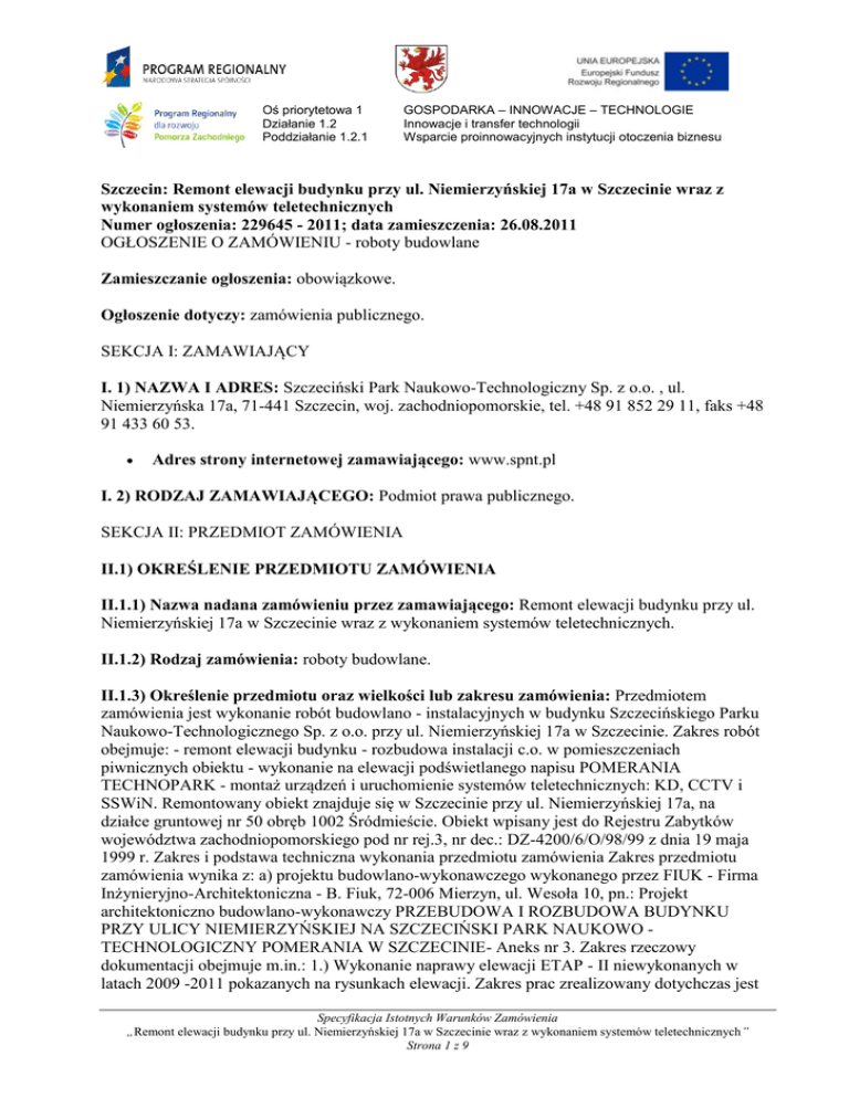 Oś priorytetowa 1 Działanie 1.2 Poddziałanie 1.2.1 GOSPODARKA – INNOWACJE – TECHNOLOGIE Innowacje i transfer technologii Wsparcie proinnowacyjnych instytucji otoczenia biznesu Szczecin: Remont elewacji budynku przy ul. Niemierzyńskiej 17a w Szczecinie wraz z wykonaniem systemów teletechnicznych Numer ogłoszenia: 229645 - 2011; data zamieszczenia: 26.08.2011 OGŁOSZENIE O ZAMÓWIENIU - roboty budowlane Zamieszczanie ogłoszenia: obowiązkowe. Ogłoszenie dotyczy: zamówienia publicznego. SEKCJA I: ZAMAWIAJĄCY I. 1) NAZWA I ADRES: Szczeciński Park Naukowo-Technologiczny Sp. z o.o. , ul. Niemierzyńska 17a, 71-441 Szczecin, woj. zachodniopomorskie, tel. +48 91 852 29 11, faks +48 91 433 60 53. Adres strony internetowej zamawiającego: www.spnt.pl I. 2) RODZAJ ZAMAWIAJĄCEGO: Podmiot prawa publicznego. SEKCJA II: PRZEDMIOT ZAMÓWIENIA II.1) OKREŚLENIE PRZEDMIOTU ZAMÓWIENIA II.1.1) Nazwa nadana zamówieniu przez zamawiającego: Remont elewacji budynku przy ul. Niemierzyńskiej 17a w Szczecinie wraz z wykonaniem systemów teletechnicznych. II.1.2) Rodzaj zamówienia: roboty budowlane. II.1.3) Określenie przedmiotu oraz wielkości lub zakresu zamówienia: Przedmiotem zamówienia jest wykonanie robót budowlano - instalacyjnych w budynku Szczecińskiego Parku Naukowo-Technologicznego Sp. z o.o. przy ul. Niemierzyńskiej 17a w Szczecinie. Zakres robót obejmuje: - remont elewacji budynku - rozbudowa instalacji c.o. w pomieszczeniach piwnicznych obiektu - wykonanie na elewacji podświetlanego napisu POMERANIA TECHNOPARK - montaż urządzeń i uruchomienie systemów teletechnicznych: KD, CCTV i SSWiN. Remontowany obiekt znajduje się w Szczecinie przy ul. Niemierzyńskiej 17a, na działce gruntowej nr 50 obręb 1002 Śródmieście. Obiekt wpisany jest do Rejestru Zabytków województwa zachodniopomorskiego pod nr rej.3, nr dec.: DZ-4200/6/O/98/99 z dnia 19 maja 1999 r. Zakres i podstawa techniczna wykonania przedmiotu zamówienia Zakres przedmiotu zamówienia wynika z: a) projektu budowlano-wykonawczego wykonanego przez FIUK - Firma Inżynieryjno-Architektoniczna - B. Fiuk, 72-006 Mierzyn, ul. Wesoła 10, pn.: Projekt architektoniczno budowlano-wykonawczy PRZEBUDOWA I ROZBUDOWA BUDYNKU PRZY ULICY NIEMIERZYŃSKIEJ NA SZCZECIŃSKI PARK NAUKOWO TECHNOLOGICZNY POMERANIA W SZCZECINIE- Aneks nr 3. Zakres rzeczowy dokumentacji obejmuje m.in.: 1.) Wykonanie naprawy elewacji ETAP - II niewykonanych w latach 2009 -2011 pokazanych na rysunkach elewacji. Zakres prac zrealizowany dotychczas jest Specyfikacja Istotnych Warunków Zamówienia „Remont elewacji budynku przy ul. Niemierzyńskiej 17a w Szczecinie wraz z wykonaniem systemów teletechnicznych” Strona 1 z 9 Oś priorytetowa 1 Działanie 1.2 Poddziałanie 1.2.1 GOSPODARKA – INNOWACJE – TECHNOLOGIE Innowacje i transfer technologii Wsparcie proinnowacyjnych instytucji otoczenia biznesu opisany w legendzie i oznaczony cyferkami na rysunkach poszczególnych elewacji. Oznaczenie tego zakresu wykonano po zinwentaryzowaniu stanu istniejącego w roku 2011. 2.) Wykonanie naprawy fragmentów elewacji niewykonanych podczas realizacji ETAPU-I w trakcie wymiany okien, a polegające na wykończeniu elewacji klinkierowej na styku z nowym oknem wykończenie ościeży wokół okien i wykończenie styku parapetu z nowym oknem i wykonanie parapetu z blachy cynkowej, dla zapewnienia prawidłowego użytkowania budynku. 3.) Projekt uwypukla utrudnienia w realizacji naprawy elewacji w obrębie gzymsu okapowego z cegły klinkierowej, polegające na czyszczeniu elewacji klinkierowej wraz z uzupełnieniem ubytków brakujących cegieł, oraz naprawie spoin, kiedy blacha okapowa jest zamontowana i są zamontowane nowe rynny i nowe rury spustowe na elewacji. Naprawa dachu została wykonana podczas realizacji prac w ETAPIE- I. 4.) Wykonanie boksów magazynowych na poddaszu. 5.) Wykonanie zadaszeń na wejściami do obiektu. 6.) Przebudowa części instalacji wewnętrznych sanitarnych i elektrycznych w budynku zawarte w tomie Nr-2 i Nr-3. b) dokumentacji projektowej wykonanej przez Beta-Dom sp. z o.o., 70-205 Szczecin, ul. Podgórna 46 (załącznik nr 9 b do SIWZ) w skład której wchodzi: b.1 Instalacja systemu dozoru telewizyjnego CCTV urządzenia pracujące w technice cyfrowej; b.3 Instalacja systemu sygnalizacji i napadu SSWiN; b.4 Instalacja systemu kontroli dostępu KD. c) Specyfikacji Technicznych Wykonania i Odbioru Robót Budowlanych d) Przedmiaru robót e) niniejszej SIWZ. Podstawa prawna wykonania robót: 1) Decyzja nr 329/2009 z dnia 21.04.2009 r. Starosty Stargardzkiego, o wydaniu zezwolenia na wykonanie robót budowlanych dla Gminy Miasto Szczecin, obejmujących remont i przebudowę budynku na Szczeciński Park Naukowo-Technologiczny przy ul. Niemierzyńskiej 17a w Szczecinie, 2) Decyzja nr 576/2010 z dnia 10.06.2010 r. Starosty Stargardzkiego, o wydaniu zezwolenia na wykonanie robót budowlanych dla Gminy Miasto Szczecin, obejmujących remont i przebudowę budynku na Szczeciński Park Naukowo-Technologiczny przy ul. Niemierzyńskiej 17a w Szczecinie, w zakresie objętym projektem zamiennym-aneks nr 1 3) Decyzja nr 625/2011 z dnia 27.07.2011 r. Starosty Stargardzkiego, o wydaniu zezwolenia na wykonanie robót budowlanych dla Gminy Miasto Szczecin, obejmujących remont i przebudowę budynku na Szczeciński Park Naukowo-Technologiczny przy ul. Niemierzyńskiej 17a w Szczecinie - w zakresie objętym projektem zamiennym, w zakresie objętym projektem zamiennym-aneks nr 2, 4) Decyzja znak: ZN-4220/94/W/2009 z dnia 16.04.2009 r. Zachodniopomorskiego Konserwatora Zabytków o zezwoleniu na przeprowadzenie w budynku przy ul. Niemierzyńskiej 17a w Szczecinie prac budowlanych. 5) Decyzja znak: ZN5174.05.2011.W z dnia 24.06.2011 r. Zachodniopomorskiego Konserwatora Zabytków o zezwoleniu na przeprowadzenie prac obejmujących montaż napisów podświetlanych na elewacji zachodniej i północnej oraz montaż daszku nad wejściem do budynku i daszku nad winda dla 