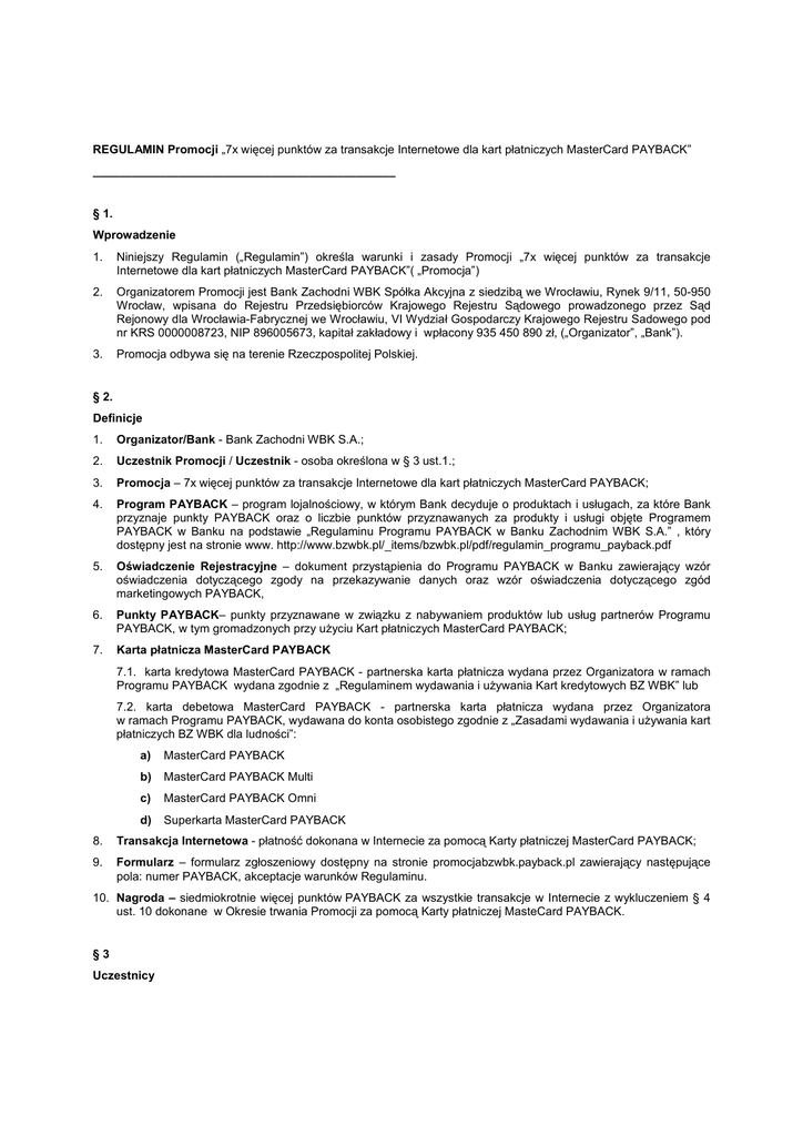 REGULAMIN Promocji „7x więcej punktów za transakcje Internetowe dla kart płatniczych MasterCard PAYBACK” ______________________________________________ § 1. Wprowadzenie 1. Niniejszy Regulamin („Regulamin”) określa warunki i zasady Promocji „7x więcej punktów za transakcje Internetowe dla kart płatniczych MasterCard PAYBACK”( „Promocja”) 2. Organizatorem Promocji jest Bank Zachodni WBK Spółka Akcyjna z siedzibą we Wrocławiu, Rynek 9/11, 50-950 Wrocław, wpisana do Rejestru Przedsiębiorców Krajowego Rejestru Sądowego prowadzonego przez Sąd Rejonowy dla Wrocławia-Fabrycznej we Wrocławiu, VI Wydział Gospodarczy Krajowego Rejestru Sadowego pod nr KRS 0000008723, NIP 896005673, kapitał zakładowy i wpłacony 935 450 890 zł, („Organizator”, „Bank”). 3. Promocja odbywa się na terenie Rzeczpospolitej Polskiej. § 2. Definicje 1. Organizator/Bank - Bank Zachodni WBK S.A.; 2. Uczestnik Promocji / Uczestnik - osoba określona w § 3 ust.1.; 3. Promocja – 7x więcej punktów za transakcje Internetowe dla kart płatniczych MasterCard PAYBACK; 4. Program PAYBACK – program lojalnościowy, w którym Bank decyduje o produktach i usługach, za które Bank przyznaje punkty PAYBACK oraz o liczbie punktów przyznawanych za produkty i usługi objęte Programem PAYBACK w Banku na podstawie „Regulaminu Programu PAYBACK w Banku Zachodnim WBK S.A.” , który dostępny jest na stronie www. http://www.bzwbk.pl/_items/bzwbk.pl/pdf/regulamin_programu_payback.pdf 5. Oświadczenie Rejestracyjne – dokument przystąpienia do Programu PAYBACK w Banku zawierający wzór oświadczenia dotyczącego zgody na przekazywanie danych oraz wzór oświadczenia dotyczącego zgód marketingowych PAYBACK, 6. Punkty PAYBACK– punkty przyznawane w związku z nabywaniem produktów lub usług partnerów Programu PAYBACK, w tym gromadzonych przy uŜyciu Kart płatniczych MasterCard PAYBACK; 7. Karta płatnicza MasterCard PAYBACK 7.1. karta kredytowa MasterCard PAYBACK - partnerska karta płatnicza wydana przez Organizatora w ramach Programu PAYBACK wydana zgodnie z „Regulaminem wydawania i uŜywania Kart kredytowych BZ WBK” lub 7.2. karta debetowa MasterCard PAYBACK - partnerska karta płatnicza wydana przez Organizatora w ramach Programu PAYBACK, wydawana do konta osobistego zgodnie z „Zasadami wydawania i uŜywania kart płatniczych BZ WBK dla ludności”: a) MasterCard PAYBACK b) MasterCard PAYBACK Multi c) MasterCard PAYBACK Omni d) Superkarta MasterCard PAYBACK 8. Transakcja Internetowa - płatność dokonana w Internecie za pomocą Karty płatniczej MasterCard PAYBACK; 9. Formularz – formularz zgłoszeniowy dostępny na stronie promocjabzwbk.payback.pl zawierający następujące pola: numer PAYBACK, akceptacje warunków Regulaminu. 10. Nagroda – siedmiokrotnie więcej punktów PAYBACK za wszystkie transakcje w Internecie z wykluczeniem § 4 ust. 10 dokonane w Okresie trwania Promocji za pomocą Karty płatniczej MasteCard PAYBACK. §3 Uczestnicy 1. Uczestnik Promocji - pełnoletnia osoba fizyczna, posiadająca pełna zdolność do czynności prawnych, zamieszkała na terenie Polski, będąca konsumentem w rozumieniu art. 22¹ kc („Uczestnik”) która spełnia następujące warunki: a) posiada przynajmniej jedną Kartę płatniczą MasterCard PAYBACK, b) w Okresie trwania Promocji prawidłowo wypełni i wyśle Formularz zgłoszeniowy, c) w Okresie trwania Promocji dokona Transakcji Internetowych kartą/kartami o łącznej sumie min. 1 000 PLN lub d) otrzyma informację o załoŜeniu Konta Godnego Polecenia wraz z Kartą płatniczą MasterCard PAYBACK za pośrednictwem kanałów elektronicznych (sms lub e-mail). § 4. Zasady Promocji 1. Promocja, o której mowa w niniejszym Regulaminie trwa od dnia 22.11.2013 do 19.01.2014 („Okres trwania Promocji”). 2. Do otrzymania Nagrody uprawnieni są Uczestnicy, którzy w Okresie trwania Promocji, określonym w ust. 1 powyŜej, spełnią łącznie następujące warunki: a) posiadają zawartą z Organizatorem umowę o Kartę płatniczą MasterCard PAYBACK b) wyraziły zgodę w Oświadczeniu Rejestracyjnym na przesyłanie informacji handlowej dla celów związanych z Programem PAYBACK c) w Okresie trwania Promocji dokonają transakcji w Internecie o łącznej sumie min. 1000 zł 3. JeŜeli Uczestnik posiada kilka kart MasterCard PAYBACK, transakcje dokonane w Internecie za pomocą róŜnych kart MasterCard PAYBACK w Okresie trwania Promocji sumują się. 4. W Promocji biorą udział transakcje w Internecie, które zostaną rozliczone na Koncie Uczestnika Promocji lub rachunku Karty kredytowej do 07 stycznia 2014 r. 5. Nagroda przyznawana jest wyłącznie w przypadku, gdy suma Transakcji Internetowych dokonanych w Okresie trwania Promocji przekroczy łączną sumę 1 000 PLN. 6. Nagroda zostanie przyznana Uczestnikowi, który spełnił warunki określone w ust. 2 niniejszego paragrafu, w ciągu 50 dni od daty zakończenia promocji i spełnienia warunków wskazanych w ust. 2 niniejszego paragrafu tj do dnia 19.02.2014. Punkty zostaną naliczone na numery PAYBACK proporcjonalnie do wykonanego obrotu pod warunkiem spełnienia warunku określonym w § 3 punkt 1 . 7. W Promocji Organizator przewidział Nagrodę w postaci siedmiokrotności Punktów transakcyjnych PAYBACK które otrzymał Uczestnik, za Transakcje Internetowe dokonane w Okresie trwania Promocji . 8. KaŜdy Uczestnik moŜe otrzymać tylko jedną Nagrodę 9. Wartość Nagrody jest zwolniona z podatku dochodowego od osób fizycznych na podstawie art. 21 ust.1 pkt 68 ustawy z dnia 26 lipca 1991 r. o podatku dochodowym od osób fizycznych (Dz.U. z 2010r. Nr 51, poz. 307 z późn.zm.). 10. Z Promocji wyłączone są transakcje dokonane w Internecie Kartą płatniczą MasterCard PAYBACK w punktach prowadzących działalność sklasyfikowaną jako MCC 7995 - Obstawianie zakładów (włącznie z loteriami), Ŝetony w kasynach, MCC 6540 - westernunion.pl, MCC 8999 – inne usłu