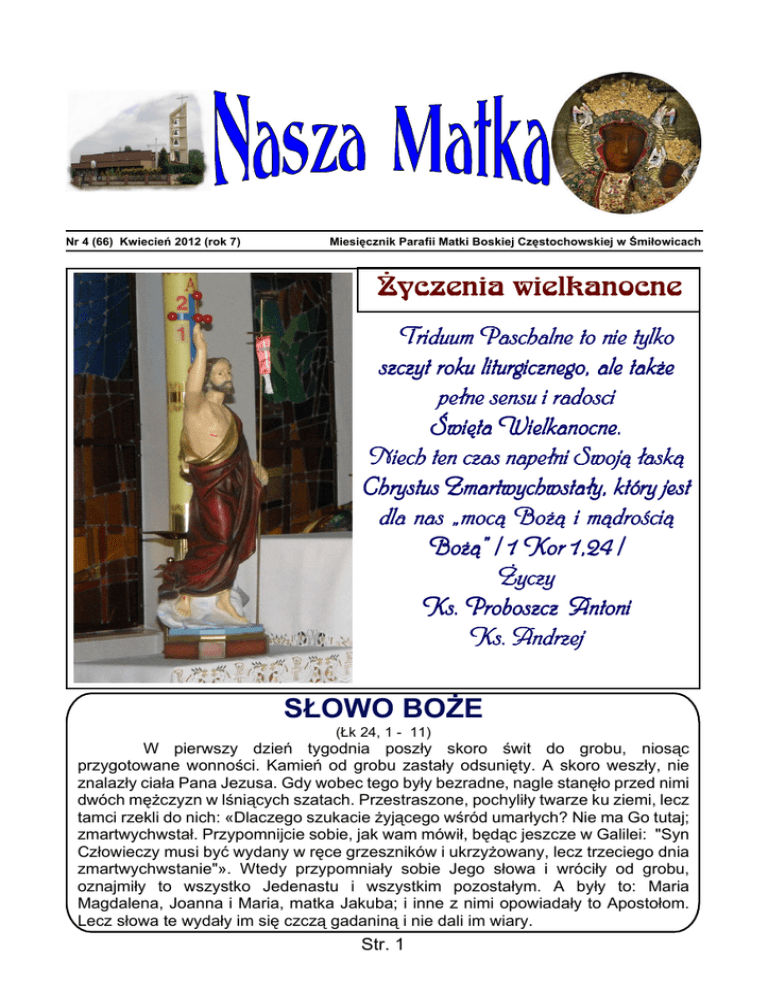 Nr 4 (66) Kwiecień 2012 (rok 7) Miesięcznik Parafii Matki Boskiej Częstochowskiej w Śmiłowicach Triduum Paschalne to nie tylko szczyt roku liturgicznego, ale takŜe pełne sensu i radosci Święta Wielkanocne. Niech ten czas napełni Swoją łaską Chrystus Zmartwychwstały, który jest dla nas „mocą BoŜą i mądrością BoŜą” / 1 Kor 1,24 / śyczy Ks. Proboszcz Antoni Ks. Andrzej SŁOWO BOśE (Łk 24, 1 - 11) W pierwszy dzień tygodnia poszły skoro świt do grobu, niosąc przygotowane wonności. Kamień od grobu zastały odsunięty. A skoro weszły, nie znalazły ciała Pana Jezusa. Gdy wobec tego były bezradne, nagle stanęło przed nimi dwóch męŜczyzn w lśniących szatach. Przestraszone, pochyliły twarze ku ziemi, lecz tamci rzekli do nich: «Dlaczego szukacie Ŝyjącego wśród umarłych? Nie ma Go tutaj; zmartwychwstał. Przypomnijcie sobie, jak wam mówił, będąc jeszcze w Galilei: "Syn Człowieczy musi być wydany w ręce grzeszników i ukrzyŜowany, lecz trzeciego dnia zmartwychwstanie"». Wtedy przypomniały sobie Jego słowa i wróciły od grobu, oznajmiły to wszystko Jedenastu i wszystkim pozostałym. A były to: Maria Magdalena, Joanna i Maria, matka Jakuba; i inne z nimi opowiadały to Apostołom. Lecz słowa te wydały im się czczą gadaniną i nie dali im wiary. Str. 1 List otwarty w sprawie TV Trwam List otwarty Stowarzyszenia Komunikacji w systemie naziemnej telewizji cyfrowej dla TV Trwam Stowarzyszenie Komunikacji Społecznej SIGNIS-POLSKA zostało zatwierdzone przez Konferencję Episkopatu Polski jako organizacja zrzeszająca katolików: świeckich i duchownych zaangaŜowanych w róŜnych rodzajach mediów, głównie elektronicznych oraz tych, którym zaleŜy na promocji chrześcijańskiej wizji komunikowania społecznego. http://www.katolik.pl/list-otwarty-w-sprawie-tv-trwam,22765,794,news.html Widzowie TV Trwam, jako pełnoprawni obywatele zasługują, aby ich głos i potrzeby były brane pod uwagę na równi z innymi. Ze względu na specyfikę tej grupy społecznej, składającej się w duŜej mierze z osób starszych, samotnych, chorych, a więc bardziej niŜ inni zagroŜonych wykluczeniem z uczestnictwa w dobrach kultury dostarczanych przez technologię DVB-S, kwestia ułatwienia im dostępności powinna być jednym z priorytetowych wyznaczników przy rozdzielaniu miejsc na multipleksach DVB-T. Nie moŜna równieŜ ignorować faktu, Ŝe TV Trwam i media związane z Radiem Maryja zostały zbudowane w oparciu o ofiarność ich odbiorców, nie słuŜą celom komercyjnym, mają masowy zasięg i działają z powodzeniem od wielu lat. Decyzja KRRiT o nie przyznaniu miejsca dla TV Trwam na multipleksie 1 (MUX-1) wywołała poczucie krzywdy i niesprawiedliwości w grupie społecznej liczonej w milionach obywateli. W świetle innych decyzji KRRiT oraz dalszego postępowania podmiotów, które miejsce na platformie otrzymały i następnie związały się z głównymi podmiotami komercyjnymi działającymi na rynku, moŜna stwierdzić, Ŝe mamy do czynienia z zawęŜaniem pluralizmu w mediach. Jest to w swej istocie działaniem przeciwnym rozwojowi demokracji i społeczeństwa obywatelskiego, co uwaŜamy za niedopuszczalne. W tym kontekście sprawą niezwykle waŜną staje się transparentność procesu decyzyjnego KRRiT, udostępnienie argumentacji jaką się kierowała, dobrowolne poddanie się kontroli uprawnionym do tego instytucjom, szczególnie NIK. Z drugiej strony wyraŜona w Sejmie przez Przewodniczącego Rady pod adresem przedstawicieli TV Trwam zachęta do wejścia na drogę sądową nosi znamiona cynizmu. Doświadczenie sprawności polskiego wymiaru sprawiedliwości wskazuje, Ŝe prawomocnego orzeczenia moŜna spodziewać się za kilka lat. W imieniu członków Stowarzyszenia Signis-Polska ks. Krzysztof Ołdakowski SJ Rafał Wieczyński Str. 2 Zmartwychwstanie – fakt i teologia Źródło: Michał Wojciechowski, Wiara – cywilizacja – polityka, Dextra – As, Rzeszów – Rybnik 2001 Zmartwychwstanie Jezusa dość często pojmowane jest jako naczelny argument na rzecz wiary chrześcijańskiej. Istotnie, na tym fakcie się ona opiera; nie na darmo św. Paweł napisał: Jeśli Chrystus nie zmartwychwstał, daremne jest nasze nauczanie, próŜna jest takŜe wasza wiara (1 List do Koryntian 15,14). W związku z tym dla potwierdzenia wiarygodności chrześ-cijaństwa dowodzi się realności Jezusowego powrotu do Ŝycia. Wychodzi się w tym celu od wyraźnych informacji Nowego Testamentu na temat pustego grobu, zjawień się Zmartwychwstałego i obecnego od początku w pierwotnym chrześcijaństwie przekonania, Ŝe Jezus naprawdę powstał z martwych. Fakt zmartwychwstania jawi się jako jedyne wyjaśnienie tych zjawisk. Z drugiej strony szereg ludzi wątpi, czy takie racjonalne dowodzenie jest moŜliwe i potrzebne. Niekoniecznie chodzi tu o niewierzących. Chrześcijanie tacy aprobują wiarę w Chrystusa cechującą Kościół pierwotny i uwaŜają, Ŝe ich Ŝycie równieŜ powinno zostać przemienione przez spotkanie z Nim. W centrum stawiają jednak samą wiarę jako łaskę i warunek osobowej przemiany. Przyjmują Nowy Testament jako świadectwo o spotkaniu z Jezusem, ale mało interesują się racjonalnym uzasadnieniem podstaw wiary. Postawa taka kojarzy się zwłaszcza z luterańską teologią Rudolfa Bultmanna, który aprobując wiarę jako doświadczenie egzystencjalne nadające Ŝyciu sens, negował zarazem moŜność dotarcia poprzez księgi Nowego Testamentu do jej historycznych fundamentów. Wielu jednak chrześcijan bezwiednie przyjmuje podobną postawę, pojmując wiarę przeŜyciowo, a mało zajmując się jej racjami. Dość paradoksalnie oba opisane dotąd podejścia mają pewne punkty wspólne, które są zarazem ich punktami słabymi. Przy podejściu pierwszym, dowodząc na podstawie zmartwychwstania Jezusa słuszności wiary chrześcijańskiej, rozdziela się na dwa etapy zjawisko ze swej istoty jedno. Uznania świadectw