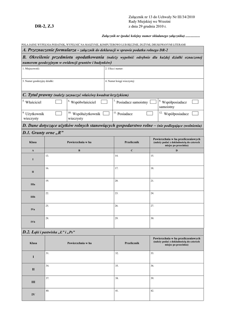 Załącznik nr 13 do Uchwały Nr III/34/2010 Rady Miejskiej we Wrześni z dnia 29 grudnia 2010 r. DR-2, Z.3 Załącznik nr (podać kolejny numer składanego załącznika) ................. POLA JASNE WYPEŁNIA PODATNIK, WYPEŁNIĆ NA MASZYNIE, KOMPUTEROWO LUB RĘCZNIE, DUŻYMI, DRUKOWANYMI LITERAMI A. Przeznaczenie formularza - załącznik do deklaracji w sprawie podatku rolnego DR-2 B. Określenie przedmiotu opodatkowania (należy wypełnić odrębnie dla każdej działki oznaczonej numerem geodezyjnym w ewidencji gruntów i budynków) 1. Miejscowość: 2. Ulica i numer: 3. Numer geodezyjny działki: 4. Numer księgi wieczystej: C. Tytuł prawny (należy zaznaczyć właściwy kwadrat krzyżykiem) 5. Właściciel 6. Użytkownik wieczysty 10. 9. Współwłaściciel Współużytkownik wieczysty 7. 8. Posiadacz samoistny 11. Współposiadacz samoistny 12. Posiadacz Współposiadacz D. Dane dotyczące użytków rolnych stanowiących gospodarstwo rolne – (nie podlegające zwolnieniu) D.1. Grunty orne „R” Klasa Powierzchnia w ha A Przelicznik B Powierzchnia w ha przeliczeniowych (należy podać z dokładnością do czterech miejsc po przecinku) C D 13. 14. 15. 16. 17. 18. 19. 20. 21. 22. 23. 24. 25. 26. 27. 28. 29. 30. I II IIIa IIIb IVa IVb D.2. Łąki i pastwiska „Ł” i „Ps” Powierzchnia w ha przeliczeniowych Klasa Powierzchnia w ha Przelicznik (należy podać z dokładnością do czterech miejsc po przecinku) 31. 32. 33. 34. 35. 36. 37. 38. 39. 40. 41. 42. I II III IV DR-2, Z.3 POLA JASNE WYPEŁNIA PODATNIK, WYPEŁNIC NA MASZYNIE, KOMPUTEROWO LUB RĘCZNIE, DUŻYMI, DRUKOWANYMI LITERAMI D.3. Sady „S” Powierzchnia w ha przeliczeniowych Klasa Powierzchnia w ha A Przelicznik B (należy podać z dokładnością do czterech miejsc po przecinku) C D 43. 44. 45. 46. 47. 48. 49. 50. 51. 52. 53. 54. 55. 56. 57. 58. 59. 60. 61. 62. 63. 64. 65. 66. I II III IIIa IIIb IV IVa IVb D.4. Grunty pod stawami niezarybionymi „Wsr” – grunty orne Powierzchnia w ha przeliczeniowych Klasa Powierzchnia w ha Przelicznik (należy podać z dokładnością do czterech miejsc po przecinku) I 67. 68. 69. II 70. 71. 72. IIIa 73. 74. 75. IIIb 76. 77. 78. IVa 79. 80. 81. IVb 82. 83. 84. D.5. Grunty pod stawami niezarybionymi „Wsr” – łąki i pastwiska Klasa Powierzchnia w ha Przelicznik Powierzchnia w ha przeliczeniowych (należy podać z dokładnością do czterech miejsc po przecinku) 85. 86. 87. 88. 89. 90. 91. 92. 93. 94. 95. 96. I II III IV DR-2, Z.3 POLA JASNE WYPEŁNIA PODATNIK, WYPEŁNIĆ NA MASZYNIE, KOMPUTEROWO LUB RĘCZNIE, DUŻYMI, DRUKOWANYMI LITERAMI D.6. Grunty rolne zabudowane „B” – grunty orne Klasa Powierzchnia w ha Przelicznik A B C Powierzchnia w ha przeliczeniowych (należy podać z dokładnością do czterech miejsc po przecinku) D 97. 98. 99. 100. 101. 102. 103. 104. 105. 106. 107. 108. 109. 110. 111. 112. 113. 114. I II IIIa IIIb IVa IVb D.7. Grunty rolne zabudowane „B” - łąki i pastwiska Powierzchnia w ha przeliczeniowych Klasa Powierzchnia w ha Przelicznik (należy podać z dokładnością do czterech miejsc po przecinku) A B C D 115. 116. 117. 118. 119. 120. 121. 122. 123. 124. 125. 126. I II III IV D.8. Rowy „W” – grunty orne Klasa Powierzchnia w ha A Przelicznik B Powierzchnia w ha przeliczeniowych (należy podać z dokładnością do czterech miejsc po przecinku) C D 127. 128. 129. 130. 131. 132. 133. 134. 135. 136. 137. 138. 139. 140. 141. 142. 143. 144. I I IIIa IIIb IVa IVb DR-2, Z.3 ` POLA JASNE WYPEŁNIA PODATNIK, WYPEŁNIC NA MASZYNIE, KOMPUTEROWO LUB RĘCZNIE, DUŻYMI, DRUKOWANYMI LITERAMI D.9. Rowy „W” – łąki i pastwiska Klasa Powierzchnia w ha Przelicznik A B C Powierzchnia w ha przeliczeniowych (należy podać z dokładnością do czterech miejsc po przecinku) D 145. 146. 147. II 148. 149. 150. III 151. 152. 153. IV 154. 155. 156. I D.10. Użytki rolne (rowy, grunty pod stawami niezarybionymi) bez oznaczenia klasy gleboznawczej 157. Powierzchnia w ha D.11. Grunty pod stawami zarybionymi – łososiem, trocią, głowacicą, palią i pstrągiem Powierzchnia w ha (należy podać z dokładnością do czterech miejsc po przecinku) Przelicznik Powierzchnia w ha przeliczeniowych (należy podać z B C A 158. dokładnością do czterech miejsc po przecinku) 159. 160. D.12. Grunty pod stawami zarybionymi – inne gatunki ryb Powierzchnia w ha (należy podać z dokładnością do czterech miejsc po przecinku) Przelicznik Powierzchnia w ha przeliczeniowych (należy podać z B C A 161. dokładnością do czterech miejsc po przecinku) 162. 163. D.13. Łączna powierzchnia użytków rolnych 164. Powierzchnia w ha (suma z części od D1 do D9 kolumny B, części D10 165. Powierzchnia w ha przeliczeniowych (suma w części od D1 do D9 kolumny D oraz oraz części D11-D12 kolumny A) części D11-D12 kolumny C) .............................................................................................................................. ............................................................................................................................................ E. Łączna kwota podatku od gospodarstw rolnych E.1. Łącznie powierzchnia w ha przeliczeniowych 166. (należy wpisać powierzchnię z poz. 165) E.2. Stawka podatku (stanowiąca równowartość pieniężną 167. 2,5 q średniej ceny skupu żyta określonej w Uchwale Rady Miejskiej we Wrześni na dany rok podatkowy) E.3. Kwota podatku 168. .................................zł. ..................... gr. F. Dane dotyczące użytków rolnych niestanowiących gospodarstw rolnych niepodlegających zwolnieniu F.1. Powierzchnia w ha 169. F.2. Stawka podatku (stanowiąca równowartość pieniężną 170. 5 q średniej ceny skupu żyta określonej w Uchwale Rady Miejskiej we Wrześni na dany rok podatkowy) F.3. Kwota podatku 171. ..................................zł. ..................... gr.