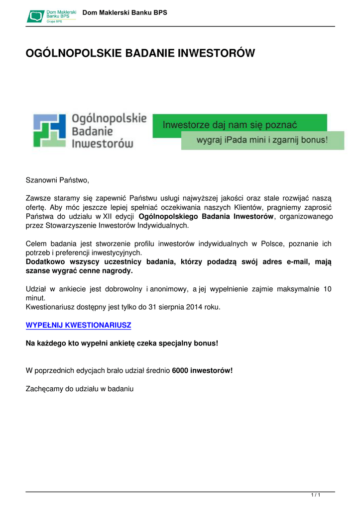 Dom Maklerski Banku BPS OGÓLNOPOLSKIE BADANIE INWESTORÓW Szanowni Państwo, Zawsze staramy się zapewnić Państwu usługi najwyższej jakości oraz stale rozwijać naszą ofertę. Aby móc jeszcze lepiej spełniać oczekiwania naszych Klientów, pragniemy zaprosić Państwa do udziału w XII edycji Ogólnopolskiego Badania Inwestorów, organizowanego przez Stowarzyszenie Inwestorów Indywidualnych. Celem badania jest stworzenie profilu inwestorów indywidualnych w Polsce, poznanie ich potrzeb i preferencji inwestycyjnych. Dodatkowo wszyscy uczestnicy badania, którzy podadzą swój adres e-mail, mają szanse wygrać cenne nagrody. Udział w ankiecie jest dobrowolny i anonimowy, a jej wypełnienie zajmie maksymalnie 10 minut. Kwestionariusz dostępny jest tylko do 31 sierpnia 2014 roku. WYPEŁNIJ KWESTIONARIUSZ Na każdego kto wypełni ankietę czeka specjalny bonus! W poprzednich edycjach brało udział średnio 6000 inwestorów! Zachęcamy do udziału w badaniu 1/1