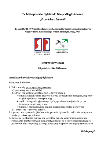 IV Małopolskie Dyktando Niepodległościowe „Po polsku o historii” dla uczniów kl. IV-VI szkół podstawowych, gimnazjów i szkół ponadgimnazjalnych województwa małopolskiego w roku szkolnym 2016/2017 ETAP WOJEWÓDZKI 28 października 2016 roku Instrukcja dla osoby czytającej dyktando Szanowni Państwo! 1. Tekst należy przeczytać trzykrotnie: a) pierwszy raz – w całości b) drugi raz wolniej, dyktując po jednym zdaniu zdania wielokrotnie złożone należy podzielić na mniejsze, logiczne części, zgodnie z interpunkcją znaki interpunkcyjne mogą być sygnalizowane jedynie przez intonację, a nie nazywane bardziej rozbudowane zdania można przeczytać ponownie c) trzeci raz – znów w całości. 2. Łączny czas dyktanda (kodowanie, pisanie dyktanda i oddanie pracy) nie może przekroczyć 45 min. 3. Udział w Konkursie ma być dla uczniów przede wszystkim okazją do rozwijania zainteresowań humanistycznych i dociekliwości poznawczej: językowej i historycznej, dlatego zadbajmy o spokój i tonujmy rywalizację. Dziękujemy! IV Małopolskie Dyktando Niepodległościowe „Po polsku o historii”, rok szkolny 2016/2017 IV Małopolskie Dyktando Niepodległościowe „Po polsku o historii”, rok szkolny 2016/2017 Tekst dyktanda dla uczniów SZKOŁY PONADGIMNAZJALNEJ Z hejnałem w tle Już dwa lata po powstaniu Polskiego Radia uruchomiono radiostacje regionalne, m.in. w Krakowie i Wilnie. Po dwutygodniowym okresie próbnym rozgłośnia krakowska rozpoczęła regularne nadawanie programów. Jeden z pierwszych to słowno-muzyczna audycja nadana w Wielką Sobotę, złożona z wierszy Wyspiańskiego oraz pierwszej transmisji spiżowego głosu dzwonu Zygmunta z wawelskiej katedry i hejnału mariackiego z wieży kościoła przy Rynku Głównym. Odtąd codziennie, w samo południe czysto brzmiące dźwięki tej melodii płyną z polskich rozgłośni radiowych. Z radiem w Krakowie nieprzerwanie związani byli ludzie nauki i pióra. W inauguracyjnym literackim programie poeta Awangardy Krakowskiej, Jalu Kurek, wygłosił swój wiersz. O krakowskiej fali 422 powiedział: „Jesteś nam droga jak chleb, jako rzecz wielka i rzecz pospolita”. Wachlarz najprzeróżniejszych tematów i form obecny był w stacji od jej zarania. Częstokroć transmitowano przemówienia Komendanta, rokrocznie, aż do wybuchu wojny marsze „szlakiem kadrówki” z krakowskich Oleandrów. Któż by wyliczył niezliczone przykłady różnorodności krakowskiego programu radiowego? Na fali 422 Małopolanie wsłuchiwali się w muzykę, transmisję uroczystości pogrzebowych generała Józefa Bema, bohatera nie jednego, a kilku narodów, w bezpośrednie relacje z Igrzysk Olimpijskich w Amsterdamie czy z wyścigu automobilowego do Morskiego Oka, a nadto w minipogadanki, jak być cud-kobietą po wsze czasy. II wojna światowa przerwała pracę rozgłośni do stycznia 1945 r., kiedy powtórnie rozbrzmiały słowa: „Tu Polskie Radio Kraków”. Dzieje radia znowuż łączą się z kościołem Mariackim, gdyż stąd właśnie nadano ostatnią przedwojenną transmisję i pierwszą powojenną i tu także – we wnętrzu jednej z wież – przechowywano w czasie okupacji hitlerowskiej aparaturę radiofoniczną. Kolejne dziesięciolecia pracy to kontynuacja modelu sprzed wojny, wszakże wzbogacanego nowymi gatunkami radiowymi. Niektóre z nich – rzec by można – stały się znakami identyfikacyjnymi Radia Kraków. Były to wieloobsadowe słuchowiska i teatr radiowy, i reportaże literackie, tworzące prestiż rozgłośni. Zostało to potwierdzone licznymi wyróżnieniami, takimi jak „radiowy Oscar”, Jacek Stwora otrzymał go za reportaż z wielkopostnego misterium w Kalwarii Zebrzydowskiej. Jednakże pierwszoplanowym zadaniem radia jest przekazywanie bieżących informacji. Stąd w eterze usłyszeć można było w latach 50. transmisję defilady budowniczych Nowej Huty, a po kilkudziesięciu latach wstrząsającą wieść o śmierci niespełna dwudziestoparoletniego Bogdana Włosika, mieszkańca tej robotniczej dzielnicy. Dzieje każdego radia są wpisane w historię, politykę i niebywały postęp technologiczny. Pomimo to wciąż pozostaje ono wyjątkowym medium.