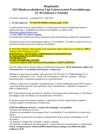 Regulamin XII Międzywydziałowej Ligi Uniwersytetu Przyrodniczego we Wrocławiu w Futsalu 1.Termin rozgrywek – Listopad 2014 - Maj 2015, 2. Termin zgłoszeń – 15 LISTOPAD2014 (sobota) godz. 23:59 3. Zgłoszeniem nazywa się przesłanie w wyznaczonym terminie kompletnego arkusza zgłoszeniowego z uzupełnionymi danymi zawodników na adres email: [email protected], w tytule: MLF UP_nazwa zespołu. (na konferencji technicznej należy dostarczyć druk potwierdzenia znajomości regulaminu) 4. Każda drużyna może maksymalnie zgłosić 12 zawodników. W trakcie rozgrywek nie ma możliwości dopisywania już żadnych zawodników. 5. Wszystkie drużyny zobowiązane są do uiszczenia opłaty wpisowej w wysokości 100 zł. Wpłatę należy dokonać na konto: Klub Sportowy „AZS Wrocław” Akademickiego Związku Sportowego ul. Mianowskiego 2B, 51-605 Wrocław NIP:896-000-47-39 45 1090 2402 0000 0001 1450 8382 z dopiskiem wpisowe MLF Uniwersyte Przyrodniczy- NAZWA ZESPOŁU Dowód wpłaty należy okazać podczas konferencji technicznej. Brak dokonania wpłaty jest równoznaczne z wycofaniem się drużyny z rozgrywek. 6.Miejsce rozgrywania zawodów- hala sportowa UP Wrocław ul .Chełmońskiego 43, w czwartki w godzinach 21:30 – 24:00, lub ewentualnie w inne dni i godziny – drużyny poinformowane z minimum tygodniowym wyprzedzeniem 7.Mecze rozgrywane są zgodnie z przepisami gry w Futsal ustalonymi przez PZPN (oprócz wytycznych dotyczących czasu spotkania, oraz wielokrotności kontaktów bramkarza z piłka w jednej akcji) 8.W rozgrywkach mogą uczestniczyć studenci Uniwersytetu Przyrodniczego we Wrocławiu posiadający wpis do indeksu na rok akademicki 2014/2015. 9. System rozgrywek zostanie ustalony w zależności od ilości zgłoszonych zespołów i zostanie podany na Konferencji Technicznej. 10.Dyskwalifikacja drużyny z rozgrywek następuje w przypadku: -Drużyna nie stawiła się na mecz -Drużyna nie posiadała wystarczającej ilości zawodników (3 zawodników) do rozpoczęcia meczu -W drużynie uczestniczyli zawodnicy nieuprawnieni do gry (osoby niestudiujące na UP Wrocław) -W drużynie występował zawodnik z innego wydziału. -W drużynie występował zawodnik grający w innej drużynie uczestniczącej w rozgrywkach. Mecze rozegrane przez zdyskwalifikowaną drużynę zostają zweryfikowane jako walkower (0-5) 11. Drużyna ma prawo do przełożenia jednego spotkania w trakcie rozgrywek, jednak wniosek musi wpłynąć drogą e-mail z tygodniowym wyprzedzeniem mailto:[email protected] 12.Czas trwania meczu w fazie grupowej 20 minut, bez zatrzymywania czasu gry, bez zmiany stron. Mecz fazy pucharowej (ćwierćfinał, półfinał) 2 x 10 minut (zatrzymywane 2 ostanie minuty każdej z połów), przerwa 2 minut. Finał oraz mecz o 3 miejsce 2 x 12 minut (zatrzymywane 2 ostanie minuty każdej z połów), przerwa 5 minut. 13. Mecz finałowy i mecz o 3 miejsce rozegrany zostanie w Maju 2015, podczas Dnia Sportu Uniwersytetu Przyrodniczego. 14. Wszyscy zawodnicy zobowiązani są do posiadania ważnej legitymacji studenckiej podczas każdego spotkania do wglądu przez sędziego i organizatorów zawodów. Na 5 minut przed planowanym meczem kapitan zobowiązany jest dostarczyć komplet legitymacji studenckich do organizatora. 15.Najlepszym strzelcem zawodów zostaje zawodnik z największą ilością strzelonych bramek we wszystkich meczach rozgrywanych w lidze, w przypadku zdobycia jednakowej ilości bramek przez dwóch lub więcej zawodników Królem Strzelców zostaje zawodnik, którego zespół uplasował się na wyższym miejscu. 16.Najlepszym bramkarzem zawodów zostaję bramkarz wytypowany przez Zarząd KU AZS UP Wrocław. 17.Wszyscy zawodnicy biorący udział w rozgrywkach MLFUP zobowiązani są do posiadania ważnego ubezpieczenia NNW oraz poświadczenia własnoręcznym podpisem na załączniku nr 1 18.Organizatorzy zawodów zastrzegają sobie prawo do zmian w regulaminie. 19.Organizator nie ponosi odpowiedzialności od następstw nieszczęśliwych wypadków powstałych podczas rozgrywek XI edycji Międzywydziałowej Ligi Futsalu Uniwersytetu Przyrodniczego Z poważaniem Sebastian Bednarz Wiceprezes ds. Sportowych KU AZS UP