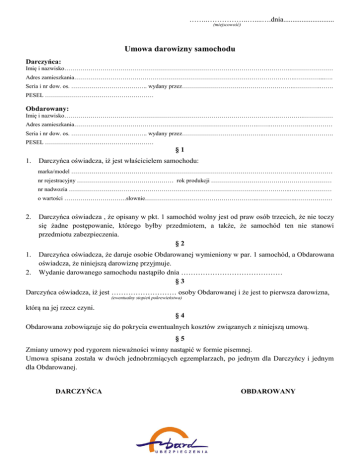 ……..……………..…....….dnia............................ (miejscowość) Umowa darowizny samochodu Darczyńca: Imię i nazwisko…………………………………………………………………………………………………..………………… Adres zamieszkania………………………………………………………………………………………………..…………....…. Seria i nr dow. os. ……………………………….. wydany przez………………………………………………..………….……. PESEL ……………………………………………… Obdarowany: Imię i nazwisko…………………………………………………………………………………………….………….…………… Adres zamieszkania……………………………………………………………………………….…….……………….………… Seria i nr dow. os. ……………………………….. wydany przez…………………………………..……………….……………. PESEL ……………………………………………… §1 1. Darczyńca oświadcza, iż jest właścicielem samochodu: marka/model ………………………………………………………………………………………………….……………… nr rejestracyjny ………………………………………… rok produkcji …………………………………………………… nr nadwozia ………………………………………………………………………………………………..………………… o wartości ………………………….słownie………………………………………………..………………..……………… 2. Darczyńca oświadcza , że opisany w pkt. 1 samochód wolny jest od praw osób trzecich, że nie toczy się żadne postępowanie, którego byłby przedmiotem, a także, że samochód ten nie stanowi przedmiotu zabezpieczenia. §2 1. Darczyńca oświadcza, że daruje osobie Obdarowanej wymieniony w par. 1 samochód, a Obdarowana oświadcza, że niniejszą darowiznę przyjmuje. Wydanie darowanego samochodu nastąpiło dnia …………………………………… §3 2. Darczyńca oświadcza, iż jest ……………………… osoby Obdarowanej i że jest to pierwsza darowizna, (ewentualny stopień pokrewieństwa) którą na jej rzecz czyni. §4 Obdarowana zobowiązuje się do pokrycia ewentualnych kosztów związanych z niniejszą umową. §5 Zmiany umowy pod rygorem nieważności winny nastąpić w formie pisemnej. Umowa spisana została w dwóch jednobrzmiących egzemplarzach, po jednym dla Darczyńcy i jednym dla Obdarowanej. DARCZYŃCA OBDAROWANY