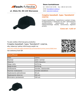 Dane kontaktowe tel. +48 22 122 13 00 , fax. +48 22 122 13 01 email: [email protected] ul. Złota 59, 00-120 Warszawa www: www.tech-media.pl Czapka baseball. typu 'Sandwich' czarna Czapka baseballowa , bawełniana o grubym ściegu, 6-segmentowa z zapięciem na rzep i obszywanymi wywietrznikami, wykończenia w kolorze trójwarstwowego daszka, wzmocniony segment przedni. Cena od : 4,63 zł To jest ulotka informacyjna produktu: Czapka baseball. typu 'Sandwich' czarna , aby zobaczyć pełną informację wejdź na: www.tech-media.pl/czapka,baseball,typu,primesandwich,prime,czarna,01662.html lub zeskanuj kod QR. Specyfikacja Kolor czarny Rozmiar jeden rozmiar Materiał 100% Bawełna Waga netto 0,074 kg. Waga brutto 0,079 kg. Znakowanie transfer, fototransfer Rozmiar znakowania transfer:20x50mm Opakowanie jednostkowe 50 szt. Opakowanie zbiorcze 200 szt. Minimalne zamówienie 150 szt.