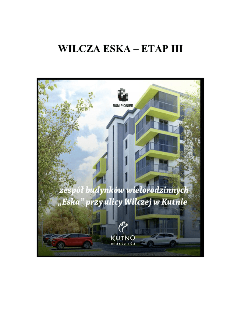 WILCZA ESKA – ETAP III Na teren zespołu budynków prowadzą trzy zjazdy z czego dwa zlokalizowane są od strony ul. Królowej Jadwigi oraz jeden z ul. Wilczej. Prowadzą one do drogi wewnętrznej zaprojektowanej dookoła całego terenu oraz stanowiącej główny, wewnętrzny układ drogowy, obsługę parkingów i dojazdy przeciwpożarowe. Dla układu budynków wielorodzinnych zaprojektowano cztery zespoły parkingów dla samochodów osobowych po 1 miejscu dla każdego mieszkania, a ok. 10 % przyjezdnych może znaleźć miejsce w pasie drogowym ulicy Wilczej lub Królowej Jadwigi. W sumie przewidziano 126 miejsc parkingowych, oraz dodatkowo 6 miejsc dla osób niepełnosprawnych (126 mieszkań + 6 nieprzypisanych dla osób niepełnosprawnych).Poszczególne zespoły parkingowe powstawać będą w korelacji z budynkami. Drogi dojazdowe zaprojektowano o szerokości po 5 metrów, z kostki betonowej wibroprasowanej. Chodniki i miejsca postojowe z kostki betonowej wibroprasowanej w innym kolorze. Budynki projektowane to: „A”( w realizacji) – 33 mieszkania powierzchnia – ok.2000 m2 „B” – 33 mieszkania powierzchnia – ok.2000 m2 nacji „C” – 33 mieszkań powierzchnia – ok. 2245 m2 „D”( w realizacji) – 27 mieszkań powierzchnia – ok. 1370 m2 Łącznie 126 mieszkań o powierzchni przewidywanej około 7500 m2. W trzecim etapie przewiduje się powstanie dwóch budynków tj. B i C. Pomieszczenia techniczne – na węzeł c.o. zaprojektowano w piwnicy każdego bloku. Każdy z budynków ma partery przystosowane i dostępne dla osób niepełnosprawnych. W każdym mieszkaniu na parterze istnieje też możliwość przystosowania go dla mieszkającej osoby niepełnosprawnej. Komórki dla mieszkańców – po jednej na każde mieszkanie – zlokalizowano w piwnicy W każdej klatce schodowej zamontowane zostaną windy. Budynki zaprojektowano jako wielokondygnacyjne, podpiwniczone, kilku klatkowe. Bryły na bazie litery L ukształtowano symetrycznie lub asymetrycznie i rozrzeźbiono uskokami ścian w elewacjach. Istotną rolę dla bryły budynku odgrywają loggie i balkony oraz nawiązujące do nich attyki. Od strony północno-wschodniej lub północno- zachodniej budynków zaprojektowano wejścia i klatki schodowe. Wejścia podkreślono ozdobnie ukształtowanymi daszkami. Dachy budynków zaprojektowano generalnie jako dwuspadowy płaskie z odwodnieniem do środka. Spadek przy ścianach zewnętrznych przyjęto 3,8%. Wewnętrzny układ budynku przewiduje mieszkania bezpośrednio dostępne z klatek schodowych (po dwa lub trzy z klatki) Mieszkania zaprojektowano jako przewietrzalne, położone narożnikowo lub z oknami na przestrzał w budynku. Od strony południowej i zachodniej przewidziano duże pokoje z loggiami. Zagospodarowanie terenu Projektowane osiedle stanowi kontynuację funkcji istniejącego zespołu czterokondygnacyjnych budynków mieszkalnych wielorodzinnych sprzed lat. Obsługa komunikacyjna oraz infrastruktura instalacyjna nowego osiedla tworzyć będą spójną wyodrębnioną i ogrodzoną całość przy zastrzeżeniu, że każdy z budynków praktycznie może być niezależny (lecz nie odgrodzony). Dojazd do działki jest bezpośrednio od ulicy Królowej Jadwigi i ulicy Wilczej, a do poszczególnych budynków pośrednio poprzez drogi osiedlowe, które będą realizowane w kolejnych etapach. Na terenie projektowane są cztery podpiwniczone, pięcio –, sześcio – i siedmiokondygnacyjne budynki wielorodzinne. Budynki usytuowano równolegle i prostopadle do ulicy Wilczej i Królowej Jadwigi. Przed budynkami wzdłuż ulic dojazdowych, obsługujących projektowany zespół mieszkaniowy, ze wszystkich stron działki zaprojektowano parkingi. Cztery budynki stanowiące osiedle Wilcza Eska zostały ustawione narożnikowo”. W ten sposób utworzą one częściowo zamknięte wnętrze urbanistyczne. W centrum układu zaprojektowano plac zabaw dla dzieci przy terenie rekreacyjnym. Plac wyposażony będzie w piaskownicę oraz kilka zabawek dla dzieci lub zastępujący je zestaw do zabaw. Na wizualizacjach pokazano przykładowy, jeden z możliwych wariantów. Pomiędzy budynkami poprowadzono wewnętrzne drogi i chodniki osiedlowe. Klatki schodowe budynków, z wyjątkiem budynku C zlokalizowano od zewnętrznej strony zespołu, natomiast balkony od wewnętrznej (również poza bud. C) tworząc w ten sposób rodzaj zamkniętej enklawy. Balkony budynków skierowano na najbardziej uprzywilejowane strony świata –południowy – zachód i południowy – wschód. Na peryferiach działki, w pobliżu narożników przewidziano miejsca lokalizacji śmietników, a pomiędzy zjazdami z ul. Królowej Jadwigi stacji transformatorowej. Projekt przewiduje również lokalizację zieleni rekreacyjnej wewnątrz zespołu oraz zasadzenie zieleni dekoracyjnej i izolacyjnej wzdłuż ulic. W sumie projektuje się zasadzenie minimum 80 krzewów i drzew liściastych i iglastych. Szczegółowych informacji odnośnie realizacji inwestycji udzielamy w dziale technicznym 99-300 Kutno ul. Staszica 21 · tel. 24 355-26-23 · (pokój nr 27) Kontakt RSM Pionier · Kutno · www.pionier.kutno.pl e-mail · [email protected] tel. · 24 355-26-00 fax · 24 355-26-01
