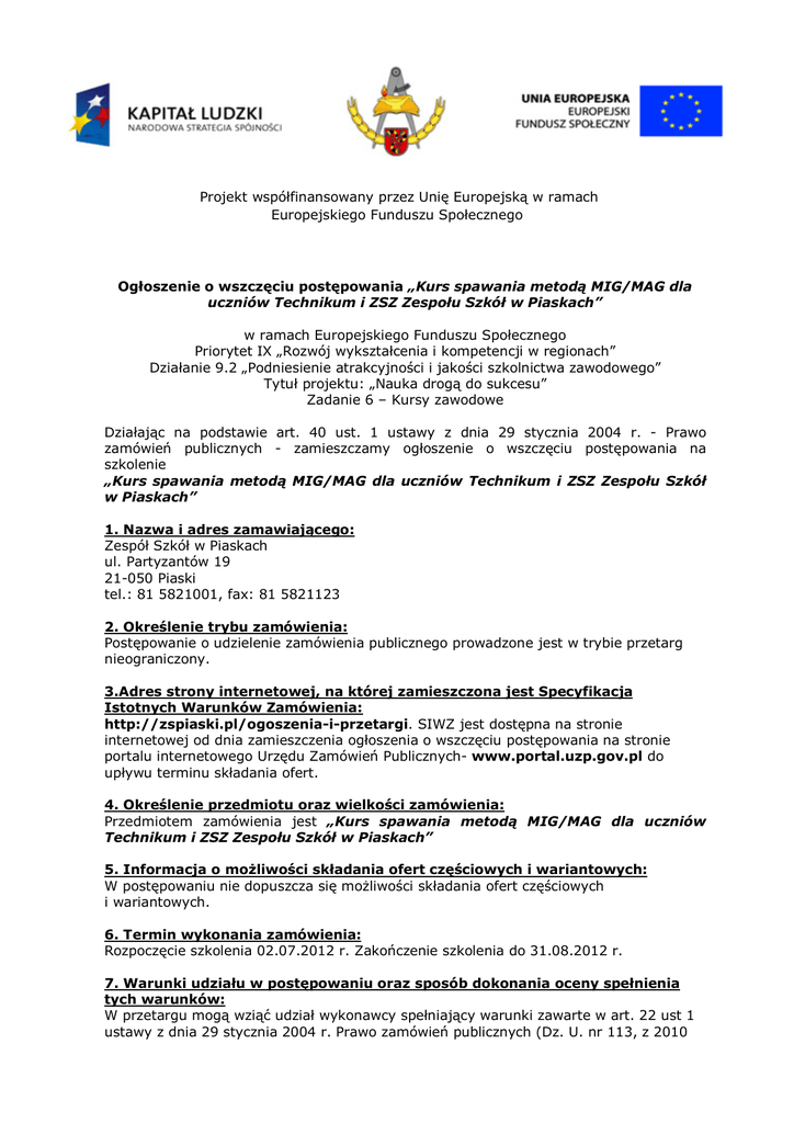 Projekt współfinansowany przez Unię Europejską w ramach Europejskiego Funduszu Społecznego Ogłoszenie o wszczęciu postępowania „Kurs spawania metodą MIG/MAG dla uczniów Technikum i ZSZ Zespołu Szkół w Piaskach” w ramach Europejskiego Funduszu Społecznego Priorytet IX „Rozwój wykształcenia i kompetencji w regionach” Działanie 9.2 „Podniesienie atrakcyjności i jakości szkolnictwa zawodowego” Tytuł projektu: „Nauka drogą do sukcesu” Zadanie 6 – Kursy zawodowe Działając na podstawie art. 40 ust. 1 ustawy z dnia 29 stycznia 2004 r. - Prawo zamówień publicznych - zamieszczamy ogłoszenie o wszczęciu postępowania na szkolenie „Kurs spawania metodą MIG/MAG dla uczniów Technikum i ZSZ Zespołu Szkół w Piaskach” 1. Nazwa i adres zamawiającego: Zespół Szkół w Piaskach ul. Partyzantów 19 21-050 Piaski tel.: 81 5821001, fax: 81 5821123 2. Określenie trybu zamówienia: Postępowanie o udzielenie zamówienia publicznego prowadzone jest w trybie przetarg nieograniczony. 3.Adres strony internetowej, na której zamieszczona jest Specyfikacja Istotnych Warunków Zamówienia: http://zspiaski.pl/ogoszenia-i-przetargi. SIWZ jest dostępna na stronie internetowej od dnia zamieszczenia ogłoszenia o wszczęciu postępowania na stronie portalu internetowego Urzędu Zamówień Publicznych- www.portal.uzp.gov.pl do upływu terminu składania ofert. 4. Określenie przedmiotu oraz wielkości zamówienia: Przedmiotem zamówienia jest „Kurs spawania metodą MIG/MAG dla uczniów Technikum i ZSZ Zespołu Szkół w Piaskach” 5. Informacja o moŜliwości składania ofert częściowych i wariantowych: W postępowaniu nie dopuszcza się moŜliwości składania ofert częściowych i wariantowych. 6. Termin wykonania zamówienia: Rozpoczęcie szkolenia 02.07.2012 r. Zakończenie szkolenia do 31.08.2012 r. 7. Warunki udziału w postępowaniu oraz sposób dokonania oceny spełnienia tych warunków: W przetargu mogą wziąć udział wykonawcy spełniający warunki zawarte w art. 22 ust 1 ustawy z dnia 29 stycznia 2004 r. Prawo zamówień publicznych (Dz. U. nr 113, z 2010 r. poz. 759 ze zmianami)i nie podlegają wykluczeniu na podstawie art. 24 ust. 1 i 2 cyt. ustawy. Ocena spełniania warunków odbędzie się na podstawie dokumentów określonych w Specyfikacji Istotnych Warunków Zamówienia na zasadzie spełnia/ nie spełnia. 8. Dokumenty potwierdzające spełnienie warunków udziału w postępowaniu: 1. Wykonawcy są zobowiązani do złoŜenia następujących oświadczeń i dokumentów: 1) oświadczenie wykonawcy, według wzoru, stanowiącego załącznik nr 2 do niniejszej SIWZ: a) o spełnianiu warunków określonych w art. 22 ust. 1 ustawy, b) o niepodleganiu wykluczeniu na podstawie art. 24 ust. 1 i 2 ustawy. 2) aktualny odpis z właściwego rejestru albo aktualne zaświadczenie o wpisie do ewidencji działalności gospodarczej, (jeŜeli odrębne przepisy wymagają wpisu do rejestru lub zgłoszenia do ewidencji działalności), wystawione nie wcześniej niŜ 6 miesięcy przed upływem terminu składania ofert, 3) aktualne zaświadczenie właściwego naczelnika urzędu skarbowego potwierdzające, Ŝe Wykonawca nie zalega z opłacaniem podatków i opłat lub zaświadczenie, Ŝe uzyskał przewidziane prawem zwolnienie, odroczenie lub rozłoŜenie na raty zaległych płatności, lub wstrzymanie w całości wykonania decyzji właściwego organu - wystawione nie wcześniej niŜ miesiąc przed upływem terminu składania ofert, 4) aktualne zaświadczenie z właściwego oddziału Zakładu Ubezpieczeń Społecznych lub Kasy Rolniczego Ubezpieczenia Społecznego potwierdzające, Ŝe Wykonawca nie zalega z opłacaniem składek na ubezpieczenie zdrowotne lub społeczne, lub zaświadczenie, Ŝe uzyskał przewidziane prawem zwolnienie, odroczenie lub rozłoŜenie na raty zaległych płatności lub wstrzymanie w całości wykonania decyzji właściwego organu – wystawione nie wcześniej niŜ miesiąc przed upływem terminu składania ofert. 2. Ponadto wykonawcy mają dołączyć do oferty następujące dokumenty: a) pisemne oświadczenie wykonawcy dot. doświadczenia i kwalifikacji personelu zawarte na załączonym druku przedstawiającym program i harmonogram zajęć załącznik nr 5 oraz dokumentów potwierdzających posiadane kwalifikacje. Ponadto, jako niezbędne oświadczenia potwierdzające: - przeprowadzenie w latach 2008-2011 minimum 100 kursów spawacza, - umiejętności instruktorów zweryfikowane przez Instytut Spawalnictwa, - akredytację Kuratora Oświaty, - Certyfikat ISO 9001:2000, Atest Instytutu Spawalnictwa i egzaminowania spawaczy, w Gliwicach do prowadzenia szkoleń b) wykaz niezbędnych pomocy naukowych i dydaktycznych na załączonym druku z wyszczególnieniem pomocy dodatkowych wg opisu z rozdziału XIII – załącznik nr 6, c) wypełniony szczegółowo formularz oferty cenowej na załączonym druku – załącznik nr 1 3. JeŜeli wykonawca ma siedzibę lub miejsce zamieszkania poza terytorium Rzeczypospolitej Polskiej, zamiast dokumentów, o których mowa w ust.1 pkt. 2-4 składa dokumenty wystawione w kraju, w którym ma siedzibę lub miejsce zamieszkania, potwierdzające, Ŝe: a) nie otwarto jego likwidacji ani nie ogłoszono upadłości – wystawiony nie wcześniej niŜ 6 miesięcy od terminu składania ofert b) nie zalega z uiszczaniem podatków, opłat, składek na ubezpieczenie społeczne i zdrowotne albo Ŝe uzyskał przewidziane prawem zwolnienie, odroczenie lub rozłoŜenie na raty zaległych płatności lub wstrzymanie w całości wykonania decyzji właściwego organu – wystawiony nie wcześniej niŜ 3 miesiące przed upływem terminu składania ofert 9. Informacja na temat wadium i umowy ramowej: Zamawiający nie wymaga wnoszenia wadium. Zamawiający nie zamierza zawierać umowy ramowej. 10. Kryteria oceny ofert i ich znaczenia: Kryterium oceny ofert stanowi cena 100%. 11. Do kontaktów z wykonawcami uprawnione są osoby: a) p. Julia