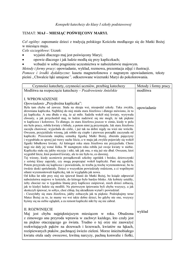 Konspekt katechezy do klasy I szkoły podstawowej TEMAT: MAJ – MIESIĄC POŚWIĘCONY MARYI. Cel ogólny: zapoznanie dzieci z tradycją polskiego Kościoła modlącego się do Matki Bożej w miesiącu maju. Cele szczegółowe: Uczeń: • wyjaśni dlaczego maj jest poświęcony Maryi; • opowie dlaczego i jak ludzie modlą się przy kapliczkach; • wzbudzi w sobie pragnienie uczestnictwa w nabożeństwie majowym. Metody i formy pracy: opowiadanie, wykład, rozmowa, prezentacja zdjęć i ilustracji. Pomoce i środki dydaktyczne: kaseta magnetofonowa z nagranym opowiadaniem, teksty pieśni „Chwalcie łąki umajone”, odkserowane wizerunki Maryi do pokolorowania. Czynności katechety, czynności uczniów, przebieg katechezy Modlitwa na rozpoczęcie katechezy – Pozdrowienie Anielskie Metody i formy pracy modlitwa I. WPROWADZENIE Opowiadanie „Przydrożna kapliczka”: Była tam chyba od zawsze. Stała na skraju wsi, nieopodal szkoły. Taka zwykła, drewniana kapliczka. Najbliżej do niej miała stara Józefowa i dlatego mówiono, że to jej kapliczka. A ona dbała o nią, że aż miło. Sadziła wokół niej kwiaty, wyrywała chwasty, a jak przychodził maj, to ludzie nadziwić się nie mogli, że tak pięknie w kapliczce i kolorowo. To dlatego, że stara Józefowa jeszcze w zimie, kiedy w polu nie było pracy, robiła kwiaty z bibuły, a potem nimi ją przystrajała. Jak stara Józefowa zaczęła chorować, wyjechała do córki, i już tak na dobre nigdy na wieś nie wróciła. Owszem, przyjeżdżała wiosną, jak robiło się ciepło i pierwsze porządki zaczynała od kapliczki. Przecierała miękką szmatką figurkę Matki Bożej, zbierała pajęczyny i wygrabiała ze sporej już trawy suche liście, a w maju jak zwykle pojawiały się wokół figurki bibułkowe kwiaty. Aż któregoś roku stara Józefowa nie przyjechała. Chore nogi nie dały jej wstać łóżka. W następnym roku robiła już swoje kwiaty w niebie. Kapliczka stała się jakby niczyja i nikt, tak jak ona, o nią już nie dbał. Owszem, ktoś wygrabił liście, ktoś postawił kwiaty, ale to nie było to, co dawniej. Tej wiosny, kiedy uczniowie porządkowali szkolny ogródek i boisko, dziewczynki z szóstej klasy zapytały, czy mogą posprzątać wokół kapliczki. Pani się zgodziła. Potem przyjrzała się kapliczce i powiedziała, że trzeba ją trochę wyremontować, bo tu ówdzie deski spróchniały. Dzieci o wszystkim powiedziały rodzicom, a ci wspólnymi siłami wyremontowali kapliczkę, tak że wyglądała jak nowa. Od kilku lat nikt przy niej nie śpiewał litanii do Matki Bożej, bo ksiądz odprawiał nabożeństwa majowe w kościele, do którego było bardzo blisko. Ale kobiety ustaliły, żeby chociaż raz w tygodniu litanię przy kapliczce zaśpiewać, niech dzieci zobaczą, jak to kiedyś ludzie się modlili. Na pierwszym śpiewaniu byli chyba wszyscy, a jak skończyli śpiewać, to sołtys, choć chłop, łzę ukradkiem wytarł i powiedział: - Cieszyłaby się stara Józefowa, jakby zobaczyła jak tu pięknie. Podziękujmy teraz Matce Bożej za to, że mamy we wsi takie dobre dzieci, bo gdyby nie one, wszyscy byśmy się na siebie oglądali, a za remont kapliczki nikt by się nie zabrał. opowiadanie II. ROZWINIĘCIE wykład Maj jest chyba najpiękniejszym miesiącem w roku. Obudzona z zimowego snu przyroda wprawia w zachwyt każdego, kto czuły jest na piękno otaczającego go świata. Trudno o tej orze nie zauważyć rozkwitających pąków na drzewach i krzewach, kwiatów na łąkach, rozśpiewanych ptaków, pachnącej świeżo zieleni. Morze śnieżnobiałego kwiatu otula sady owocowe, kwitną narcyzy, pachną konwalie i fiołki, łąki złocą się od jaskrów. Cała ziemia wygląda jak wspaniale utkany dywan, rzucony pod stopy Matki Bożej w miesiącu Jej poświęconym. Wydaje się, że rozbudzona kolorami i zapachem, ciepłym wiatrem i śpiewem ptaków ziemia, chce oddać cześć Tej, która całym sercem ją ukochała. Żyła bowiem na niej, chodziła po ziemskich drogach, przeżywała różne kłopoty, jakie są udziałem każdej ziemskiej matki. W wioskach, pośród lasów, łąk, na rozstajach i przy drogach stoją stare i nowe kapliczki ku czci Matki Bożej, która dla wszystkich ludzi żyjących na ziemi była ideałem najwspanialszego piękna i wielkości. Kapliczki te są drogowskazami naszego życia tu, na ziemi. Mniej czy piękniej wykonane, wszystkie są drogie, bo w nich jest myśl, że oprócz ziemskiej matki mamy też Matkę w niebie. Katecheta prezentuje ilustracje lub zdjęcia różnych kapliczek rozsianych prezentacja zdjęć po polskiej ziemi. Zwraca uwagę na obecność w kapliczkach obrazu lub i ilustracji figurki Maryi. W wielu wsiach, gdzie ludzie mają daleko do kościoła, w maju wieczorną porą przy kapliczkach niesie się pod wyżyny nieba Litania Loretańska i żarliwa prośba Pod Twoją obronę. Ludzie gromadzą się przy kapliczkach na piękne nabożeństwo, kiedy szczególnie miło brzmi znana pieśń: „Chwalcie łąki umajone, góry, doliny zielone, chwalcie cieniste gaiki, źródła i kręte strumyki…”. Naród polski nazywany jest narodem maryjnym, bo kult Matki Bożej jest u nas tak żywiołowy, tak głęboko zapuścił korzenie w ludzkich sercach, że trudno byłoby go stamtąd wyrwać. Maryja, Królowa Polski z Jasnej Góry, zawsze czuwała nad narodem polskim, gdy przeżywał trudne chwile wojen, powstań, głodów, pożarów, powodzi. Katecheta rozdaje dzieciom tekst i uczy melodii. pieśni „Chwalcie łąki umajone” nauka pieśni III. PODSUMOWANIE Katecheta w rozmowie z dziećmi przypomina najważniejsze myśli katechezy i zaprasza na nabożeństwo. W każdym białostockim kościele w maju odprawiane jest nabożeństwo ku czci Matki Bożej. Zachęcam was do tego, byście w nim uczestniczyli. W naszej parafii odbywa się ono codziennie o godz….. rozmowa Jeśli ktoś nie może pójść do kościoła, niech postara się pomodlić z kimś blisk