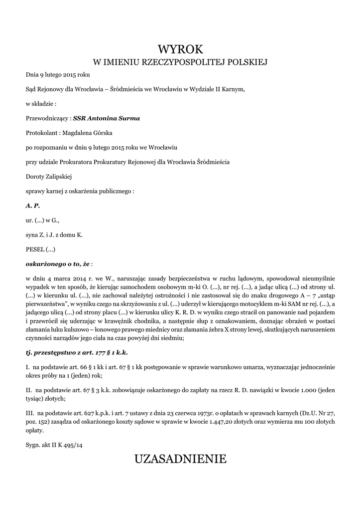 WYROK W IMIENIU RZECZYPOSPOLITEJ POLSKIEJ Dnia 9 lutego 2015 roku Sąd Rejonowy dla Wrocławia – Śródmieścia we Wrocławiu w Wydziale II Karnym, w składzie : Przewodniczący : SSR Antonina Surma Protokolant : Magdalena Górska po rozpoznaniu w dniu 9 lutego 2015 roku we Wrocławiu przy udziale Prokuratora Prokuratury Rejonowej dla Wrocławia Śródmieścia Doroty Zalipskiej sprawy karnej z oskarżenia publicznego : A. P. ur. (...) w G., syna Z. i J. z domu K. PESEL (...) oskarżonego o to, że : w dniu 4 marca 2014 r. we W., naruszając zasady bezpieczeństwa w ruchu lądowym, spowodował nieumyślnie wypadek w ten sposób, że kierując samochodem osobowym m-ki O. (...), nr rej. (...), a jadąc ulicą (...) od strony ul. (...) w kierunku ul. (...), nie zachował należytej ostrożności i nie zastosował się do znaku drogowego A – 7 „ustąp pierwszeństwa”, w wyniku czego na skrzyżowaniu z ul. (...) uderzył w kierującego motocyklem m-ki SAM nr rej. (...), a jadącego ulicą (...) od strony placu (...) w kierunku ulicy K. R. D. w wyniku czego stracił on panowanie nad pojazdem i przewrócił się uderzając w krawężnik chodnika, a następnie słup z oznakowaniem, doznając obrażeń w postaci złamania łuku kulszowo – łonowego prawego miednicy oraz złamania żebra X strony lewej, skutkujących naruszeniem czynności narządów jego ciała na czas powyżej dni siedmiu; tj. przestępstwo z art. 177 § 1 k.k. I. na podstawie art. 66 § 1 kk i art. 67 § 1 kk postępowanie w sprawie warunkowo umarza, wyznaczając jednocześnie okres próby na 1 (jeden) rok; II. na podstawie art. 67 § 3 k.k. zobowiązuje oskarżonego do zapłaty na rzecz R. D. nawiązki w kwocie 1.000 (jeden tysiąc) złotych; III. na podstawie art. 627 k.p.k. i art. 7 ustawy z dnia 23 czerwca 1973r. o opłatach w sprawach karnych (Dz.U. Nr 27, poz. 152) zasądza od oskarżonego koszty sądowe w sprawie w kwocie 1.447,20 złotych oraz wymierza mu 100 złotych opłaty. Sygn. akt II K 495/14 UZASADNIENIE W toku postępowania w sprawie ustalono następujący stan faktyczny: Dnia 4 marca 2014r. około godz. 19.00, A. P., poruszający się samochodem osobowym m-ki O. (...), nr rej. (...), jechał ul. ulicą (...) od strony ul. (...) w kierunku ul. (...). (Dowód: wyjaśnienia oskarżonego – k. 60, 98). Dojeżdżając do skrzyżowania A. P. zwolnił, rozejrzał się, lecz nie zachował należytej ostrożności, skutkiem czego nie zastosował się do znaku drogowego A – 7 „ustąp pierwszeństwa”. (Dowód: wyjaśnienia oskarżonego – k. 60, 98, zeznania świadka R. D. – k. 26, 99). W tym czasie, ulicą (...) od strony placu (...) w kierunku ulicy (...) poruszał się kierujący motocyklem m-ki SAM nr rej. (...) R. D.. (Dowód: zeznania świadka R. D. – k. 26, 99, zeznania świadka W. K. – k. 56, 120). Wjeżdżając na skrzyżowanie z ul. Poniatowskiego J. P. uderzył w motocykl kierowany przez R. D., który stracił panowanie nad pojazdem i przewrócił się uderzając w krawężnik chodnika oraz słup z oznakowaniem. R. D. nie przyczynił się do wypadku. (Dowód: zeznania świadka R. D. – k. 26, 99, zeznania świadka W. K. – k. 56, 120, opinia biegłego z zakresu rekonstrukcji wypadków komunikacyjnych – k. 102- 112, 119, protokół oględzin miejsca wypadku drogowego - k. 3 – 4). Po zdarzeniuA. P.trzymał się za głowę, powtarzał słowa „przepraszam”. Podczas udzielania pomocy R. D. przez zespół pogotowia ratunkowego, J. P. podszedł do pokrzywdzonego, przeprosił za zaistniałą sytuację i potwierdził, że do zdarzenia doszło z jego winy. Mówił, że nie zauważył motocyklisty. (Dowód: zeznania świadka R. D. – k. 26, 99, zeznania świadka W. K. – k. 56, 120). Obaj uczestnicy wypadku byli trzeźwi. (Dowód: protokół badania stanu trzeźwości – k. 10, 11). W chwili zdarzenia R. D. nie miał prawa jazdy kategorii A, które mu odebrano z uwagi na ilość punktów karnych. Uprawnienia do kierowania pojazdami kategorii A zostały R. D. cofnięte decyzją Prezydenta W. z dnia 22 lutego 2013r. po uzyskaniu negatywnego wyniku egzaminu sprawdzającego kwalifikacje kierowcy. Przewrócono je, natomiast w dniu 22 lipca 2014r. (Dowód: zeznania świadka R. D. – k. 99, informacja UM W. – k. 128). W wyniku zdarzenia R. D.doznał obrażeń w postaci złamania łuku kulszowo – łonowego prawego miednicy oraz złamania żebra X strony lewej. Obrażenia te skutkowały naruszeniem czynności narządów jego ciała na czas powyżej dni siedmiu. (Dowód: zeznania świadka R. D. – k. 26, 99, opinia sądowo – lekarska – k. 42 – 44). W wyniku niezbędnego leczeniaR. D.przebywał na zwolnieniu lekarskim poprzez okres 7 miesięcy. Po powrocie do pracy został zwolniony. Pokrzywdzony w dalszym ciągu korzysta z nieodpłatnej rehabilitacji, lecz odczuwa bóle miednicy. Podczas leczenia korzystał, natomiast, z pomocy pielęgniarki, za co płacił 1500 zł. Decyzją (...) z dnia 11 czerwca 2014r. – z ubezpieczenia następstw nieszczęśliwych wypadków -R. D.wypłacono 1300 zł . Tytułem kosztów naprawy pojazdu oraz uszkodzeń fachowej odzieży używanej przez pokrzywdzonego podczas zdarzenia, R. D.otrzymał kwotę 18.122,39 zł z ubezpieczeniaJ. P. w Towarzystwie (...). Wartość uszkodzeń motocykla R. D.wycenił na około 25.000 zł. Na jego naprawę przeznaczył już 7.000 zł. Podczas zdarzenia otarciu uległ przedni zderzak i pokrywa silnika O. (...). (Dowód: zeznania świadka R. D. – k. 26, 99, 294, protokół oględzin pojazdu – k. 7 – 8, akta szkodowe (...) – k. 175, akta szkodowe WARTA – k. 270). Oskarżony J. P. to sześćdziesięciotrzyletni wdowiec, ojciec dorosłego dziecka. J. P. uzyskał wykształcenie wyższe (Wojskowa Akademia (...)) i z zawodu jest inżynierem elektromechanikiem. Obecnie – jako oficer zawodowy jest w stanie spoczynku. Zgodnie z własnym oświadczeniem, J. P. nie był w przeszłości leczony psychiatrycznie, neurologicznie 