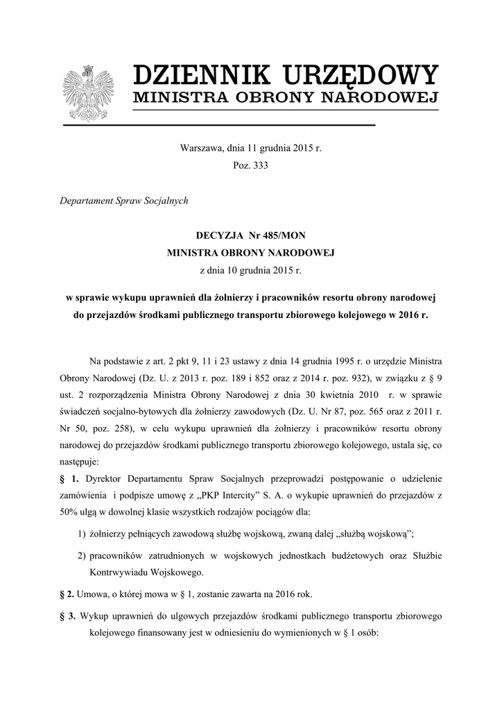 Warszawa, dnia 11 grudnia 2015 r. Poz. 333 Departament Spraw Socjalnych DECYZJA Nr 485/MON MINISTRA OBRONY NARODOWEJ z dnia 10 grudnia 2015 r. w sprawie wykupu uprawnień dla żołnierzy i pracowników resortu obrony narodowej do przejazdów środkami publicznego transportu zbiorowego kolejowego w 2016 r. Na podstawie z art. 2 pkt 9, 11 i 23 ustawy z dnia 14 grudnia 1995 r. o urzędzie Ministra Obrony Narodowej (Dz. U. z 2013 r. poz. 189 i 852 oraz z 2014 r. poz. 932), w związku z § 9 ust. 2 rozporządzenia Ministra Obrony Narodowej z dnia 30 kwietnia 2010 r. w sprawie świadczeń socjalno-bytowych dla żołnierzy zawodowych (Dz. U. Nr 87, poz. 565 oraz z 2011 r. Nr 50, poz. 258), w celu wykupu uprawnień dla żołnierzy i pracowników resortu obrony narodowej do przejazdów środkami publicznego transportu zbiorowego kolejowego, ustala się, co następuje: § 1. Dyrektor Departamentu Spraw Socjalnych przeprowadzi postępowanie o udzielenie zamówienia i podpisze umowę z „PKP Intercity” S. A. o wykupie uprawnień do przejazdów z 50% ulgą w dowolnej klasie wszystkich rodzajów pociągów dla: 1) żołnierzy pełniących zawodową służbę wojskową, zwaną dalej „służbą wojskową”; 2) pracowników zatrudnionych w wojskowych jednostkach budżetowych oraz Służbie Kontrwywiadu Wojskowego. § 2. Umowa, o której mowa w § 1, zostanie zawarta na 2016 rok. § 3. Wykup uprawnień do ulgowych przejazdów środkami publicznego transportu zbiorowego kolejowego finansowany jest w odniesieniu do wymienionych w § 1 osób: 1) pełniących służbę wojskową w wojskowych jednostkach budżetowych, instytucjach cywilnych oraz jednostkach organizacyjnych, dla których Minister Obrony Narodowej jest organem założycielskim, albo nadzorowanych przez Ministra Obrony Narodowej, nie będących jednostkami budżetowymi – przez wojskowe jednostki budżetowe, na zaopatrzeniu których żołnierz pozostaje, w ramach środków przeznaczonych na wydatki z tytułu krajowych podróży służbowych; 2) zatrudnionych w wojskowych jednostkach budżetowych oraz Służbie Kontrwywiadu Wojskowego – ze środków właściwych dysponentów przeznaczonych na wydatki z tytułu krajowych podróży służbowych. § 4. Legitymacje uprawniające do ulgowych przejazdów zostaną wykupione dla żołnierzy pełniących służbę wojskową oraz pracowników, w ilości zgłoszonej przez wojskowe jednostki budżetowe oraz Służbę Kontrwywiadu Wojskowego. § 5. W celu realizacji postanowień umowy, o której mowa w § 1, Dyrektor Departamentu Spraw Socjalnych przekaże Dyrektorowi Generalnemu Ministerstwa Obrony Narodowej szczegółowy podział kwot z zakresu wykupu uprawnień do ulgowych przejazdów środkami publicznego transportu zbiorowego kolejowego, w ujęciu dysponentów oraz rozdziałów i paragrafów klasyfikacji określonej w rozporządzeniu Ministra Finansów z dnia 2 marca 2010 r. w sprawie szczegółowej klasyfikacji dochodów, wydatków, przychodów i rozchodów oraz środków pochodzących ze źródeł zagranicznych (Dz. U. z 2014 r. poz. 1053, z późn. zm.1)). § 6. Dyrektor Departamentu Spraw Socjalnych: 1) wyda wytyczne w sprawie zasad korzystania z uprawnień do ulgowych przejazdów środkami publicznego transportu zbiorowego kolejowego oraz prześle je do komórek i jednostek organizacyjnych resortu obrony narodowej, w celu zapoznania żołnierzy zawodowych i pracowników, którzy zadeklarowali chęć posiadania tego uprawnienia; 2) przygotuje i przedstawi, w terminie do dnia 10 grudnia 2016 r., propozycje w zakresie wykupu uprawnień na 2017 r. § 7. Decyzja wchodzi w życie z dniem ogłoszenia. Minister Obrony Narodowej: A. Macierewicz 1) Zmiany tekstu jednolitego wymienionego rozporządzenia zostały ogłoszone w Dz. U. z 2014 r. poz. 1382 i 1952 oraz z 2015 r. poz. 931, 1470 i 1987.