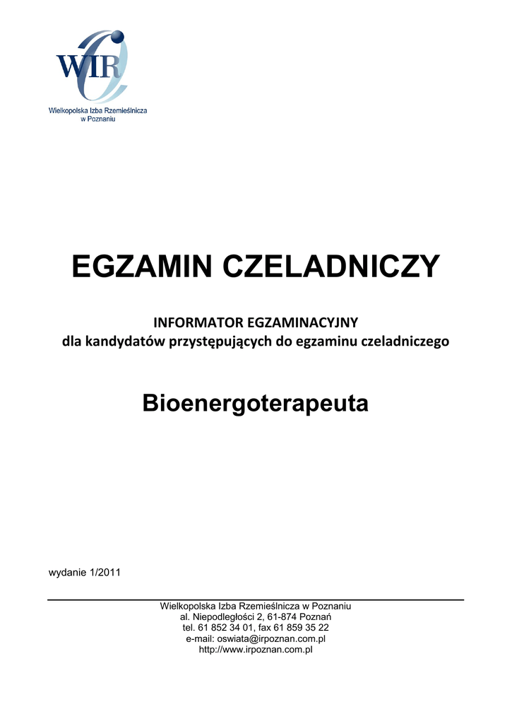 EGZAMIN CZELADNICZY INFORMATOR EGZAMINACYJNY dla kandydatów przystępujących do egzaminu czeladniczego Bioenergoterapeuta wydanie 1/2011 Wielkopolska Izba Rzemieślnicza w Poznaniu al. Niepodległości 2, 61-874 Poznań tel. 61 852 34 01, fax 61 859 35 22 e-mail: [email protected] http://www.irpoznan.com.pl Informacje ogólne dla kandydatów ubiegających się o przystąpienie do egzaminu czeladniczego Egzamin czeladniczy składa się z dwóch etapów: 1. Etap praktyczny: Termin i miejsce etapu praktycznego ustala przewodniczący zespołu egzaminacyjnego. Czas trwania etapu praktycznego nie może być dłuższy niż 24 godziny łącznie, w ciągu trzech dni. Zgłaszając się na etap praktyczny, kandydat zobowiązany jest posiadać: skierowanie na etap praktyczny, dowód tożsamości /przedkłada również na egzaminie teoretycznym/ stosowną odzież roboczą, własne narzędzia stosowne według skierowania na egzamin 2. Etap teoretyczny składa się z dwóch części: Część pisemna jest testem wyboru, który polega na udzieleniu przez kandydata odpowiedzi na pytania z zakresu następujących tematów: 1) rachunkowość zawodowa, 2) dokumentacja działalności gospodarczej, 3) rysunek zawodowy, 4) przepisy i zasady bezpieczeństwa i higieny pracy oraz ochrony przeciwpożarowej, 5) podstawowe zasady ochrony środowiska, 6) podstawowe przepisy prawa pracy, 7) podstawowa problematyka z zakresu podejmowania działalności gospodarczej i zarządzania przedsiębiorstwem W każdym temacie jest siedem pytań, natomiast każde pytanie zawiera trzy propozycje odpowiedzi, z których jedna jest prawidłowa. Część ustna polega na udzieleniu przez kandydata odpowiedzi na pytania z zakresu następujących tematów: 1) technologia 2) maszynoznawstwo 3) materiałoznawstwo Każdy temat zawiera 3 pytania, zatem kandydat łącznie odpowiada na 9 pytań z tej części. 2 I. Zadania praktyczne do wykonania na egzaminie czeladniczym 1. 2. 3. 4. 5. 6. 7. Pokazanie jednej z metod uwrażliwiania czakry dłoni i opisanie jej. Przeprowadzenie zabiegu bioenergoterapii i omówienie go. Pokazanie metody oczyszczania czakry splotu słonecznego. Pokazanie metody oczyszczania ciała energetycznego człowieka. Wykonanie niemedycznej diagnostyki biopola klienta. Zademonstrowanie sposobu likwidacji blokady energetycznej. Zademonstrowanie sposobu przeprowadzenia zabiegu przy pomocy technik implikacji, aplikacji i passów. 8. Wskazanie na ciele klienta umiejscowienia poszczególnych czakr. 9. Pokazanie i omówienie metody mostkowania czakr. 10. Pokazanie i opisanie ćwiczenia jakie jest stosowane w celu podniesienia zdolności bioenergetycznych. 11. Pokazanie kolejnych czynności, które powinien wykonać bioenergoterapeuta przed, w czasie i po zabiegu bioenergetycznym. 12. Zademonstrowanie metody jaka jest stosowana w bólach migrenowych. Podczas etapu praktycznego egzaminu zdający wykonuje 3 zadania. II. Wykaz pytań do części ustnej egzaminu z tematu: TECHNOLOGIA 1. Czynniki zewnętrzne mające wpływ na efekt pracy bioterapeuty. 2. Metody zabezpieczania się i regeneracji po zabiegach bioenergoterapeutycznych. 3. Zasady oczyszczania pola energetycznego człowieka. 4. Znaczenia Polarity w bioenergoterapii. 5. Polscy przedstawiciele bioenergoterapii. 6. Etymologia określenia bioenergoterapia i bioterapia. 7. Definicja biopola. 8. Metody działań równoważących biopole. 9. Ogólne wiadomości o aurze, aura jako pole energetyczne człowieka. 10. Opisz zjawisko telepatii. 11. Metody obserwacji aury. 12. Zabieg oczyszczania aury. 13. Co to jest telebioenergoterapia. 14. Ciała subtelne człowieka i ich charakteryzacja. 15. Metody i zasady oczyszczania czakramów. 16. Co to jest czakrami (definicja)? 17. Teoria mostkowania i harmonizacji czakramów. 18. Teoria mostkowania i harmonizacji czakr. 19. Metody uzdrawiania (czakroterapia). 20. Co może wpłynąć na rozwój czakramów? 21. Opisz usytuowanie i funkcję czakry I. 22. Opisz usytuowanie i funkcję czakry II. 23. Opisz usytuowanie i funkcję czakry III. 24. Opisz usytuowanie i funkcję czakry IV. 25. Opisz usytuowanie i funkcję czakry V. 26. Opisz usytuowanie i funkcję czakry VI. 27. Opisz usytuowanie i funkcję czakry VII. 28. Podstawowa wiedza na temat kundalini, zasady jej funkcjonowania. 29. Czakroterapia wg Scherwooda. 30. Główne założenia „tajemnicy Huny” wg Longa. 3 MATERIAŁOZNAWSTWO 1. Osobowościowe cechy bioenergoterapeuty. 2. Zalecenia i przeciwwskazania w wykonywaniu zabiegów bioenergoterapii. 3. Zasady bezpiecznej pracy bioenergoterapeuty. 4. Higiena życia bioenergoterapeuty. 5. BHP bioenergoterapeuty. 6. Zasady i wymogi BHP w pracy bioterapeuty. 7. Warunki lokalowe w pracy bioenergoterapeuty. 8. Definicja zdrowia i choroby. 9. Choroby cywilizacyjne. 10. Definicja bioenergii. 11. Definicja bioenergoterapii. 12. Mechanizmy samouzdrawiania człowieka. 13. Wizualizacja. 14. Znaczenie wizualizacji w pracy bioenergoterapeuty. 15. Przyczyny powstawania zaburzeń w układzie energetycznym. 16. Przyczyny zewnętrzne i pozazmysłowe powstawania zaburzeń. 17. Metody równoważenia struktur energetycznych organizmu. 18. Metody eliminacji zaburzeń. 19. Metody mentalne eliminacji zaburzeń. 20. Stres biologiczny. 21. Relaks i jego znaczenie w bioenergoterapii, korzystne skutki relaksacji. 22. Metody relaksacji. 23. Znaczenie mantr. 24. Stan alfa – omówienie kilku metod wprowadzenia się w ten stan. 25. Medytacja i jej wpływ na zdrowie, zastosowanie w bioenergoterapii, niebezpieczeństwa wynikające z jej stosowania. 26. Religijność i wiara – jej znaczenie w bioenergoterapii. 27. Hipnoza i jej zastosowanie w bioenergoterapii. 28. Afirmacje i zasady ich tworzenia. 29. Empatia i jej znaczenie w bioenergoterapii. MASZYNOZNAWSTWO Zdefiniuj określenie asertywność. Komunikacja i kontakt z klientem. Co to jest refleksoterapia. Podaj podstawowe kolory głównych czakr. Na czym polega stabilizacja energii? Na czym polega metoda Reiki? BHP miej