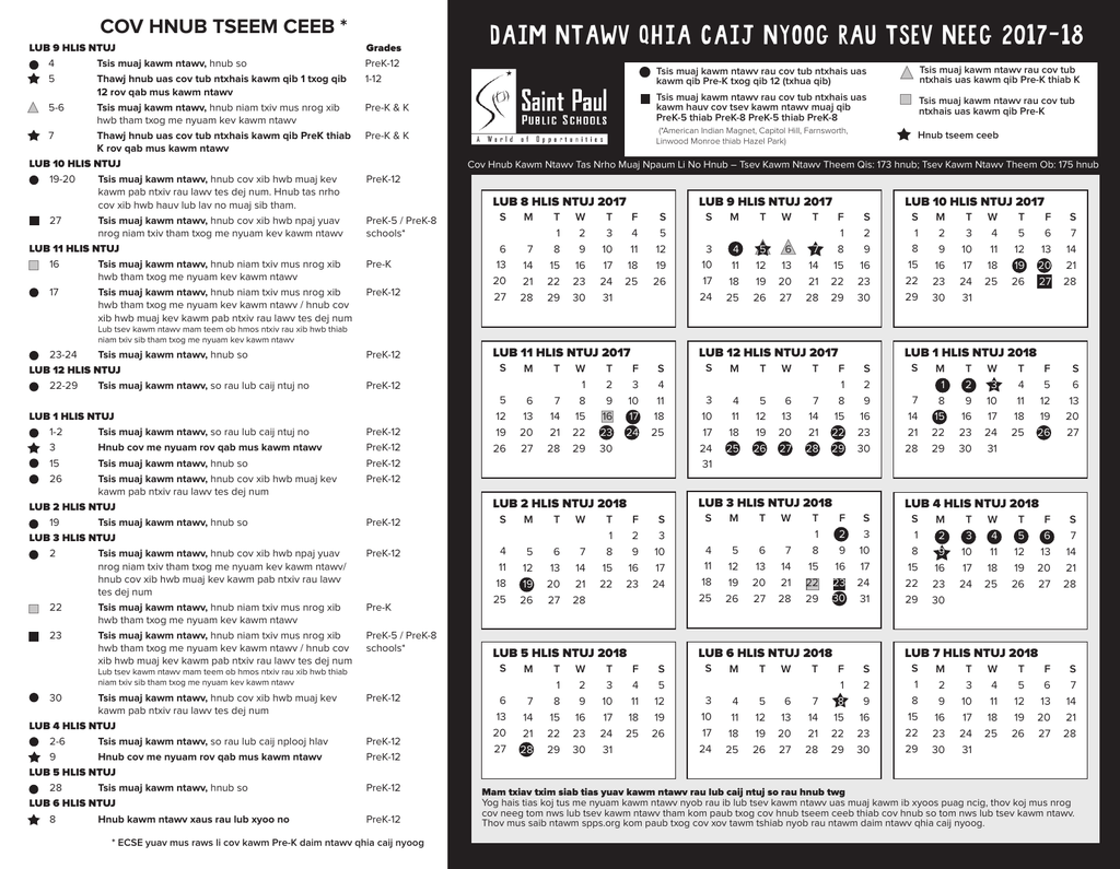COV HNUB TSEEM CEEB * LUB 9 HLIS NTUJ 4 Tsis muaj kawm ntawv, hnub so 5 Thawj hnub uas cov tub ntxhais kawm qib 1 txog qib 12 rov qab mus kawm ntawv 5-6 Tsis muaj kawm ntawv, hnub niam txiv mus nrog xib hwb tham txog me nyuam kev kawm ntawv 7 Thawj hnub uas cov tub ntxhais kawm qib PreK thiab K rov qab mus kawm ntawv LUB 10 HLIS NTUJ 19-20 Tsis muaj kawm ntawv, hnub cov xib hwb muaj kev kawm pab ntxiv rau lawv tes dej num. Hnub tas nrho cov xib hwb hauv lub lav no muaj sib tham. 27 Tsis muaj kawm ntawv, hnub cov xib hwb npaj yuav nrog niam txiv tham txog me nyuam kev kawm ntawv LUB 11 HLIS NTUJ 16 Tsis muaj kawm ntawv, hnub niam txiv mus nrog xib hwb tham txog me nyuam kev kawm ntawv 17 Tsis muaj kawm ntawv, hnub niam txiv mus nrog xib hwb tham txog me nyuam kev kawm ntawv / hnub cov xib hwb muaj kev kawm pab ntxiv rau lawv tes dej num Grades PreK-12 1-12 23-24 Tsis muaj kawm ntawv, hnub so LUB 12 HLIS NTUJ 22-29 Tsis muaj kawm ntawv, so rau lub caij ntuj no DAIM NTAWV QHIA CAIJ NYOOG RAU TSEV NEEG 2017-18 Tsis muaj kawm ntawv rau cov tub ntxhais uas kawm qib Pre-K thiab K Tsis muaj kawm ntawv rau cov tub ntxhais uas kawm qib Pre-K txog qib 12 (txhua qib) Tsis muaj kawm ntawv rau cov tub ntxhais uas Pre-K & K Tsis muaj kawm ntawv rau cov tub ntxhais uas kawm qib Pre-K kawm hauv cov tsev kawm ntawv muaj qib and PreK-8 schools PreK-5 thiab PreK-8 PreK-5 thiab PreK-8 (*American Indian Magnet, Capitol Hill, Farnsworth, (*American Indian Magnet, Capitol Hill, Farnsworth, Linwood Monroe and Hazel Park) Pre-K & K Linwood Monroe thiab Hazel Park) Hnub tseem ceeb Cov Hnub Kawm Ntawv Tas Nrho Muaj Npaum Li No Hnub – Tsev Kawm Ntawv Theem Qis: 173 hnub; Tsev Kawm Ntawv Theem Ob: 175 hnub PreK-12 LUB 8 HLIS NTUJ 2017 S M PreK-12 6 13 20 27 7 14 21 28 PreK-12 LUB 11 HLIS NTUJ 2017 PreK-5 / PreK-8 schools* Pre-K T 1 8 15 22 29 W 2 9 16 23 30 T 3 10 17 24 31 F 4 11 18 25 LUB 9 HLIS NTUJ 2017 S 5 12 19 26 S M T W T 3 10 17 24 4 11 18 25 5 12 19 26 6 13 20 27 7 14 21 28 LUB 10 HLIS NTUJ 2017 F 1 8 15 22 29 S 2 9 16 23 30 S 1 8 15 22 29 M 2 9 16 23 30 T 3 10 17 24 31 W 4 11 18 25 T 5 12 19 26 F 6 13 20 27 S 7 14 21 28 F 5 12 19 26 S 6 13 20 27 Lub tsev kawm ntawv mam teem ob hmos ntxiv rau xib hwb thiab niam txiv sib tham txog me nyuam kev kawm ntawv LUB 1 HLIS NTUJ 1-2 Tsis muaj kawm ntawv, so rau lub caij ntuj no 3 Hnub cov me nyuam rov qab mus kawm ntawv 15 Tsis muaj kawm ntawv, hnub so 26 Tsis muaj kawm ntawv, hnub cov xib hwb muaj kev kawm pab ntxiv rau lawv tes dej num LUB 2 HLIS NTUJ 19 Tsis muaj kawm ntawv, hnub so LUB 3 HLIS NTUJ 2 Tsis muaj kawm ntawv, hnub cov xib hwb npaj yuav nrog niam txiv tham txog me nyuam kev kawm ntawv/ hnub cov xib hwb muaj kev kawm pab ntxiv rau lawv tes dej num 22 Tsis muaj kawm ntawv, hnub niam txiv mus nrog xib hwb tham txog me nyuam kev kawm ntawv 23 Tsis muaj kawm ntawv, hnub niam txiv mus nrog xib hwb tham txog me nyuam kev kawm ntawv / hnub cov xib hwb muaj kev kawm pab ntxiv rau lawv tes dej num Tsis muaj kawm ntawv, hnub cov xib hwb muaj kev kawm pab ntxiv rau lawv tes dej num LUB 4 HLIS NTUJ 2-6 Tsis muaj kawm ntawv, so rau lub caij nplooj hlav 9 Hnub cov me nyuam rov qab mus kawm ntawv LUB 5 HLIS NTUJ 28 Tsis muaj kawm ntawv, hnub so LUB 6 HLIS NTUJ 8 Hnub kawm ntawv xaus rau lub xyoo no M T 5 12 19 26 6 13 20 27 7 14 21 28 PreK-12 PreK-12 PreK-12 PreK-12 PreK-12 W 1 8 15 22 29 T 2 9 16 23 30 F 3 10 17 24 LUB 12 HLIS NTUJ 2017 S 4 11 18 25 S M T W PreK-12 4 11 18 25 5 12 19 26 6 13 20 27 7 14 21 28 Pre-K PreK-5 / PreK-8 schools* PreK-12 PreK-12 PreK-12 PreK-12 PreK-12 * ECSE yuav mus raws li cov kawm Pre-K daim ntawv qhia caij nyoog T 1 8 15 22 F 2 9 16 23 S 3 10 17 24 LUB 5 HLIS NTUJ 2018 S M 6 13 20 27 7 14 21 28 T 1 8 15 22 29 W 2 9 16 23 30 T 3 10 17 24 31 F 4 11 18 25 S M T W T 3 10 17 24 31 4 11 18 25 5 12 19 26 6 13 20 27 7 14 21 28 F 1 8 15 22 29 LUB 1 HLIS NTUJ 2018 S 2 9 16 23 30 LUB 3 HLIS NTUJ 2018 LUB 2 HLIS NTUJ 2018 PreK-12 Lub tsev kawm ntawv mam teem ob hmos ntxiv rau xib hwb thiab niam txiv sib tham txog me nyuam kev kawm ntawv 30 S S M T W 4 11 18 25 5 12 19 26 6 13 20 27 7 14 21 28 S 3 10 17 24 31 F 1 8 15 22 29 S 2 9 16 23 30 LUB 6 HLIS NTUJ 2018 S 5 12 19 26 S M T W T 3 10 17 24 4 11 18 25 5 12 19 26 6 13 20 27 7 14 21 28 7 14 21 28 M 1 8 15 22 29 T 2 9 16 23 30 W 3 10 17 24 31 T 4 11 18 25 LUB 4 HLIS NTUJ 2018 F 2 9 16 23 30 T 1 8 15 22 29 S S 1 8 15 22 29 M 2 9 16 23 30 T 3 10 17 24 W 4 11 18 25 T 5 12 19 26 F 6 13 20 27 S 7 14 21 28 LUB 7 HLIS NTUJ 2018 S 1 8 15 22 29 M 2 9 16 23 30 T 3 10 17 24 31 W 4 11 18 25 T 5 12 19 26 F 6 13 20 27 S 7 14 21 28 Mam txiav txim siab tias yuav kawm ntawv rau lub caij ntuj so rau hnub twg Yog hais tias koj tus me nyuam kawm ntawv nyob rau ib lub tsev kawm ntawv uas muaj kawm ib xyoos puag ncig, thov koj mus nrog cov neeg tom nws lub tsev kawm ntawv tham kom paub txog cov hnub tseem ceeb thiab cov hnub so tom nws lub tsev kawm ntawv. Thov mus saib ntawm spps.org kom paub txog cov xov tawm tshiab nyob rau ntawm daim ntawv qhia caij nyoog.
