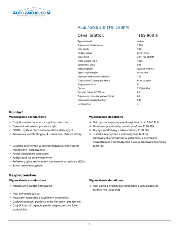 Audi A6/S6 2.0 TFSI 180KM Cena (brutto): 169 900 zł Typ nadwozia sedan Pojemność silnika (ccm) 1984 Moc silnika 180 Rodzaj paliwa benzynowy Typ silnika 2.0 TFSI 180KM Masa własna (kg.) 1615 Ładowność (kg.) 505 Klasa/segment wyższa średnia Typ skrzyni biegów manualna Prędkość maksymalna (km/h) 232 Częstotliwość przeglądu (km.) Brak danych Przyspieszenie (s.) 8 Opony 225/60 R16 Zużycie paliwa (l/100km.) 6.5 Pojemność zbiornika paliwa (litry) 65 Pojemność bagażnika (litry) 530 Liczba drzwi 4 Komfort Wyposażenie standardowe Wyposażenie dodatkowe ✓ Czujnik zmierzchu wraz z czujnikiem deszczu ✕ Elektryczne wspomaganie domykania drzwi 2840 PLN ✓ Dywaniki welurowe z przodu i z tyłu ✕ Klimatyzacja automatyczna 4 - strefowa 3130 PLN ✓ ISOFIX - system mocowania fotelików dziecięcych ✕ Kluczyk komfortowy - advanced key 3130 PLN ✓ Kierownica wielofunkcyjna, 4 - ramienna, obszyta skórą ✕ Lusterka zewnętrzne z automatyczną funkcją przeciwoślepieniowąTylko w połączeniu z lusterkiem wewnętrznym z automatyczną funkcją przeciwoślepieniową ✓ Lusterka zewnętrzne w kolorze nadwozia, elektrycznie 1280 PLN regulowane i ogrzewane\n ✓ Pakiet Oświetlenia Wnętrza\n ✓ Podłokietnik ze schowkiem tył\n ✓ Reflektory tylne ze światłami hamowania w technice LED\n ✓ Szyby termoizolacyjne\n Bezpieczeństwo Wyposażenie standardowe Wyposażenie dodatkowe ✓ Adaptacyjne światła hamowania ✕ Audi parking system plus (przód/tył) z wizualizacją na ekranie MMI 3760 PLN ✓ Audi pre sense basic\n ✓ Autoalarm fabryczny z czujnikiem przechyłu\n ✓ Czołowe poduszki powietrzne dla kierowcy i pasażera\n ✓ Czujnik kontroli zapięcia pasów bezpieczeństwa foteli przednich\n 1 ✓ Hamulec postojowy, elektromechaniczny z asystentem podjazdu\n ✓ Kurtyny powietrzne chroniące głowy pasażerów z przodu i z tyłu\n ✓ Poduszki powietrzne boczne przednie\n ✓ Reflektory ksenonowe plus ze światłami do jazdy dziennej LED (zawierają układ zmywania reflektorów)\n ✓ Servotronic - wspomaganie układu kierowniczego zależne od prędkości jazdy\n ✓ Śruby zabezpieczające koła przed kradzieżą\n ✓ Trójkąt ostrzegawczy i apteczka\n ✓ Wskaźnik kontroli ciśnienia w oponach\n Dodatki Wyposażenie standardowe Wyposażenie dodatkowe ✓ Aplikacje dekoracyjne: Micrometallic platin ✕ Adapter do montażu pojemnika dachowego 480 l 123 PLN ✓ Audi drive select - regulacja charakterystyki układu ✕ Adaptive light z regulacją zasięgu reflektorów– kierowniczego dynamiczne doświetlanie zakrętu, w zależności od skrętu kierownicy– płynna regulacja zasięgu reflektorów: na podstawie analizy źródeł światła innych użytkowników drogi dopasowuje długość iszeroko 3130 PLN ✓ Centralny zamek sterowany falami radiowymi ✕ Aplikacje dekoracyjne wnętrza - aluminium Trigondeska ✓ Dysze spryskiwaczy, ogrzewane ✕ Aplikacje PLN dekoracyjne wnętrza - drewno dąb Beaufortdeska ✓ ESP, ABS z EBV i hydraulicznym asystentem hamowania, ✕ Aplikacje PLN dekoracyjne wnętrza - drewno jesion Naturelldeska rozdzielcza, konsola środkowa i wstawki w drzwiach 1450 rozdzielcza, konsola środkowa i wstawki w drzwiach 4670 elektroniczna blokada mechanizmu różnicowego EDS, ASR; rozdzielcza i wstawki w drzwiachW przypadku wybrania tej hamulce tarczowe z przodu i z tyłu wentylowane opcji konsola środkowa wykończona będzie standardową aplikacją aluminiową Micrometallic platin.Niedostępne w połączeniu z kolorystyką wnęt 2270 PLN ✓ Fotele przednie, standardowe ✕ Aplikacje dekoracyjne wnętrza - drewno jesion Naturelldeska ✓ Gniazdo zasilania 12V w bagażniku ✕ Aplikacje PLN dekoracyjne wnętrza - drewno orzech ciemny rozdzielcza, konsola środkowa i wstawki w drzwiach 3230 brązdeska rozdzielcza i wstawki w drzwiachW przypadku wybrania tej opcji konsola środkowa wykończona będzie standardową aplikacją aluminiową Micrometallic platin.Niedostępne w połączeniu z kolorystyką w 2270 PLN ✓ Immobiliser ✕ Aplikacje dekoracyjne wnętrza - drewno orzech ciemny brązdeska rozdzielcza, konsola środkowa i wstawki w drzwiach 3230 PLN ✓ Kanapa tylna z dzielonym i składanym oparciem ✕ Asystent jazdy nocnejDzięki zintegrowanej kamerze na podczerwień, informacja o pieszym na drodze zarejestrowana przez kamerę pokazywanajest na wyświetlaczu komputera pokładowego, w zależności od stopnia niebezpieczeństwa w kolorze żółtym lub czerwonym,dod 9620 PLN 2 ✓ Klimatyzacja automatyczna z czujnikiem wilgotności i jakości ✕ Asystent parkowaniaTylko w połączeniu z MMI Radio plus powietrza (z regulacją temperatury dla kierowcy i pasażera (PMM) i komputerem pokładowy z wyświetlaczem kolorowym oraz nawiewem na tył przez konsolę środkową) i funkcją optymalizacjizużycia paliwa (9Q8) lub MMI Navigation plus z MMI touch 5630 PLN ✓ Kolumna kierownicza z regulacją w 2 płaszczyznach ✕ Asystent świateł drogowychTylko w połączeniu z lusterkiem wewnętrznym z automatyczną funkcją przeciwoślepieniową (4L6)Niedostępne w połączeniu z Adaptive light z regulacją zasięgu reflektorów 650 PLN ✓ Koło zapasowe, dojazdowe, podnośnik samochodowy ✕ Audi active lane assistsystem wspomagający kierowcę, gdy ten w niezamierzony sposób zjeżdża z obranego toru jazdy (funkcjonalność w zakresieprędkości 60-250 km/h)Niedostępne w połączeniu z opcjami PCH i PCPTylko w połączeniu z MMI Radio plus (PMM) lub MMI 2650 PLN ✓ Listwy ozdobne wokół szyb, srebrne ✕ Audi Bluetooth-Autotelefon on-line (z funkcją SIM Access Profile)– komfortowe podłączenie telefonu komórkowego z funkcją Bluetooth do modułu UMTS samochodu (telefon samochodowywbudowany w sterowniku , możliwość wpięcia karty SIM w panelu MMI, łączen 6860 ✓ Listwy progowe, aluminiowe ✕ Audi PLN ExtensiveProgram serwisowy 3 lata / 30 000 km. Efektywna ochrona przed kosztami nieprzewidzianych napraw przez rok po upływiefabrycznej gwa