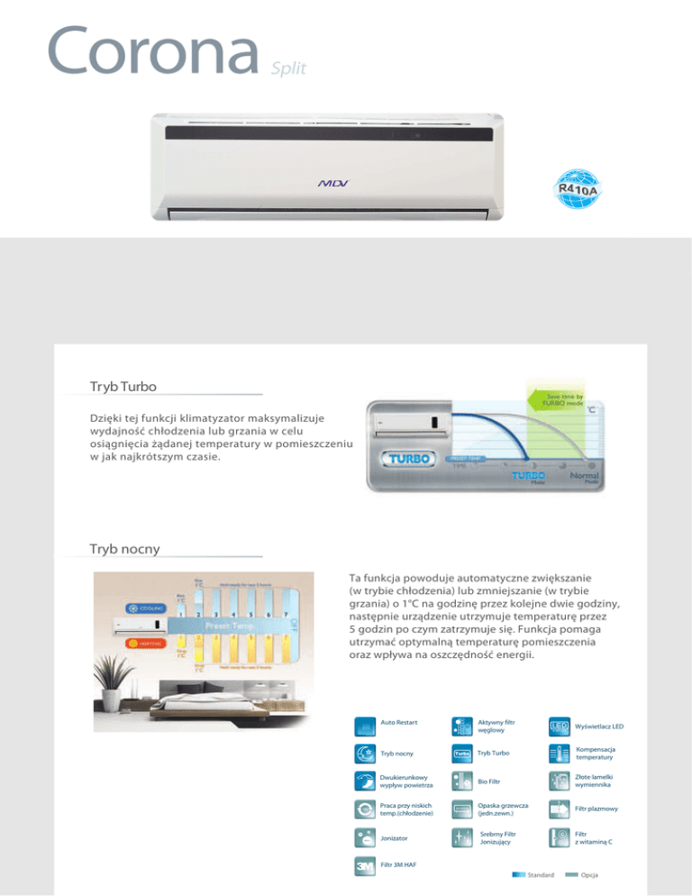 Corona Split Tr yb Turbo Dzięki tej funkcji klimatyzator maksymalizuje wydajność chłodzenia lub grzania w celu osiągnięcia żądanej temperatury w pomieszczeniu w jak najkrótszym czasie. Tryb nocny Ta funkcja powoduje automatyczne zwiększanie (w trybie chłodzenia) lub zmniejszanie (w trybie grzania) o 1°C na godzinę przez kolejne dwie godziny, następnie urządzenie utrzymuje temperaturę przez 5 godzin po czym zatrzymuje się. Funkcja pomaga utrzymać optymalną temperaturę pomieszczenia oraz wpływa na oszczędność energii. Auto Restart Aktywny filtr węglowy Wyświetlacz LED Tryb nocny Tryb Turbo Kompensacja temperatury Dwukierunkowy wypływ powietrza Bio Filtr Złote lamelki wymiennika Praca przy niskich temp.(chłodzenie) Opaska grzewcza (jedn.zewn.) Filtr plazmowy Jonizator Filtr z witaminą C Srebrny Filtr Jonizujący Filtr 3M HAF Standard Opcja Specyfikacja techniczna_Seria Corona (DC inverter) MOC-09HFN1-ND2E MSC-09HRDN1-QC2 MOR-09HDN1-QC2 Jednostka wewnętrzna Jednostka zewnętrzna Wydajność Chłodzenie 9000(2050~11200) 12000(4000~13800) 17000(5100-22000) 23000(12000~25000) 2.6(0.6-3.3) 3.5(1.2-4.0) 5.0(1.5-6.4) 6.7(3.5~7.3) Btu/h 10000(3200~13200) 13000(4100~14500) 17500(5300-23000) 25000(11000~27000) kW 2.9(0.9-3.8) 3.8(1.2-4.2) 5.1(1.6-6.7) 7.3(3.2~7.9) Zasilanie V~,Hz,Ph 220-240, 50, 1 220-240, 50, 1 220-240, 50, 1 220-240V~,50Hz,1Ph Pobór mocy (W) Chłodzenie 820(230~1070) 1090(350~1170) 1550(380-2300) 2100(820~2500) Grzanie 810(230~960) 1050(350~1100) 1420(350-2100) 2030(800~2700) Chłodzenie 3.6(1.0~4.7) 4.8(1.5~5.0) 6.9(1.8-10.2) 9.4(3.6~11.2) Grzanie 3.5(1.0~4.2) 4.6(1.5~4.8) 6.4(1.6-9.5) 9.1(3.5~12.0) EER W/W 3.22 3.23 3.21 3.21 COP W/W 3.62 3.63 3.61 3.61 Klasa energetyczna A/A A/A A/A A/A Przepływ powietrza (m3/h) Jedn.wewn. 550 620 800 1150 Poziom hałasu ( dB(A)) Net Dimension Wymiary & Weight &Waga Netto Wymiary &Waga Brutto Piping Size Rozmiar rur MSC-24HRDN1-QC2W MOF-24HDN1-QC2W kW Prąd pracy (A) Osiągi MSC-12HRFN1-ND0E MSC-18HRDN1-QC2(C) MOC-18HDN1-QC2 Btu/h Grzanie Parts Parametry Elektryczne MSC-12HRDN1-QC2 MOR-12HDN1-QC2 J.wewn.(Wys./Śr./Nis.)39/33/28 40/35/29 45/40/37 48/45/41 Jedn.zewn 52 52 56 58 Jedn.wewn. (mm) Szer.xWys.xGłęb. 710x250x195 790x265x195 920x292x225 1080x330x225 Jedn.zewn. (mm) Szer.xWys.xGłęb 660x540x255 660x540x255 760x590x285 845x695x335 Waga (kg) Jedn.wewn./zewn. 7.5/27.5 9/29 11.5/40.5 15.5/49.5 Jedn.wewn. (mm) Szer.xWys.xGłęb 800x340x270 875x375x285 1015x368x295 1165x445x320 Jedn.zewn. (mm) Szer.xWys.xGłęb 770x585x325 770x585x325 887x645x355 965x755x395 Waga (kg) Jedn.wewn./zewn. 9.5/29.5 11/31 14.5/43 20.5/52.5 Ciecz (mm(inch)) Ø6.35 (1/4") Ø6.35 (1/4") Ø6.35 (1/4") Ø9.53 (3/8") Gaz (mm(inch)) Ø9.53 (3/8") Ø9.53 (3/8") Ø12.7 (1/2") Ø16.0 (5/8") 25-35 30-45 40-64 50-88 Obsługiwana ( m2) powierzchnia Uwaga: 1.Powyższe dane techniczne mogą ulec zmianie w wyniku udoskonalenia produktu. 2.Poziom hałasu odzwierciedla głoścność urządzeń mierzoną w komorze bezechowej.
