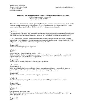 Samodzielny Publiczny Zespół Opieki Zdrowotnej ul. Kopernika 13 32-100 Proszowice Proszowice, dnia 29.04.2014 r. Uczestnicy postępowania prowadzonego w trybie przetargu nieograniczonego na dostawę produktów leczniczych Numer sprawy: 11/ZP/2014 W związku z wniesieniem zapytań przez Wykonawców, Zamawiający przedstawia treść zapytań i udziela pisemnych wyjaśnień zgodnie z art. 38 ust. 2 ustawy z dnia 29 stycznia 2004 roku Prawo zamówień publicznych (Dz. U. z 2013 r. poz. 907 z późniejszymi zmianami). „Pakiet 7 Czy Zamawiający wymaga ,aby przedmiot zamówienia zawierał substancje pomocnicze stabilizujące lek: EDTA (edetynian disodu) i kwas cytrynowy w celu uniknięcia rozkładu substancji czynnej?” „Czy Zamawiający wymaga ,aby przedmiot zamówienia był przebadany pod względem trwałości chemicznej i fizycznej, która potwierdza, że roztwór można przechowywać w temperaturze 25° C do 24 godzin i do 48 godzin w lodówce w temperaturze 2-8° C ?” Odpowiedź: Zamawiający nie wymaga, ale dopuszcza. „Pakiet 9 Poz. 7 Benzathine benzylpenicillin 1200 000 j.m x 1 fiol. Brak produkcji . Bardzo proszę Zamawiającego o wykreślenie leków z pakietu lub o możliwość wpisania ostatniej ceny z adnotacją pod pakietem.” Odpowiedź: Proszę wpisać ostatnią cenę wraz z adnotacją pod pakietem. „Poz. 18,19 Piperacilin 1g,2g Leki wycofane , zakończona produkcja. Bardzo proszę Zamawiającego o wykreślenie leków z pakietu lub o możliwość wpisania ostatniej ceny z adnotacją pod pakietem .” Odpowiedź: Proszę wpisać ostatnią cenę wraz z adnotacją pod pakietem. „Pakiet 13 Czy Zamawiający wyrazi zgodę na wycenę leku w dawce 50 mg Fe 3+/ml:2ml x 5 amp” Odpowiedź: Zgodnie z SIWZ. „Pakiet 18 Poz. 7 Acetylsalicylic acid subst. 1 kg Czy Zamawiający dopuszcza wycenę: Acidum acetylsalicyl.,subst,(Pharma), 250 g w ilości 4 op. Brak opakowania po 1 kg.” Odpowiedź: Tak. „Poz. 34 Amoksicillin + Clavulanic acid 312,5 mg /5 ml zawiesina Brak leku u wszystkich dystrybutorów . Bardzo proszę Zamawiającego o wykreślenie leków z pakietu lub o możliwość wpisania ostatniej ceny z adnotacją pod pakietem.” Odpowiedź: Tak, możliwość wpisania ostatniej ceny z adnotacją pod pakietem. „Poz. 57 Czy Zamawiający wyrazi zgodę na wycenę leku w Beclometazon 100mcg+Formoterol 6 mcg /180 dawkach ,- 20 op , brak w ofercie producenta leku x 120 dawek.” Odpowiedź: Tak. „Poz. 80 Czy w tej pozycji wycenić Butylscopolamine 10 mg x 6 czopki doodbytnicze.” Odpowiedź: Tak. „Poz. 140 Desmopressin aer Zakończona produkcja. Bardzo proszę Zamawiającego o wykreślenie leków z pakietu lub o możliwość wpisania ostatniej ceny z adnotacją pod pakietem.” Odpowiedź: Tak, możliwość wpisania ostatniej ceny z adnotacją pod pakietem. „Poz. 199 Czy Zamawiający wyrazi zgodę na wycenę Fiolet kryst. susbs. po 10 g -3 op . brak opakowania po 25 g.” Odpowiedź: Tak. „Poz. 213 Czy Zamawiający wyrazi zgodę na wycenę Formaldehyd 10% po 1 kg-200 op?” Odpowiedź: Tak. „Poz. 289 Isosorbide dinitrate 1,25 mg aer.200 dawek. Wycofany z ofert Glaxo – Brak zamiennika. Bardzo proszę Zamawiającego o wykreślenie leków z pakietu lub o możliwość wpisania ostatniej ceny z adnotacją pod pakietem.” Odpowiedź: Tak, możliwość wpisania ostatniej ceny z adnotacją pod pakietem. Poz. 293 Czy Zamawiający dopuści wycenę preparatu Multilac kapsułki (suplement diety), który posiada aż 9 szczepów bakterii probiotycznych, stosowany 1 raz na dobę, nie wymaga przechowywania w lodówce oraz nie zawiera mleka, Kazeiny ani konserwantów. Jednocześnie prosimy o podanie ilości kapsułek potrzebnych Zamawiającemu przy założeniu dawkowania 1 kapsułki na dobę (Lacidofill 3 kapsułki na dobę). Dopuszczenie przez Zamawiającego wyżej opisanego produktu pozwoli na złożenie oferty konkurencyjnej. Odpowiedź: Nie. „Poz. 320 Czy zamawiający wymaga aby w pozycji nr 320 był preparat Makrogol 74 g x 50 saszetek (PEG 4 litry - Fortrans) zgodny z SIWZ, który jest rekomendowany przez Europejskie Towarzystwo Endoskopii Przewodu Pokarmowego (ESGE) w rutynowym przygotowaniu do kolonoskopii oraz jest preparatem wykorzystywanym w Programie Badań Przesiewowych Ministerstwa Zdrowia dla wczesnego wykrywania raka jelita grubego (http://pbp.org.pl/kolonoskopia/przygotowanie)? Czy zamawiający wymaga aby poz. 320 był preparat Makrogol (74 g x 50 saszetek, PEG 4 litry Fortrans) o składzie chemicznym zgodnym z SIWZ?” Odpowiedź: Zamawiający wymaga preparatu zgodnego z SIWZ ( zużycie do 4 saszetek / 4l roztworu na jedno badanie). „Poz. 350 Czy w tej pozycji wycenić Metronidazol 500 mg x 10 tab dopochwowych, brak rejestracji leku w czopkach .” Odpowiedź: Nie, adnotacja pod pakietem. „Poz. 436 Policresulen 36% 50 ml- zakończona produkcja . Bardzo proszę Zamawiającego o wykreślenie leków z pakietu lub o możliwość wpisania ostatniej ceny z adnotacją pod pakietem.” Odpowiedź: Tak, możliwość wpisania ostatniej ceny z adnotacją pod pakietem. „Poz.485 Czy w tej pozycji wycenić Simavastatinum 20 mg x 28 - 5 op” Odpowiedź: Tak. „Poz. 486 Czy w tej pozycji wycenić Simavastatinum 40 mg x 28 - 5 op” Odpowiedź: Tak. „Poz. 514 Tetanus Immunoglobulin 250 j.m /1ml Brak produkcji.Bardzo proszę Zamawiającego o wykreślenie leków z pakietu lub o możliwość wpisania ostatniej ceny z adnotacją pod pakietem. Odpowiedź: Możliwość wpisania ostatniej ceny z adnotacją pod pakietem. „Poz. 527 Tolperisone 100mg/1ml x 5 amp Wycofany z obrotu - DEC GIF 10/WC/2013. Bardzo proszę Zamawiającego o wykreślenie leków z pakietu lub o możliwość wpisania ostatniej ceny z adnotacją pod pakietem.” Odpowiedź: Możliwość wpisania ostatniej ceny z adnotacją pod pakietem. „Poz. 542 Tuberkulin PPD RT 23 2 j.m /1,5 ml x 10 fiolek Tymczasowo wstrzymany z dniem 11.03.2014. Bardzo proszę Zamawiającego o wykreślenie leku z pakietu lub o 