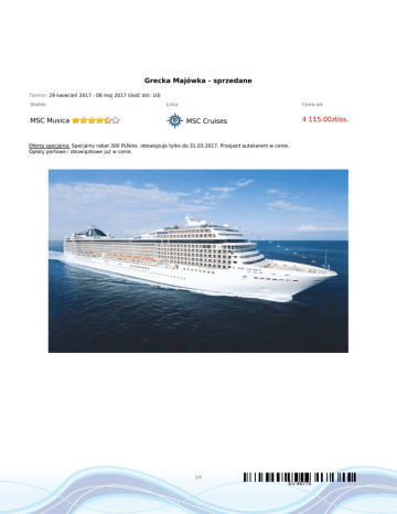 Grecka Majówka - sprzedane Termin: 29 kwiecień 2017 - 08 maj 2017 (ilość dni: 10) Statek: MSC Musica Linia: Cena od: 4 115.00zł/os. MSC Cruises Oferta specjalna: Specjalny rabat 300 PLN/os. obowiązuje tylko do 31.03.2017. Przejazd autokarem w cenie. Opłaty portowe i obowiązkowe już w cenie. 1/3 EV:46775 TRASA REJSU dzień 1 Data Port Wpłynięcie Wypłynięcie sobota 29.04.2017 Łódź --:-- --:-- Legenda Polska Spotkanie z pilotem w Łodzi, przejazd autokarem przez Katowice do Wenecji. dzień 2 niedziela 30.04.2017 Wenecja --:-- 17:00 13:30 19:30 Włochy Przyjazd do Wenecji, zaokrętowanie na statek MSC Musica. dzień 3 poniedziałek 01.05.2017 Brindisi Włochy Indywidualne zwiedzanie miasta bądź udział w wyciecze fakultatywnej. dzień 4 wtorek 02.05.2017 Katakolon, Olimpia 12:00 18:00 Grecja Indywidualne zwiedzanie lub udział w wycieczce fakultatywnej do jednego z najsłynniejszych miejsc Starożytnej Grecji – sanktuarium w Olimpii, miejsca antycznych igrzysk olimpijskich. dzień 5 środa 03.05.2017 Santorini 08:00 17:00 Grecja Indywidualne zwiedzanie Santorini lub udział w wycieczce fakultatywnej „Fira & Oia tour”, pozwalającej poznać dwie najładniejsze miejscowości tej perły wysp greckich. dzień 6 czwartek 04.05.2017 Pireus, Ateny 07:30 16:30 Grecja Indywidualne zwiedzanie lub udział w wycieczce fakulattywnej do Aten, pozwalającej poznać najważniejsze atrakcje miasta. dzień 7 piątek 05.05.2017 Korfu 12:30 18:30 Grecja Indywidualne zwiedzanie miasta lub udział w wycieczce fakultatywne. dzień 8 sobota 06.05.2017 Kotor 07:00 13:00 Czarnogóra Indywidualne zwiedzanie Kotoru lub udział w wycieczce fakultatywnej dzień 9 niedziela 07.05.2017 Wenecja 09:00 --:-- --:-- --:-- Włochy Wyokrętowanie ze statku, powrót do Polski. dzień 10 poniedziałek 08.05.2017 Łódź Polska Przyjazd do Łodzi we wczesnych godzinach porannych, zakończenie wycieczki. CENNIK Cena katalogowa Cena promocyjna Kabina wewnętrzna 4 415.00zł 4 115.00zł Kabina zewnętrzna z oknem 4 985.00zł 4 685.00zł 2/3 EV:46775 Kabina zewnętrzna z balkonem 5 499.00zł 3 i 4 osoba dorosła w kabinie na zapytanie dziecko do 18 lat jako 3 i 4 osoba w kabinie na zapytanie Opłaty portowe i obowiązkowe 5 199.00zł w cenie Uwaga! Ceny za osobę w kabinie dwuosobowej. Cena zawiera: 8 dniowy rejs statkiem MSC Musica - zakwaterowanie w w wybranej kabinie; pełne wyżywienie w trakcie rejsu: 3 główne posiłki i przekąski między posiłkami; napoje serwowane do śniadania i w bufetach samoobsługowych; serwis bagażowy podczas wejścia i zejścia ze statku oraz serwis kabinowy; korzystanie ze wszystkich urządzeń sportowo - rekreacyjnych znajdujących się na pokładzie statku (basen, jacuzzi, sala fitness, itp.); udział we wszystkich imprezach organizowanych na statku (przedstawienia w teatrze, koncerty, programy animacyjne itp.); przejazd autokarem opcjonalnie z Łodzi lub Katowic; podatki, opłaty portowe i ubezpieczenie KL, NNW i bagażu; opiekę polskiego pilota w trakcie całej imprezy. Cena nie zawiera: wycieczek fakultatywnych w trakcie rejsu; korzystania z barów, mini baru w kabinie oraz napojów zamawianych w restauracji; korzystania z punktów usługowych (fryzjer, pralnia, fotograf, salon piękności i odnowy biologicznej, internet); ubezpieczenia od kosztów rezygnacji i chorób przewlekłych; napiwków dla obsługi na statku (ok. 10EUR/os./dzień) Uwagi: kabiny 1, 3 i 4 osobowe są na zapytanie i sprzedawane tylko po potwierdzeniu; grupa z polskim pilotem realizowana przy min. 30 osobach; istnieje możliwość wykupienia pakietu All inclusive obejmującego wybrane napoje alkoholowe i bezalkoholowe dostępne bez ograniczeń we wszystkich barach. Cena pakietu 26 EUR/dzień/os. dorosła i 12 EUR/dzień/dziecko. Warunkiem skorzystania z pakietu all inclusive jest wykupienie przez wszystkich pasażerów podróżujących w jednej kabinie na czas całego rejsu 3/3 EV:46775