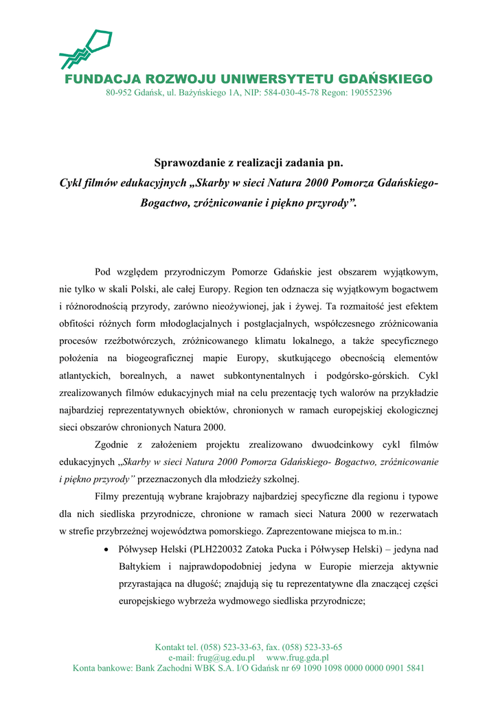 FUNDACJA ROZWOJU UNIWERSYTETU GDAŃSKIEGO 80-952 Gdańsk, ul. Bażyńskiego 1A, NIP: 584-030-45-78 Regon: 190552396 Sprawozdanie z realizacji zadania pn. Cykl filmów edukacyjnych „Skarby w sieci Natura 2000 Pomorza GdańskiegoBogactwo, zróżnicowanie i piękno przyrody”. Pod względem przyrodniczym Pomorze Gdańskie jest obszarem wyjątkowym, nie tylko w skali Polski, ale całej Europy. Region ten odznacza się wyjątkowym bogactwem i różnorodnością przyrody, zarówno nieożywionej, jak i żywej. Ta rozmaitość jest efektem obfitości różnych form młodoglacjalnych i postglacjalnych, współczesnego zróżnicowania procesów rzeźbotwórczych, zróżnicowanego klimatu lokalnego, a także specyficznego położenia na biogeograficznej mapie Europy, skutkującego obecnością elementów atlantyckich, borealnych, a nawet subkontynentalnych i podgórsko-górskich. Cykl zrealizowanych filmów edukacyjnych miał na celu prezentację tych walorów na przykładzie najbardziej reprezentatywnych obiektów, chronionych w ramach europejskiej ekologicznej sieci obszarów chronionych Natura 2000. Zgodnie z założeniem projektu zrealizowano dwuodcinkowy cykl filmów edukacyjnych „Skarby w sieci Natura 2000 Pomorza Gdańskiego- Bogactwo, zróżnicowanie i piękno przyrody” przeznaczonych dla młodzieży szkolnej. Filmy prezentują wybrane krajobrazy najbardziej specyficzne dla regionu i typowe dla nich siedliska przyrodnicze, chronione w ramach sieci Natura 2000 w rezerwatach w strefie przybrzeżnej województwa pomorskiego. Zaprezentowane miejsca to m.in.: Półwysep Helski (PLH220032 Zatoka Pucka i Półwysep Helski) – jedyna nad Bałtykiem i najprawdopodobniej jedyna w Europie mierzeja aktywnie przyrastająca na długość; znajdują się tu reprezentatywne dla znaczącej części europejskiego wybrzeża wydmowego siedliska przyrodnicze; Kontakt tel. (058) 523-33-63, fax. (058) 523-33-65 e-mail: [email protected] www.frug.gda.pl Konta bankowe: Bank Zachodni WBK S.A. I/O Gdańsk nr 69 1090 1098 0000 0000 0901 5841 FUNDACJA ROZWOJU UNIWERSYTETU GDAŃSKIEGO 80-952 Gdańsk, ul. Bażyńskiego 1A, NIP: 584-030-45-78 Regon: 190552396 Rozewie, Kępa Redłowska (PLH220072 Kaszubskie Klify, PLH220105 Klify i Rafy Kamienne Orłowa) – najbardziej znane klify w Polsce; Unikatowy kompleks zagłębień międzywydmowych i wydm nadmorskich w rezerwacie Białogóra (PLH220003 Białogóra); Wydma paraboliczna porośnięta starym drzewostanem bukowym z unikatową biotą porostów w rezerwacie Babnica (PLH220003 Białogóra); Zmiennowilgotne łąki trzęślicowe i kwaśne dąbrowy (PLH220021 Piaśnickie Łąki). Film skierowany jest do młodzieży i osób dorosłych, mając na celu propagowanie zasobów przyrodniczych województwa pomorskiego i sieci Natura 2000. Film wyemitowany został na antenie telewizji regionalnej TVP Gdańsk, w paśmie edukacyjnym w następujących terminach: cz.1- 22.03.2016- godzina 19:30- oglądalność- 4628 /powtórka 24.03.2016 godzina 17:30- oglądalność- 2553/ cz.2- 29.03.2016- godzina 19:30- oglądalność- 2159 /powtórka 31.03.2016 godzina 17:30- oglądalność- 2008/ Informacja o filmie znajduje się na stronie internetowej Fundacji Rozwoju UG: http://www.frug.ug.edu.pl/pl/dzialalnosc/filmy/filmy-projektowe/ Ponadto film został dystrybułowany drogą elektroniczną do 394 szkół gimnazjalnych na terenie województwa pomorskiego (w załączeniu wykaz Szkół), stanowiąc atrakcyjny materiał edukacyjny zajęć lekcyjnych, pozwalający młodzieży na zapoznanie się bliżej z pojęciem Natura 2000 oraz identyfikację cennych przyrodniczo obszarów na terenie Pomorza Gdańskiego. Cele działań założonych w projekcie zostały osiągnięte – filmy stanowią ciekawe uzupełnienie zajęć szkolnych, poszerzają wiedzę na temat zasobów przyrodniczych regionu i budują świadomość i postawę ekologiczną wśród odbiorców, propagują postawę odpowiedzialnego wykorzystania potencjału środowiska naturalnego i jego ochrony oraz zwiększają akceptację zasad ochrony przyrody wśród społeczności lokalnej i wzmacniają Kontakt tel. (058) 523-33-63, fax. (058) 523-33-65 e-mail: [email protected] www.frug.gda.pl Konta bankowe: Bank Zachodni WBK S.A. I/O Gdańsk nr 69 1090 1098 0000 0000 0901 5841 FUNDACJA ROZWOJU UNIWERSYTETU GDAŃSKIEGO 80-952 Gdańsk, ul. Bażyńskiego 1A, NIP: 584-030-45-78 Regon: 190552396 znajomość zasobów przyrodniczych regionu, w tym przede wszystkim obszarów Natura 2000. Fundacja Rozwoju Uniwersytetu Gdańskiego niniejszym oświadcza, iż na materiałach edukacyjnych (materiale filmowym) w ramach realizacji zadania została zamieszczona informacja oraz logo Wojewódzkiego Funduszu Ochrony Środowiska i Gospodarki Wodnej w Gdańsku z informacją o źródle finansowania zadania. Gdańsk, dnia 27 kwietnia 2016r. Kontakt tel. (058) 523-33-63, fax. (058) 523-33-65 e-mail: [email protected] www.frug.gda.pl Konta bankowe: Bank Zachodni WBK S.A. I/O Gdańsk nr 69 1090 1098 0000 0000 0901 5841