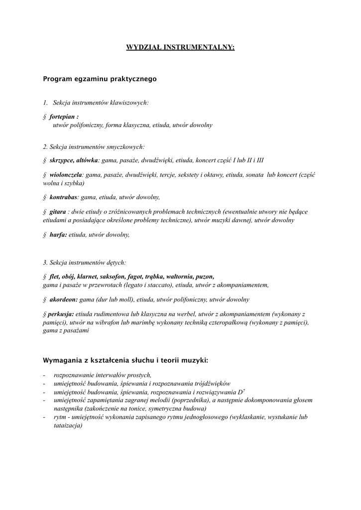 WYDZIAŁ INSTRUMENTALNY: Program egzaminu praktycznego 1. Sekcja instrumentów klawiszowych: § fortepian : utwór polifoniczny, forma klasyczna, etiuda, utwór dowolny 2. Sekcja instrumentów smyczkowych: § skrzypce, altówka: gama, pasaże, dwudźwięki, etiuda, koncert część I lub II i III § wiolonczela: gama, pasaże, dwudźwięki, tercje, sekstety i oktawy, etiuda, sonata lub koncert (część wolna i szybka) § kontrabas: gama, etiuda, utwór dowolny, § gitara : dwie etiudy o zróżnicowanych problemach technicznych (ewentualnie utwory nie będące etiudami a posiadające określone problemy techniczne), utwór muzyki dawnej, utwór dowolny § harfa: etiuda, utwór dowolny, 3. Sekcja instrumentów dętych: § flet, obój, klarnet, saksofon, fagot, trąbka, waltornia, puzon, gama i pasaże w przewrotach (legato i staccato), etiuda, utwór z akompaniamentem, § akordeon: gama (dur lub moll), etiuda, utwór polifoniczny, utwór dowolny § perkusja: etiuda rudimentowa lub klasyczna na werbel, utwór z akompaniamentem (wykonany z pamięci), utwór na wibrafon lub marimbę wykonany techniką czteropałkową (wykonany z pamięci), gama z pasażami Wymagania z kształcenia słuchu i teorii muzyki: - rozpoznawanie interwałów prostych, umiejętność budowania, śpiewania i rozpoznawania trójdźwięków umiejętność budowania, śpiewania, rozpoznawania i rozwiązywania D7 umiejętność zapamiętania zagranej melodii (poprzednika), a następnie dokomponowania głosem następnika (zakończenie na tonice, symetryczna budowa) rytm - umiejętność wykonania zapisanego rytmu jednogłosowego (wyklaskanie, wystukanie lub tataizacja)
