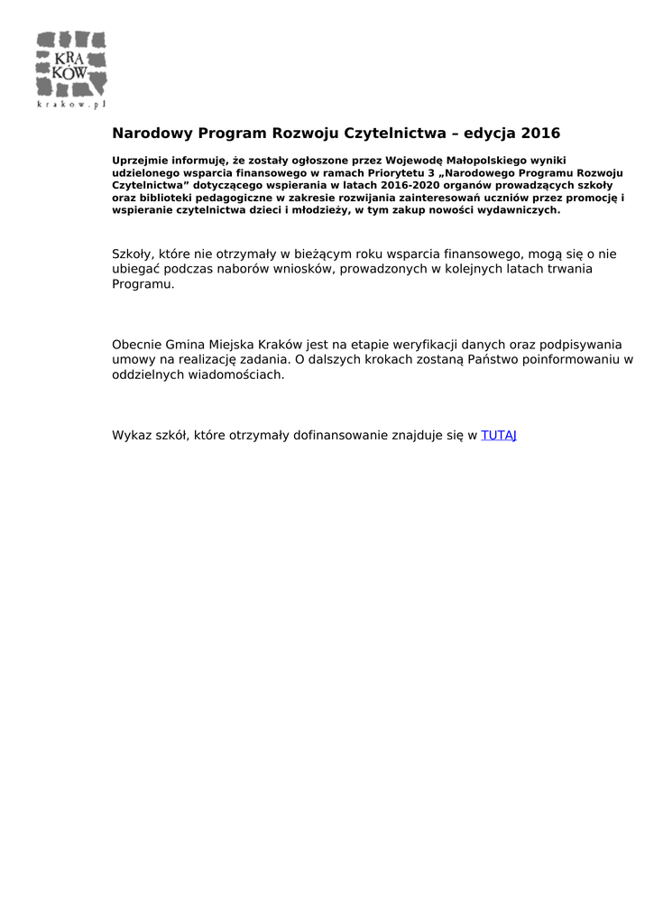 Narodowy Program Rozwoju Czytelnictwa – edycja 2016 Uprzejmie informuję, że zostały ogłoszone przez Wojewodę Małopolskiego wyniki udzielonego wsparcia finansowego w ramach Priorytetu 3 „Narodowego Programu Rozwoju Czytelnictwa” dotyczącego wspierania w latach 2016-2020 organów prowadzących szkoły oraz biblioteki pedagogiczne w zakresie rozwijania zainteresowań uczniów przez promocję i wspieranie czytelnictwa dzieci i młodzieży, w tym zakup nowości wydawniczych. Szkoły, które nie otrzymały w bieżącym roku wsparcia finansowego, mogą się o nie ubiegać podczas naborów wniosków, prowadzonych w kolejnych latach trwania Programu. Obecnie Gmina Miejska Kraków jest na etapie weryfikacji danych oraz podpisywania umowy na realizację zadania. O dalszych krokach zostaną Państwo poinformowaniu w oddzielnych wiadomościach. Wykaz szkół, które otrzymały dofinansowanie znajduje się w TUTAJ Powered by TCPDF (www.tcpdf.org)