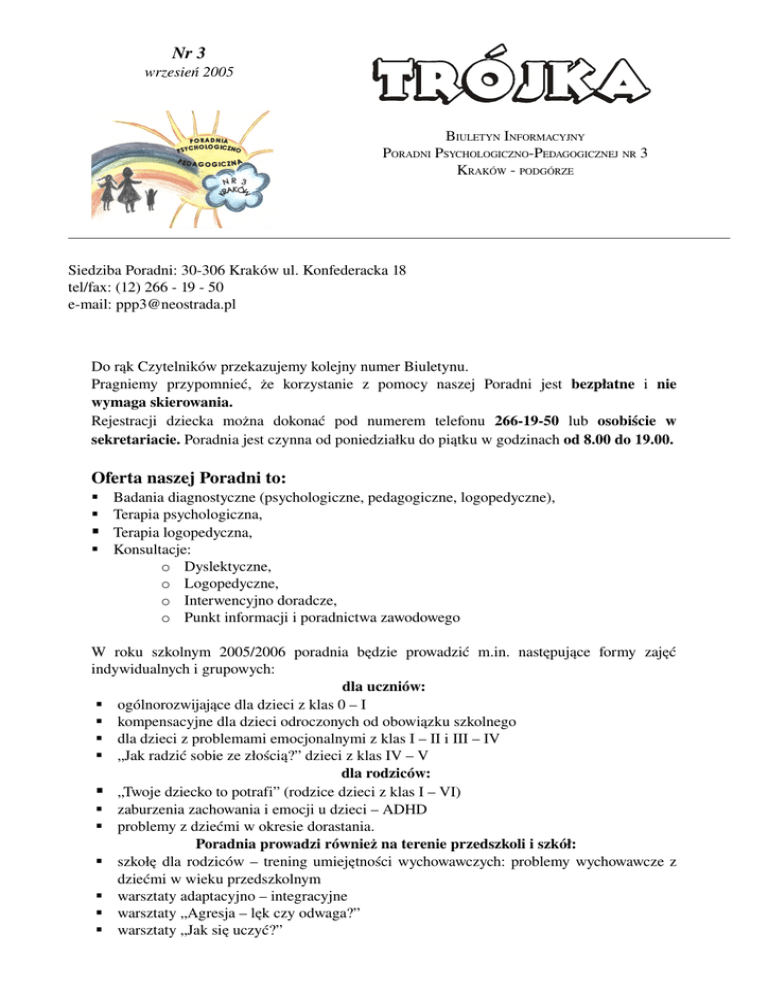 Nr 3 wrzesień 2005 BIULETYN INFORMACYJNY PORADNI PSYCHOLOGICZNOPEDAGOGICZNEJ NR 3 KRAKÓW PODGÓRZE Siedziba Poradni: 30306 Kraków ul. Konfederacka 18 tel/fax: (12) 266 19 50 email: [email protected] Do rąk Czytelników przekazujemy kolejny numer Biuletynu. Pragniemy przypomnieć, że korzystanie z pomocy naszej Poradni jest bezpłatne i nie wymaga skierowania. Rejestracji dziecka można dokonać pod numerem telefonu 2661950 lub osobiście w sekretariacie. Poradnia jest czynna od poniedziałku do piątku w godzinach od 8.00 do 19.00. Oferta naszej Poradni to: Badania diagnostyczne (psychologiczne, pedagogiczne, logopedyczne), Terapia psychologiczna, Terapia logopedyczna, Konsultacje: o Dyslektyczne, o Logopedyczne, o Interwencyjno doradcze, o Punkt informacji i poradnictwa zawodowego W roku szkolnym 2005/2006 poradnia będzie prowadzić m.in. następujące formy zajęć indywidualnych i grupowych: dla uczniów: ogólnorozwijające dla dzieci z klas 0 – I kompensacyjne dla dzieci odroczonych od obowiązku szkolnego dla dzieci z problemami emocjonalnymi z klas I – II i III – IV „Jak radzić sobie ze złością?” dzieci z klas IV – V dla rodziców: „Twoje dziecko to potrafi” (rodzice dzieci z klas I – VI) zaburzenia zachowania i emocji u dzieci – ADHD problemy z dziećmi w okresie dorastania. Poradnia prowadzi również na terenie przedszkoli i szkół: szkołę dla rodziców – trening umiejętności wychowawczych: problemy wychowawcze z dziećmi w wieku przedszkolnym warsztaty adaptacyjno – integracyjne warsztaty „Agresja – lęk czy odwaga?” warsztaty „Jak się uczyć?” cykl zajęć: „Planuję karierę zawodową”. Zachęcamy Państwa do uważnej lektury poniższych artykułów. SPECYFICZNE TRUDNOŚCI W NAUCE (dysgrafia, dysortografia) – WSKAZÓWKI DO PRACY W DOMU W międzynarodowych klasyfikacjach medycznych obecnie używa się określeń opisowych: zaburzenia czytania, zaburzenia w opanowaniu poprawnej pisowni, specyficzne trudności w opanowaniu umiejętności wypowiadania się za pomocą pisania i zalicza się je do kategorii specyficznych trudności w opanowaniu umiejętności szkolnych lub zaburzeń uczenia się. JAKI JEST ZAKRES SPECYFICZNYCH TRUDNOŚCI W UCZENIU SIĘ U DZIECI Z DYSLEKSJĄ ROZWOJOWĄ? Specyficzne trudności w uczeniu się czytania i pisania występują nie tylko podczas nauki języka ojczystego (np. języka polskiego), ale również w uczeniu się języków obcych. Niektórym przypadkom dysleksji rozwojowej towarzyszą specyficzne trudności w opanowywaniu innych umiejętności szkolnych. Uczniowie dyslektyczni, pomimo prawidłowego myślenia matematycznego, mogą mieć trudności z opanowaniem tabliczki mnożenia, poprawnym zapisywaniem liczb i działań arytmetycznych, np. przestawiają kolejność cyfr, zapisują je „zwierciadlanie" lub od prawej do lewej strony, mylą znaki nierówności, mają też trudności z geometrią. Inne specyficzne trudności dotyczą niektórych sprawności ruchowych np. zapamiętywania układów gimnastycznych, utrzymywania równowagi ciała. Mała sprawność ruchowa rąk powoduje problemy z kaligrafią i opanowaniem odpowiedniego poziomu graficznego rysunku (dzieci rysują niechętnie, ich rysunki są uproszczone, niekształtne). Uczniowie dyslektyczni mogą mieć również trudności z wykonywaniem określonego typu zadań, wymagających np. orientacji na mapie i w terenie, spostrzegania stosunków przestrzennych, zapamiętywania chronologii, nazwisk, nazw i sekwencji składających się z wielu elementów. Dzieci z dysleksją najczęściej nieprawidłowo organizują sobie pracę, mają trudności z zapamiętywaniem danych, zapominają i mylą informacje, gubią się w przestrzeni i czasie. Słaba umiejętność czytania utrudnia uczenie się z podręczników szkolnych. Pogłębianie i poszerzanie się niepowodzeń szkolnych wynika też z nawarstwiania się wtórnych zaburzeń emocjonalnych i motywacyjnych (zniechęcenie, brak wiary w swoje możliwości). 1. 2. 3. 4. Proces diagnostyczny specyficznych trudności w nauce, wypracowany i obowiązujący w naszej Poradni: Diagnoza może być wykonana na prośbę szkoły, lub na życzenie rodziców (konieczna informacja od polonisty, wskazana na druku opracowanym przez Poradnię i rozpowszechnionym we wszystkich rejonowych placówkach oświatowych). Diagnozę rozpoczynamy wstępnymi konsultacjami (termin do ustalenia osobiście lub telefonicznie), na których sprawdzana jest znajomość zasad ortografii, analizowane są zapisy w zeszytach, prace szkolne oraz zostają udzielone wskazówki do pracy domowej. Ponowne spotkanie ma charakter konsultacji kontrolnych – sprawdzenie wykonywanych w domu ćwiczeń. Diagnoza pedagogiczna sprawdzająca: znajomość zasad ortografii (pisemnie), tempo czytania, rozumienie czytanego tekstu, poziom rozwoju funkcji słuchowych oraz zakres i jakość popełnianych błędów (próba pisania pod dyktando i luźne wypracowanie). 5. Diagnoza psychologiczna określająca poziom intelektualny i emocjonalny dziecka. 6. Przygotowanie opinii postdiagnostycznej, z równoczesnym ustaleniem dalszej formy pracy z uczniem (zajęcia reedukacyjne w szkole lub w Poradni, spotkania konsultacyjne – kontrola pracy domowej). Uczniowie ze szkół w których są prowadzone zajęcia reedukacyjne oraz uczniowie szkół ponadgimnazjalnych, nie uczestniczą we wstępnych konsultacjach. Termin diagnozy należy uzgodnić z wyznaczonym (z ramienia Poradni) opiekunem szkoły. Z uwagi na rozbudowany proces diagnostyczny specyficznych trudności w nauce czytania i pisania, prosimy o wczesne zgłaszanie uczniów. Zbyt późne zgłoszenie utrudnia zebranie niezbędnych informacji, dokumentów oraz przeprowadzenie rzetelnej diagnozy, a tym samym wydanie opinii w obowiązującym terminie – koniec września roku w którym odbywa się sprawdzian (klasa VI), egzamin (klasa III) i egzamin maturalny. Jedna z proponowanych efektywnych form pracy z dz