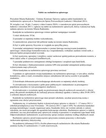 Nabór na rachmistrza spisowego Prezydent Miasta Radomsko - Gminny Komisarz Spisowy ogłasza nabór kandydatów na rachmistrzów spisowych w Narodowym Spisie Powszechnym Ludności i Mieszkań 2011r. W związku z art. 18 pkt. 2 ustawy z dnia 4 marca 2010 r. o narodowym spisie powszechnym ludności i mieszkań 2011 r. ogłasza się nabór na rachmistrzów spisowych, którzy wykonywać będą zadania spisowe na terenie Miasta Radomsko. Kandydat na rachmistrza spisowego winien spełniać następujące warunki: 1) mieć ukończone 18 lat, 2) posiadać co najmniej średnie wykształcenie, 3) zamieszkiwać, pracować lub pobierać naukę na terenie miasta Radomsko, 4) być w pełni sprawny fizycznie ze względu na specyfikę pracy, 5) posiadać umiejętności interpersonalne w postaci łatwego nawiązywania kontaktów, sprawnego i skutecznego komunikowania się z respondentami, wzbudzać zaufanie wśród osób, z którymi będzie przeprowadzał wywiady 6) być asertywny, uprzejmy i cierpliwy, umieć zachować spokój podczas prowadzenia rozmów, a także radzić sobie w sytuacjach konfliktowych, 7) posiadać podstawowe umiejętności obsługi komputera i urządzeń typu hand-held, 8) być obeznany z funkcjonowaniem systemu GPS oraz posiadać umiejętność praktycznego wykorzystania map cyfrowych. Oferta kandydata na rachmistrza spisowego powinna zawierać: 1) podanie ze zgłoszeniem swojej kandydatury na rachmistrza spisowego, w tym adres, telefon kontaktowy, adres e-mail, ewentualnie miejsce zatrudnienia lub nazwę uczelni w przypadku studentów, 2) kserokopie dokumentu potwierdzającego ukończenie co najmniej szkoły średniej, 3) oświadczenie o korzystaniu z pełni praw publicznych i niekaralności za przestępstwo popełnione umyślnie (w tym przestępstwo skarbowe). 4) oświadczenie o wyrażeniu zgody na przetwarzanie danych osobowych zawartych w ofercie pracy dla potrzeb niezbędnych do realizacji procesu rekrutacji zgodnie z ustawą z dnia 29.08.1997r o ochronie danych osobowych. Kandydat na rachmistrza spisowego musi przejść szkolenie, uzyskać pozytywną ocenę z egzaminu oraz złożyć przyrzeczenie. Nadmienia się, iż rachmistrz będzie wykonywał prace spisowe w okresie 1 - 17 marca 2011 r. (obchód przedspisowy) oraz 8 kwietnia – 30 czerwca 2011 r. (spis CAPI). Na szkoleniu kandydaci poznają metodologię i zasady organizacji spisu. Kandydat, który nie weźmie udziału w całości szkolenia, nie może przystąpić do egzaminu kończącego szkolenie. Rachmistrze spisowi w trakcie szkolenia i na czas prowadzenia prac spisowych zostaną wyposażeni w urządzenia typu hand–held. Odpowiedzialność rachmistrzów za powierzony sprzęt zostanie ustalona według odrębnych zasad. Rachmistrz spisowy przed rozpoczęciem spisywania zostanie pouczony o obowiązku zachowania tajemnicy statystycznej. Na podstawie informacji GUS o liczbie planowanych rachmistrzów dla miasta Radomsko ustalono liczbę 23 rachmistrzów i 5 osób rezerwowych. Oferty należy składać w formie pisemnej osobiście lub za pośrednictwem poczty w terminie od 6 do 20 grudnia w dniach i godzinach pracy Urzędu Miasta Radomsko, ul. Tysiąclecia 5 ; w kopertach z napisem „Nabór na rachmistrza spisowego NSP 2011”(Biuro podawcze Urzędu Miasta Radomsko). Rozmowy kwalifikacyjne (w przypadku dużej liczby kandydatów możliwy będzie ogólny test z wiedzy dot. przedmiotu spisu) odbędą się 21 grudnia o godzinie 10. Dokumenty, które wpłyną do Urzędu Miasta Radomsko po wyżej wskazanym terminie lub będą niekompletne nie będą rozpatrywane. Wszelkie informacje dot. spisu można uzyskać na stronie www.stat.gov.pl