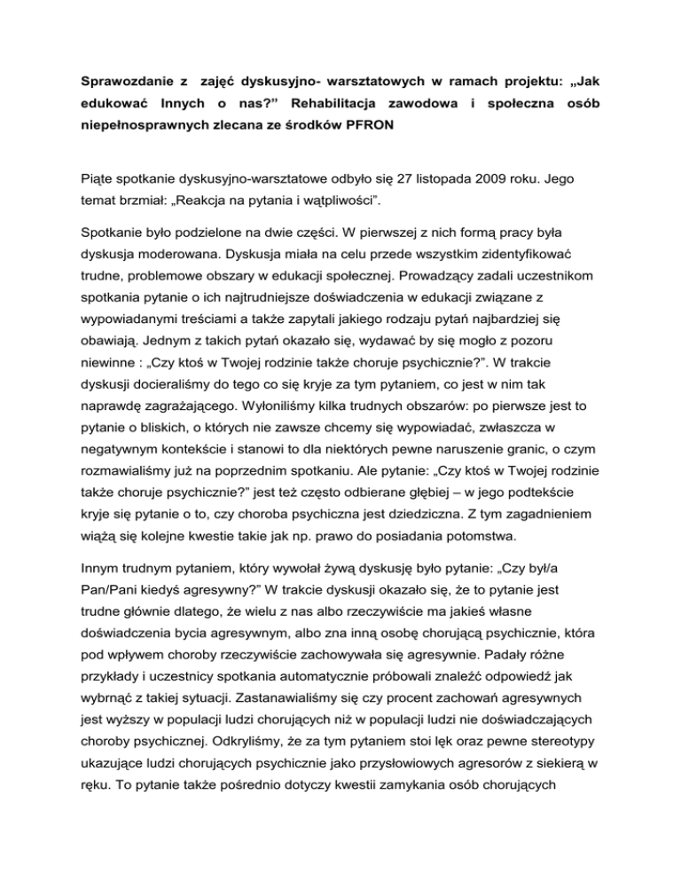Sprawozdanie z zajęć dyskusyjno- warsztatowych w ramach projektu: „Jak edukować Innych o nas?” Rehabilitacja zawodowa i społeczna osób niepełnosprawnych zlecana ze środków PFRON Piąte spotkanie dyskusyjno-warsztatowe odbyło się 27 listopada 2009 roku. Jego temat brzmiał: „Reakcja na pytania i wątpliwości”. Spotkanie było podzielone na dwie części. W pierwszej z nich formą pracy była dyskusja moderowana. Dyskusja miała na celu przede wszystkim zidentyfikować trudne, problemowe obszary w edukacji społecznej. Prowadzący zadali uczestnikom spotkania pytanie o ich najtrudniejsze doświadczenia w edukacji związane z wypowiadanymi treściami a także zapytali jakiego rodzaju pytań najbardziej się obawiają. Jednym z takich pytań okazało się, wydawać by się mogło z pozoru niewinne : „Czy ktoś w Twojej rodzinie także choruje psychicznie?”. W trakcie dyskusji docieraliśmy do tego co się kryje za tym pytaniem, co jest w nim tak naprawdę zagrażającego. Wyłoniliśmy kilka trudnych obszarów: po pierwsze jest to pytanie o bliskich, o których nie zawsze chcemy się wypowiadać, zwłaszcza w negatywnym kontekście i stanowi to dla niektórych pewne naruszenie granic, o czym rozmawialiśmy już na poprzednim spotkaniu. Ale pytanie: „Czy ktoś w Twojej rodzinie także choruje psychicznie?” jest też często odbierane głębiej – w jego podtekście kryje się pytanie o to, czy choroba psychiczna jest dziedziczna. Z tym zagadnieniem wiążą się kolejne kwestie takie jak np. prawo do posiadania potomstwa. Innym trudnym pytaniem, który wywołał żywą dyskusję było pytanie: „Czy był/a Pan/Pani kiedyś agresywny?” W trakcie dyskusji okazało się, że to pytanie jest trudne głównie dlatego, że wielu z nas albo rzeczywiście ma jakieś własne doświadczenia bycia agresywnym, albo zna inną osobę chorującą psychicznie, która pod wpływem choroby rzeczywiście zachowywała się agresywnie. Padały różne przykłady i uczestnicy spotkania automatycznie próbowali znaleźć odpowiedź jak wybrnąć z takiej sytuacji. Zastanawialiśmy się czy procent zachowań agresywnych jest wyższy w populacji ludzi chorujących niż w populacji ludzi nie doświadczających choroby psychicznej. Odkryliśmy, że za tym pytaniem stoi lęk oraz pewne stereotypy ukazujące ludzi chorujących psychicznie jako przysłowiowych agresorów z siekierą w ręku. To pytanie także pośrednio dotyczy kwestii zamykania osób chorujących psychicznie w zamkniętych placówkach a także kwestii ich ubezwłasnowolniania. Podano przykład jak na podobne pytania odpowiada pani Arnhild Lauveng – psycholog, która chorowała na schizofrenię: w wywiadzie udzielonym w Polsce w Programie Trzecim Polskiego Radia mówiła, że w Norwegii najczęściej morderstwa popełniają małżonkowie, a przecież nikt nie doprowadza do tego, aby wszystkich małżonków od siebie odseparować. Na spotkaniu dyskutowaliśmy o tym, jakie mogą być możliwe odpowiedzi na pytania o agresję. Jako trudny obszar zdefiniowano także kwestię zdrowienia, powrotu do zdrowia, poczucia bycia zdrowym. Stwierdziliśmy, że to pytanie jest trudne dlatego, że sami nie do końca potrafimy odpowiedzieć sobie na pytanie, w jakim stopniu już jesteśmy zdrowi, a w jakim stopniu jeszcze jesteśmy chorzy. Próbowaliśmy sobie odpowiedzieć na pytanie co to jest remisja, pełna remisja i niepełna remisja – jak my to rozumiemy i jak sami siebie określamy. Padło stwierdzenie, że oczekujemy od lekarza, aby powiedział nam, że jesteśmy już zdrowi, podobnie jak usłyszeliśmy od lekarza kiedyś, że jesteśmy chorzy – potrzebujemy pewnego potwierdzenia od profesjonalisty. Zastanawialiśmy się także, co powoduje u słuchaczy skłonność do zadawania tego typu pytań i jak nasze odpowiedzi wpływają na słuchaczy. Rozmawialiśmy o rzetelności w edukacji, odpowiedzialności, w tym także w odpowiedzialności za grupę, mówiliśmy o pewnej wrażliwości jaką należy posiadać oraz o tym, że istnieje taka możliwość, a nasza praktyka to potwierdza, że w grupie zawsze może znaleźć się ktoś, kto ma problemy ze zdrowiem psychicznym lub ma kogoś bliskiego z takim problemem. W drugiej części spotkania w trzech grupach zastanawialiśmy się nad odpowiedziami nad tymi trzema pytaniami (które zostały uznane za najważniejsze ze względu na liczbę osób, którym sprawiają one problemy). Każda grupa pracowała nad jednym z pytań. W grupach, każdy kto chciał miał możliwość „przećwiczyć” trudną, wybraną przez siebie sytuację. Na zakończenie każda grupa zaprezentowała kilka możliwych odpowiedzi. Pojawiła się też konkluzja, że nie da się wypracować „standardowej” odpowiedzi identycznej dla każdego wykładowcy społecznego i dla każdej sytuacji szkoleniowej. Czasami ta sama osoba odpowie na to samo pytanie w różny sposób w zależności od tego do jakiej grupy się zwraca, jaki jest poziom zaufania w grupie, a także w zależności od indywidualnej kondycji psychofizycznej wykładowcy społecznego. Równocześnie stwierdzono, że dobrze jest mieć wachlarz możliwych odpowiedzi i reakcji, aby móc z niego swobodnie korzystać i to spotkanie do tego doprowadziło.