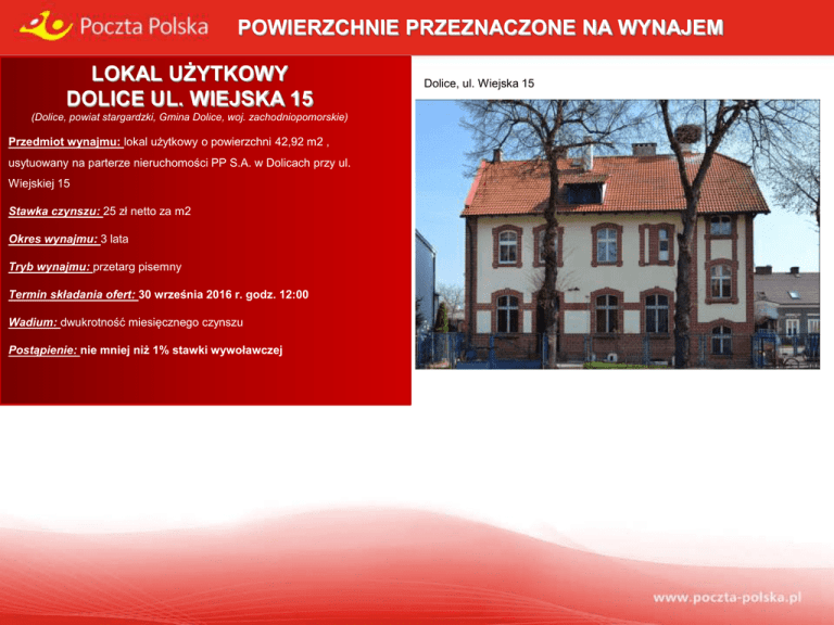 POWIERZCHNIE PRZEZNACZONE NA WYNAJEM - LOKAL UŻYTKOWY DOLICE UL. WIEJSKA 15 (Dolice, powiat stargardzki, Gmina Dolice, woj. zachodniopomorskie) Przedmiot wynajmu: lokal użytkowy o powierzchni 42,92 m2 , usytuowany na parterze nieruchomości PP S.A. w Dolicach przy ul. Wiejskiej 15 Stawka czynszu: 25 zł netto za m2 Okres wynajmu: 3 lata Tryb wynajmu: przetarg pisemny Termin składania ofert: 30 września 2016 r. godz. 12:00 Wadium: dwukrotność miesięcznego czynszu Postąpienie: nie mniej niż 1% stawki wywoławczej Dolice, ul. Wiejska 15 Opis przedmiotu wynajmu: Oferowana do wynajmu część nieruchomości położona jest w budynku użytkowo-mieszkalnym w gminie Dolice przy ul. Wiejskiej 15. Dolice znajdują się w południowej części powiatu stargardzkiego, w odległości ok. 25 km od Stargardu. W budynku PP S.A. funkcjonuje placówka pocztowa. Wynajmowi podlega lokal usytuowany na parterze nieruchomości o łącznej powierzchni użytkowej 42,92 m 2. Na metraż lokalu składają się pomieszczenia oznaczone w inwentaryzacji numerami 13 – 21,96 m2; 14 – 4,20 m2, 15 – 3,84 m2; 16 – 5,20 m2; 17 – 7,72 m2. Lokal nie posiada pomieszczeń sanitarnych. Lokal posiada niezależne wejście. Opłaty związane z eksploatacją przedmiotowej części nieruchomości tj. centralne ogrzewanie pobór energii elektrycznej, wywóz nieczystości stałych, pobór wody i odprowadzanie ścieków obciążają Najemcę. Do czynszu i opłat związanych z eksploatacją nieruchomości doliczony zostanie podatek VAT w stawce zgodnej z obowiązującymi przepisami. Lokal przeznaczony do wynajmu Opis nieruchomości: Miejscowość Ulica, nr budynku Powierzchnia budynku, w których zlokalizowany jest przedmiot wynajmu Nr działki ewidencyjnej, obręb Księga wieczysta, Sąd Rejonowy, Nr Wydziału Dolice ul. Wiejska 15 567,98 m2 1247 SZ2T/00010648/7 prowadzona przez Sąd Rejonowy w Stargardzie, VI Zamiejscowy Wydział Ksiąg Wieczystych z siedzibą w Pyrzycach. Stan prawny gruntu Wieczyste użytkowanie Rzut pomieszczeń oferowanych do wynajmu – parter Lokalizacja i dostępność komunikacyjna: Oferowana do wynajmu część nieruchomości położona jest w budynku użytkowo-mieszkalnym w gminie Dolice przy ul. Wiejskiej 15. Dolice znajdują się w południowej części powiatu stargardzkiego, w odległości ok. 25 km od Stargardu. W budynku PP S.A. funkcjonuje placówka pocztowa. Źródło http://www.punktyadresowe.pl/ OGŁOSZENIE O PRZETARGU PISEMNYM NA NAJEM LOKALU UŻYTKOWEGO W DOLICACH PRZY UL. WIEJSKIEJ 15 Wynajmujący: POCZTA POLSKA S.A. z siedzibą w Warszawie, 00-940 Warszawa, ul. Rodziny Hiszpańskich 8. Prowadzący procedurę: Poczta Polska S.A. Pion Infrastruktury Obszar Operacyjny ds. Nieruchomości w Szczecinie, al. Niepodległości 41/42, 70-940 Szczecin. Poczta Polska S.A. Pion Infrastruktury Obszar Operacyjny ds. Nieruchomości w Szczecinie ogłasza przetarg pisemny na najem lokalu użytkowego o powierzchni 42,92 m2 usytuowanego na parterze w budynku PP S.A., w Dolicach przy ul. Wiejskiej 15, pod działalność niekolidującą z działalnością i wizerunkiem Poczty Polskiej S.A. Okres trwania umowy – 3 lata Charakterystyka nieruchomości: Oferowana do wynajmu część nieruchomości położona jest w budynku użytkowo-mieszkalnym w gminie Dolice przy ul. Wiejskiej 15. Dolice znajdują się w południowej części powiatu stargardzkiego, w odległości ok. 25 km od Stargardu. W budynku PP S.A. funkcjonuje placówka pocztowa. Przedmiot najmu: Wynajmowi podlega lokal usytuowany na parterze nieruchomości o łącznej powierzchni użytkowej 42,92 m2. Na metraż lokalu składają się pomieszczenia oznaczone w inwentaryzacji numerami 13 – 21,96 m2; 14 – 4,20 m2, 15 – 3,84 m2; 16 – 5,20 m2; 17 – 7,72 m2. Lokal nie posiada pomieszczeń sanitarnych. Oferowany do wynajmu lokal posiada niezależne wejście. Opłaty związane z eksploatacją przedmiotowej części nieruchomości tj. centralne ogrzewanie pobór energii elektrycznej, wywóz nieczystości stałych, pobór wody i odprowadzanie ścieków obciążają Najemcę. Do czynszu i opłat związanych z eksploatacją nieruchomości doliczony zostanie podatek VAT w stawce zgodnej z obowiązującymi przepisami. Wywoławcza stawka czynszu: 25,00 zł netto za m2 Okres wiązania ofert wynosi 60 dni. Do wyłonienia najemcy wystarczy złożenie jednej oferty i zaoferowanie stawki czynszu nie niższej od stawki wywoławczej. Jeżeli uczestnicy konkursu ofert zaoferują tą samą wysokość czynszu najmu, wynajmujący przeprowadzi między tymi uczestnikami licytację. Wadium: 2 146,00 PLN Postąpienie: wynosi co najmniej 1% stawki wywoławczej przypisanej do licytowanej powierzchni Szczegółowe informacje na temat procedury i warunków najmu można uzyskać w siedzibie Pionu Infrastruktury Obszar Operacyjny ds. nieruchomości w Szczecinie, al. Niepodległości 41/42, 70-940 Szczecin, Natalia Jąder - pokój nr 159 tel. 91 440 13 47, kom. 502-019-781, w godzinach od 730- 1530. Termin składania ofert: Pisemne oferty należy składać w zamkniętych kopertach w siedzibie prowadzącego procedurę pokój 137 (sekretariat) do dnia 30.09.2016 roku do godz. 12ºº. Na kopercie należy umieścić dopisek: „PI Szczecin przetarg pisemny na najem lokalu w Dolicach”. Otwarcie ofert nastąpi w dniu 03.10.2016 roku w siedzibie prowadzącego procedurę. Odpowiedź na złożone oferty zostanie udzielona w terminie 7 dni po otwarciu kopert i stwierdzeniu ważności oferty. Warunkiem przystąpienia do przetargu jest: 1. Wniesienie wadium przelewem na rachunek bankowy w Banku Pocztowym S.A. w Bydgoszczy nr konta: 85 1320 0019 0099 0718 2000 0025 w terminie do dnia: 29.09.2016 r., przy czym jako termin wpłaty rozumiany jest termin uznania wpłaty na rachunku Poczty Polskiej S.A. z dopiskiem na przelewie „PI Szczecin przetarg pisemny na najem lokalu w Dolicach” 2. Oferta musi zawierać: • Nazwisko i imię lub nazwę oferenta, adres, numer telefonu; • 