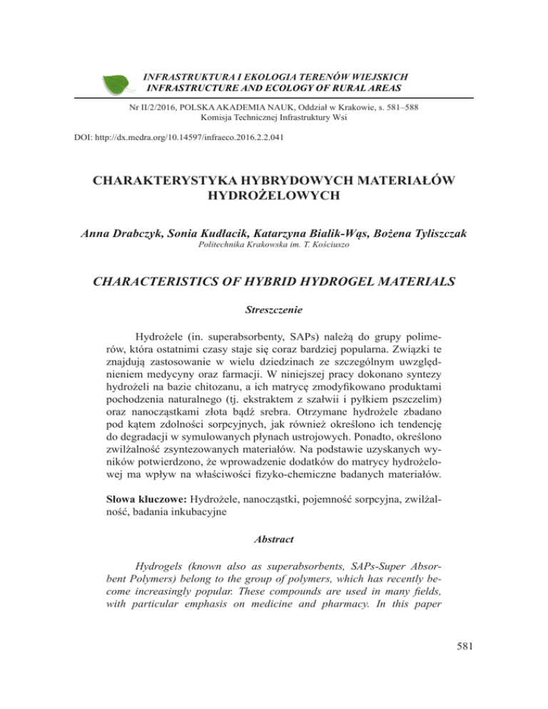 INFRASTRUKTURA I EKOLOGIA TERENÓW WIEJSKICH INFRASTRUCTURE AND ECOLOGY OF RURAL AREAS Nr II/2/2016, POLSKA AKADEMIA NAUK, Oddział w Krakowie, s. 581–588 Komisja Technicznej Infrastruktury Wsi DOI: http://dx.medra.org/10.14597/infraeco.2016.2.2.041 CHARAKTERYSTYKA HYBRYDOWYCH MATERIAŁÓW HYDROŻELOWYCH Anna Drabczyk, Sonia Kudłacik, Katarzyna Bialik-Wąs, Bożena Tyliszczak Politechnika Krakowska im. T. Kościuszo CHARACTERISTICS OF HYBRID HYDROGEL MATERIALS Streszczenie Hydrożele (in. superabsorbenty, SAPs) należą do grupy polimerów, która ostatnimi czasy staje się coraz bardziej popularna. Związki te znajdują zastosowanie w wielu dziedzinach ze szczególnym uwzględnieniem medycyny oraz farmacji. W niniejszej pracy dokonano syntezy hydrożeli na bazie chitozanu, a ich matrycę zmodyfikowano produktami pochodzenia naturalnego (tj. ekstraktem z szałwii i pyłkiem pszczelim) oraz nanocząstkami złota bądź srebra. Otrzymane hydrożele zbadano pod kątem zdolności sorpcyjnych, jak również określono ich tendencję do degradacji w symulowanych płynach ustrojowych. Ponadto, określono zwilżalność zsyntezowanych materiałów. Na podstawie uzyskanych wyników potwierdzono, że wprowadzenie dodatków do matrycy hydrożelowej ma wpływ na właściwości fizyko-chemiczne badanych materiałów. Słowa kluczowe: Hydrożele, nanocząstki, pojemność sorpcyjna, zwilżalność, badania inkubacyjne Abstract Hydrogels (known also as superabsorbents, SAPs-Super Absorbent Polymers) belong to the group of polymers, which has recently become increasingly popular. These compounds are used in many fields, with particular emphasis on medicine and pharmacy. In this paper 581 Anna Drabczyk, Sonia Kudłacik, Katarzyna Bialik-Wąs, Bożena Tyliszczak the synthesis of hydrogels based on chitosan which matrix was modified with products of natural origin (ie. extract of Salvia and bee pollen) and nanoparticles of gold or silver was carried out. The resulting hydrogels were tested for sorption capacity, as well as their tendency to degradation in simulated body fluid was determined. What is more, wettability of the attained materials was also defined. The obtained results confirmed that the introduction of additions to the hydrogel matrix has an impact on the physico-chemical properties of tested materials. Keywords: hydrogels, nanoparticles, sorption capacity, wettability, incubation studies WPROWADZENIE Hydrożele polimerowe są to materiały o charakterystycznej budowie, która warunkuje ich nietypowe właściwości. Wyróżniają one te związki na tle innych tworzyw sztucznych, w wyniku czego polimery te znajdują zastosowanie w wielu dziedzinach ze szczególnym uwzględnieniem medycyny i farmacji. Omawiane materiały składają się z łańcuchów polimerowych, pomiędzy którymi występują liczne wiązania poprzeczne. Układ taki przypomina trójwymiarową sieć, której gęstość usieciowania zależy od ilości owych wiązań poprzecznych. We wnętrzu polimerowej sieci znajdują się wolne przestrzenie, które są zapełniane przez wodę w procesie pęcznienia. Proces ten jest możliwy ze względu na obecność licznych grup hydrofilowych w łańcuchach polimerowych. W kontakcie z wodą dochodzi do dysocjacji owych grup, co indukuje wystąpienie dodatkowych oddziaływań elektrostatycznych. Obserwowane jest odpychanie się jednoimiennych jonów, w konsekwencji czego dochodzi do zwiększania się odległości pomiędzy łańcuchami polimerowymi, a tym samym do powiększenia się wolnej przestrzeni dostępnej dla wody. Do matrycy hydrożelowej wprowadzane są różnorodne dodatki, które powodują zmianę właściwości fizykochemicznych materiału. W niniejszej pracy matrycę zmodyfikowano poprzez dodanie ekstraktu z szałwii oraz pyłku pszczelego. Obydwa wymienione dodatki charakteryzują się bogatym składem chemicznym. Zawierają m.in. szereg witamin i minerałów, dzięki czemu znajdują zastosowanie w medycynie bądź farmacji. Wprowadzane do matrycy polimerowej nanocząstki złota lub srebra również stanowią bardzo interesujący materiał, który jest wykorzystywany m. in. w medycynie. Warto także zauważyć, że wspominane nanocząstki charakteryzują się właściwościami przeciwbakteryjnymi. 582 Charakterystyka hybrydowych materiałów ... MATERIAŁ I METODY Pierwszym krokiem w prowadzonej syntezie było sporządzenie 0,05 % roztworu kwasu octowego, a następnie rozpuszczenie w nim odpowiednich ilości żelatyny, chitozanu oraz Beetosanu (chitozanu otrzymanego w wyniku wieloetapowej obróbki chemicznej martwych pszczół). Kolejno, do otrzymanego roztworu dodano 0,5 % roztwór pyłku pszczelego, ekstrakt z szałwii oraz nanocząstki złota bądź srebra. W następnej kolejności dodano czynnik sieciujący (diakrylan poli(glikolu etylenowego); Mw=700g/mol) oraz fotoinicjator (2-hydroksy-2-metylopropiofenon, Darocur 1173). Uzyskaną w ten sposób mieszaninę wylewano na szalkę Petriego i poddawano działaniu promieniowania UV przez 1-2 min. Do procesu fotopolimeryzacji wykorzystano lampę Emita VP-60 o mocy 120 W, stosowana długość fali λ=320 nm. Tabela 1. Skład otrzymanych kompozycji. Table 1. The composition of reserwed mixtures Lp. Chitozan Beetosan Żelatyna Pyłek Fotoini- PEGDA Szałwia NanoAg NanoAu (1,5%) (1,5%) (2%) pszczeli cjator 700 1 15 ml 15 ml 20 ml 2,5 ml 2,5 ml 0,25 ml 8 ml - - 2 15 ml 15 ml 20 ml 2,5 ml 2,5 ml 0,25 ml 8 ml 3 ml - 3 15 ml 15 ml 20 ml 2,5 ml 2,5 ml 0,25 ml 8 ml - 3 ml Otrzymane kompozycje wysuszono w temperaturze pokojowej, a następnie wycięto z nich próbki i poddano następującym badaniom: • badania inkubacyjne – próbki zsyntezowanych hydrożeli zanurzono w 50 ml następujących płynów: woda destylowana oraz symulowane płyny ustrojowe (tj. płyn Ringera oraz SBF), po czym inkubowano przez 7dni w temperaturze 310°C. Przez cały okres inkubacji monitorowano pH roztworów, w których zanurzone były próbki. • badanie ok