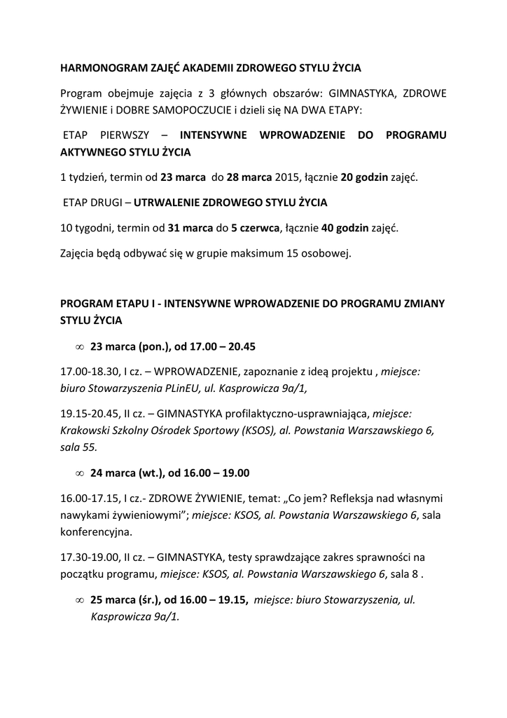 HARMONOGRAM ZAJĘĆ AKADEMII ZDROWEGO STYLU ŻYCIA Program obejmuje zajęcia z 3 głównych obszarów: GIMNASTYKA, ZDROWE ŻYWIENIE i DOBRE SAMOPOCZUCIE i dzieli się NA DWA ETAPY: ETAP PIERWSZY – INTENSYWNE AKTYWNEGO STYLU ŻYCIA WPROWADZENIE DO PROGRAMU 1 tydzień, termin od 23 marca do 28 marca 2015, łącznie 20 godzin zajęć. ETAP DRUGI – UTRWALENIE ZDROWEGO STYLU ŻYCIA 10 tygodni, termin od 31 marca do 5 czerwca, łącznie 40 godzin zajęć. Zajęcia będą odbywać się w grupie maksimum 15 osobowej. PROGRAM ETAPU I - INTENSYWNE WPROWADZENIE DO PROGRAMU ZMIANY STYLU ŻYCIA • 23 marca (pon.), od 17.00 – 20.45 17.00-18.30, I cz. – WPROWADZENIE, zapoznanie z ideą projektu , miejsce: biuro Stowarzyszenia PLinEU, ul. Kasprowicza 9a/1, 19.15-20.45, II cz. – GIMNASTYKA profilaktyczno-usprawniająca, miejsce: Krakowski Szkolny Ośrodek Sportowy (KSOS), al. Powstania Warszawskiego 6, sala 55. • 24 marca (wt.), od 16.00 – 19.00 16.00-17.15, I cz.- ZDROWE ŻYWIENIE, temat: „Co jem? Refleksja nad własnymi nawykami żywieniowymi”; miejsce: KSOS, al. Powstania Warszawskiego 6, sala konferencyjna. 17.30-19.00, II cz. – GIMNASTYKA, testy sprawdzające zakres sprawności na początku programu, miejsce: KSOS, al. Powstania Warszawskiego 6, sala 8 . • 25 marca (śr.), od 16.00 – 19.15, miejsce: biuro Stowarzyszenia, ul. Kasprowicza 9a/1. 16.00-17.30, I. cz. DOBRE SAMOPOCZUCIE, tematy: zagadnienia związane ze zmianą nawyków, odkrywanie własnych mocnych stron, ustalanie celów na czas kursu. 17.45 -19.15, II cz. ZDROWE ŻYWIENIE, temat: "Czy wspólne jedzenie lepiej smakuje? – warsztaty kulinarne "(wspólna kolacja). • 27 marca (czw.), od 16.00 – 19.15 16.00-17.30 – GIMNASTYKA profilaktyczno-usprawniająca: ćwiczenia cardio oraz wzmacniające; miejsce: KSOS, al. Powstania Warszawskiego 6, sala 8. 17.45 -19.15, II cz. DOBRE SAMOPOCZUCIE, temat: praca nad własnym potencjałem i kompetencjami, które mogą być rozwijane; ćwiczenie radzenia sobie ze stresem, miejsce: KSOS, al. Powstania Warszawskiego 6, sala wykładowa. • 28 marca (pt.), od 10.00 – 13.30 10.00-11.30 – GIMNASTYKA profilaktyczno-usprawniająca: ćwiczenia wzmacniające oraz rozciąganie; miejsce: KSOS, al. Powstania Warszawskiego 6, sala 8. 12.00 -13.30, II cz. DOBRE SAMOPOCZUCIE, temat: podsumowanie tygodnia, praca nad motywacją do zmiany nawyków na aktywny styl życia, zaplanowanie celów na kolejny etap programu; miejsce: KSOS, al. Powstania Warszawskiego 6, sala wykładowa. PROGRAM ETAPU II - UTRWALENIE ZDROWEGO STYLU ŻYCIA Zajęcia będą odbywać się 2 razy w tygodniu, w godzinach popołudniowych przez 10 tygodni. Średnio na każdy tydzień przypadają 4 godz. zajęć (4 x 45 min.). Początek ok. godz. 17.00, zakończenie ok. godz. 18.45. Większość sesji składać się będzie z 2 części: - 45 min. zajęć teoretycznych z zakresu DOBRE SAMOPOCZUCIE lub ZDROWE ŻYWIENIE - 45 min. GIMNASTYKA W niektórych dniach w ramach gimnastyki odbędą się zajęcia rytmicznotaneczne. W trakcie programu przewidziane jest kilka zajęć, które odbiegają od powyższego schematu: 28 kwietnia – dwugodzinne zajęcia w plenerze – w parku, 5 maja – wycieczka za miasto, zajęcia na terenie Jury KrakowskoCzęstochowskiej (w razie zainteresowania grupy możliwe przeniesienie wycieczki na sobotę). 12 maja – zajęcia na basenie.