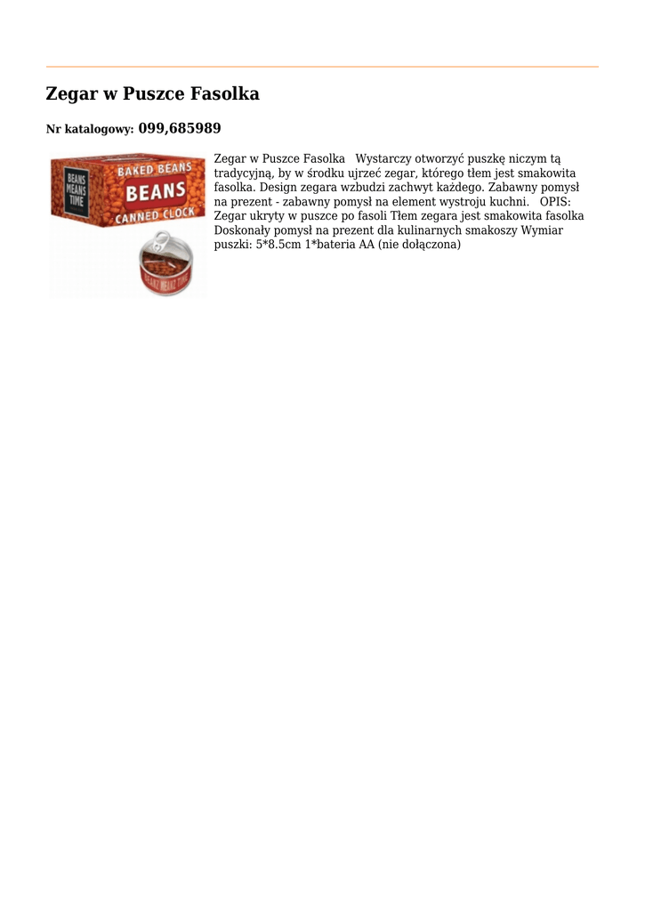 Zegar w Puszce Fasolka Nr katalogowy: 099,685989 Zegar w Puszce Fasolka Wystarczy otworzyć puszkę niczym tą tradycyjną, by w środku ujrzeć zegar, którego tłem jest smakowita fasolka. Design zegara wzbudzi zachwyt każdego. Zabawny pomysł na prezent - zabawny pomysł na element wystroju kuchni. OPIS: Zegar ukryty w puszce po fasoli Tłem zegara jest smakowita fasolka Doskonały pomysł na prezent dla kulinarnych smakoszy Wymiar puszki: 5*8.5cm 1*bateria AA (nie dołączona)