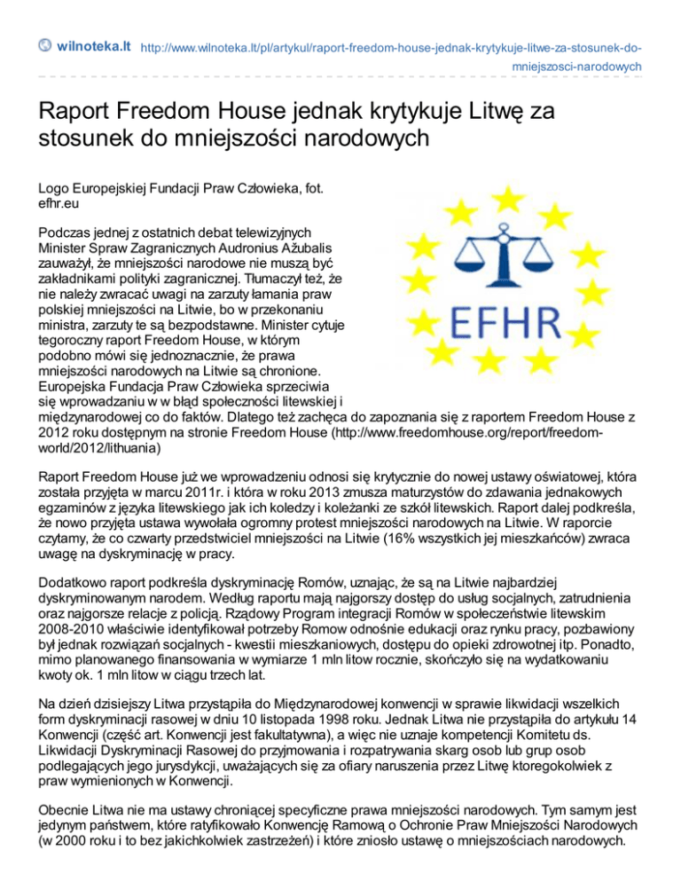 wilnoteka.lt http://www.wilnoteka.lt/pl/artykul/raport-freedom-house-jednak-krytykuje-litwe-za-stosunek-domniejszosci-narodowych Raport Freedom House jednak krytykuje Litwę za stosunek do mniejszości narodowych Logo Europejskiej Fundacji Praw Człowieka, fot. efhr.eu Podczas jednej z ostatnich debat telewizyjnych Minister Spraw Zagranicznych Audronius Ažubalis zauważył, że mniejszości narodowe nie muszą być zakładnikami polityki zagranicznej. Tłumaczył też, że nie należy zwracać uwagi na zarzuty łamania praw polskiej mniejszości na Litwie, bo w przekonaniu ministra, zarzuty te są bezpodstawne. Minister cytuje tegoroczny raport Freedom House, w którym podobno mówi się jednoznacznie, że prawa mniejszości narodowych na Litwie są chronione. Europejska Fundacja Praw Człowieka sprzeciwia się wprowadzaniu w w błąd społeczności litewskiej i międzynarodowej co do faktów. Dlatego też zachęca do zapoznania się z raportem Freedom House z 2012 roku dostępnym na stronie Freedom House (http://www.freedomhouse.org/report/freedomworld/2012/lithuania) Raport Freedom House już we wprowadzeniu odnosi się krytycznie do nowej ustawy oświatowej, która została przyjęta w marcu 2011r. i która w roku 2013 zmusza maturzystów do zdawania jednakowych egzaminów z języka litewskiego jak ich koledzy i koleżanki ze szkół litewskich. Raport dalej podkreśla, że nowo przyjęta ustawa wywołała ogromny protest mniejszości narodowych na Litwie. W raporcie czytamy, że co czwarty przedstwiciel mniejszości na Litwie (16% wszystkich jej mieszkańców) zwraca uwagę na dyskryminację w pracy. Dodatkowo raport podkreśla dyskryminację Romów, uznając, że są na Litwie najbardziej dyskryminowanym narodem. Według raportu mają najgorszy dostęp do usług socjalnych, zatrudnienia oraz najgorsze relacje z policją. Rządowy Program integracji Romów w społeczeństwie litewskim 2008-2010 właściwie identyfikował potrzeby Romow odnośnie edukacji oraz rynku pracy, pozbawiony był jednak rozwiązań socjalnych - kwestii mieszkaniowych, dostępu do opieki zdrowotnej itp. Ponadto, mimo planowanego finansowania w wymiarze 1 mln litow rocznie, skończyło się na wydatkowaniu kwoty ok. 1 mln litow w ciągu trzech lat. Na dzień dzisiejszy Litwa przystąpiła do Międzynarodowej konwencji w sprawie likwidacji wszelkich form dyskryminacji rasowej w dniu 10 listopada 1998 roku. Jednak Litwa nie przystąpiła do artykułu 14 Konwencji (część art. Konwencji jest fakultatywna), a więc nie uznaje kompetencji Komitetu ds. Likwidacji Dyskryminacji Rasowej do przyjmowania i rozpatrywania skarg osob lub grup osob podlegających jego jurysdykcji, uważających się za ofiary naruszenia przez Litwę ktoregokolwiek z praw wymienionych w Konwencji. Obecnie Litwa nie ma ustawy chroniącej specyficzne prawa mniejszości narodowych. Tym samym jest jedynym państwem, które ratyfikowało Konwencję Ramową o Ochronie Praw Mniejszości Narodowych (w 2000 roku i to bez jakichkolwiek zastrzeżeń) i które zniosło ustawę o mniejszościach narodowych. Dlatego też od roku 2010 nie istnieje prawo chroniące tę wrażliwą grupę. Od jej uczlenia przeciwko przedstawicielom mniejszości narodowych wszczęto wiele administracyjnych i prawnych postępowań oraz nałożono liczne, wysokie kary pieniężne. Wypowiedzi szerzące nienawiść, prześladowania, uprzedzenia, stereotypy oraz negatywny obraz grup mniejszościowych stały się niestety powszechne w litewskich mediach, łącznie z komentarzami czytelników a nawet aktów agresii. Znane są tylko nieliczne procesy sądowe dotyczące dyskryminacji na tle rasowym i etnicznym, a wyroki są skandalicznie niskie i nieproporcjonalne do winy. Liczne ataki rasistowskie nie były odpowiednio zbadane, kwalifikowane jako zwykłe rozboje, a przestępcy nie zostali pociągnięci do odpowiedzialności karnej. Należy przypomnieć, że w lutym 2011 r. Instytut Monitorowania Praw Człowieka w Wilnie (HRMI) w swym Raporcie Alternatywnym na podstawie Czwartego i Piątego Raportu Okresowego Litwy, który powstał w oparciu o Międzynarodową Konwencję ws likwidacji wszelkich form dyskryminacji rasowej (CERD) podkreślił, że „Litwa charakteryzuje się niskim poziomem wiedzy o prawach człowieka wśród decydentów, urzędników państwowych, sądownictwa, mediów i generalnie społeczeństwa. Państwo musi rozwinąć skuteczne ramy instytucjonalne i prawne w celu ochrony praw człowieka na Litwie.” Europejska Fundacja Praw Człowieka w podobnym raporcie z marca 2011 roku podkreśliła, iż utożsamia się z argumentami i oświadczeniami zawartymi w Alternatywnym Raporcie, przedstawionym przez HRMI. W raporcie dotyczącym praw człowieka na Litwie autorstwa Biura Demokracji, Praw Człowieka i Pracy z dnia 8 kwietnia 2011 roku stwierdza się, że "dyskryminacja mniejszości etnicznych na Litwie wciąż istnieje“ oraz że „nietolerancja i społeczna dyskryminacja wobec mniejszości etnicznych i narodowych nie znika". Podkreśla się również, iż „antysemickie i rasistowskie komentarze w internecie pozostają powszechne“. Należy także przytoczyć opinię Komitetu Doradczego Konwencji Ramowej o Ochronie Praw Mniejszości Narodowych dotyczącego Litwy, które został opublikowany w 2011. W nim stwierdza się m.in. że na Litwie nadal istnieje problem wdrażania w życie Konwencji Ramowej, a w szczególnoći zapisów gwarantujących prawa językowe w życiu publicznym. Pozostaje nadal duża niepewności w zakresie praw mniejszości narodowych związana ze sprzecznymi przepisami ustawy o mniejszościach narodowych (raport był pisany w czasie, kiedy ustawa ta jeszcze była ważna - należy zatem się zastanowić jak bardzo krytyczny będzie musiał być kolejny raport, po unieważnieniu tej ustawy) i ustawy o języku państwowym. Skoro, jak twierdzi szef litewskiego resortu dyplomacji Audronius Ažubalis, "prawa mniejszości narodowych na Litwie są obron