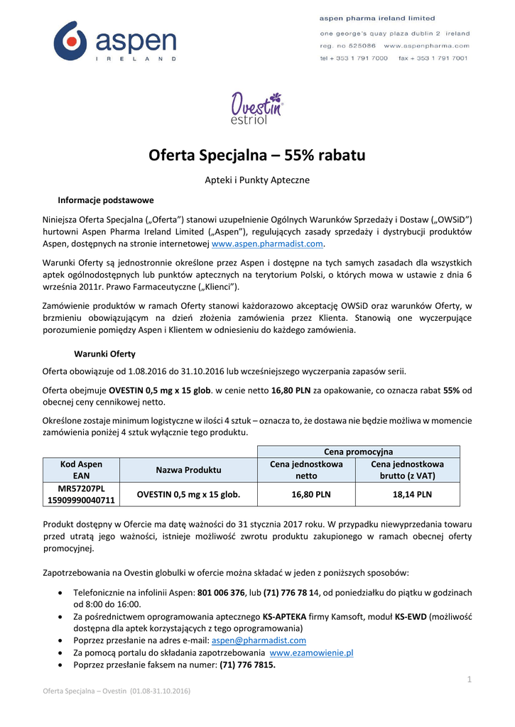 Oferta Specjalna – 55% rabatu Apteki i Punkty Apteczne Informacje podstawowe Niniejsza Oferta Specjalna („Oferta”) stanowi uzupełnienie Ogólnych Warunków Sprzedaży i Dostaw („OWSiD”) hurtowni Aspen Pharma Ireland Limited („Aspen”), regulujących zasady sprzedaży i dystrybucji produktów Aspen, dostępnych na stronie internetowej www.aspen.pharmadist.com. Warunki Oferty są jednostronnie określone przez Aspen i dostępne na tych samych zasadach dla wszystkich aptek ogólnodostępnych lub punktów aptecznych na terytorium Polski, o których mowa w ustawie z dnia 6 września 2011r. Prawo Farmaceutyczne („Klienci”). Zamówienie produktów w ramach Oferty stanowi każdorazowo akceptację OWSiD oraz warunków Oferty, w brzmieniu obowiązującym na dzień złożenia zamówienia przez Klienta. Stanowią one wyczerpujące porozumienie pomiędzy Aspen i Klientem w odniesieniu do każdego zamówienia. Warunki Oferty Oferta obowiązuje od 1.08.2016 do 31.10.2016 lub wcześniejszego wyczerpania zapasów serii. Oferta obejmuje OVESTIN 0,5 mg x 15 glob. w cenie netto 16,80 PLN za opakowanie, co oznacza rabat 55% od obecnej ceny cennikowej netto. Określone zostaje minimum logistyczne w ilości 4 sztuk – oznacza to, że dostawa nie będzie możliwa w momencie zamówienia poniżej 4 sztuk wyłącznie tego produktu. Kod Aspen EAN MR57207PL 15909990040711 Nazwa Produktu OVESTIN 0,5 mg x 15 glob. Cena promocyjna Cena jednostkowa Cena jednostkowa netto brutto (z VAT) 16,80 PLN 18,14 PLN Produkt dostępny w Ofercie ma datę ważności do 31 stycznia 2017 roku. W przypadku niewyprzedania towaru przed utratą jego ważności, istnieje możliwość zwrotu produktu zakupionego w ramach obecnej oferty promocyjnej. Zapotrzebowania na Ovestin globulki w ofercie można składać w jeden z poniższych sposobów: Telefonicznie na infolinii Aspen: 801 006 376, lub (71) 776 78 14, od poniedziałku do piątku w godzinach od 8:00 do 16:00. Za pośrednictwem oprogramowania aptecznego KS-APTEKA firmy Kamsoft, moduł KS-EWD (możliwość dostępna dla aptek korzystających z tego oprogramowania) Poprzez przesłanie na adres e-mail: [email protected] Za pomocą portalu do składania zapotrzebowania www.ezamowienie.pl Poprzez przesłanie faksem na numer: (71) 776 7815. 1 Oferta Specjalna – Ovestin (01.08-31.10.2016)