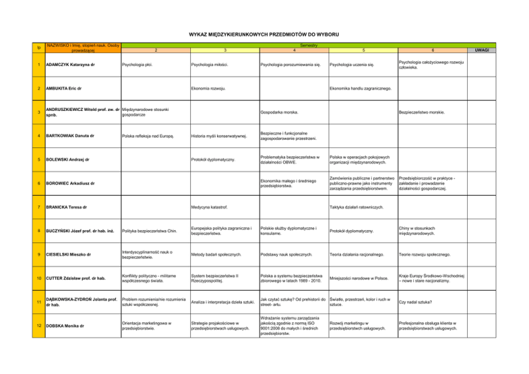 WYKAZ MIĘDZYKIERUNKOWYCH PRZEDMIOTÓW DO WYBORU