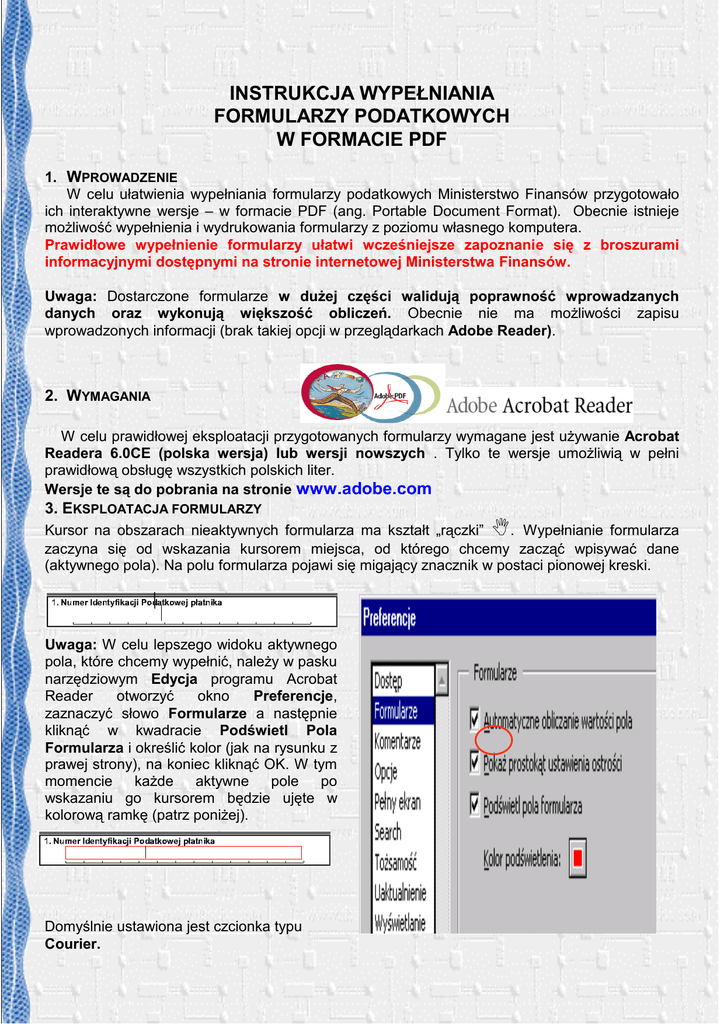 INSTRUKCJA WYPEŁNIANIA FORMULARZY PODATKOWYCH W FORMACIE PDF 1. WPROWADZENIE W celu ułatwienia wypełniania formularzy podatkowych Ministerstwo Finansów przygotowało ich interaktywne wersje – w formacie PDF (ang. Portable Document Format). Obecnie istnieje możliwość wypełnienia i wydrukowania formularzy z poziomu własnego komputera. Prawidłowe wypełnienie formularzy ułatwi wcześniejsze zapoznanie się z broszurami informacyjnymi dostępnymi na stronie internetowej Ministerstwa Finansów. Uwaga: Dostarczone formularze w dużej części walidują poprawność wprowadzanych danych oraz wykonują większość obliczeń. Obecnie nie ma możliwości zapisu wprowadzonych informacji (brak takiej opcji w przeglądarkach Adobe Reader). 2. WYMAGANIA W celu prawidłowej eksploatacji przygotowanych formularzy wymagane jest używanie Acrobat Readera 6.0CE (polska wersja) lub wersji nowszych . Tylko te wersje umożliwią w pełni prawidłową obsługę wszystkich polskich liter. Wersje te są do pobrania na stronie www.adobe.com 3. EKSPLOATACJA FORMULARZY Kursor na obszarach nieaktywnych formularza ma kształt „rączki” N. Wypełnianie formularza zaczyna się od wskazania kursorem miejsca, od którego chcemy zacząć wpisywać dane (aktywnego pola). Na polu formularza pojawi się migający znacznik w postaci pionowej kreski. Uwaga: W celu lepszego widoku aktywnego pola, które chcemy wypełnić, należy w pasku narzędziowym Edycja programu Acrobat Reader otworzyć okno Preferencje, zaznaczyć słowo Formularze a następnie kliknąć w kwadracie Podświetl Pola Formularza i określić kolor (jak na rysunku z prawej strony), na koniec kliknąć OK. W tym momencie każde aktywne pole po wskazaniu go kursorem będzie ujęte w kolorową ramkę (patrz poniżej). Domyślnie ustawiona jest czcionka typu Courier. 1 Wskazane jest wypełnianie formularza kolejno, pole za polem, (zwłaszcza w obrębie danych z kwotami) oraz stosowanie opisów (reguł) dotyczących poszczególnych pozycji, celem uniknięcia pomyłek w wypełnianiu. Przesuwanie po polach odbywa się za pomocą kursora myszki albo za pomocą klawisza tabulacji (Tab) do przodu lub klawisza Shift+Tab do tyłu. Wypełniając pola zawierające różne typy numerów, daty oraz groszy, formularz przyjmie w nich tylko ograniczoną liczbę znaków, określoną dla tego pola (patrz przykłady poniżej). Pola wymagające wpisania większej ilości znaków posiadają zdolność automatycznego dopasowywania wielkości czcionki, tak aby wprowadzany tekst w całości zmieścił się w danym polu (patrz przykłady poniżej). Wpisując kwoty w pozycje, gdzie należy podać kwotę złotych i groszy, trzeba na początku wpisać kwotę złotych, a następnie kropkę (korzystając z literowej części klawiatury), po kropce należy wpisać kwotę groszy (dwie cyfry), jeżeli w groszach wpiszemy więcej niż dwie cyfry, po przejściu do następnego pola kwota groszy zostanie zaokrąglona do dwóch cyfr. Wpisanie tylko samej kwoty w złotych lub nie wpisanie kropki (lub wstawienie przecinka zamiast kropki) spowoduje po przejściu do następnego pola automatyczne wpisanie kropki, a po nim zerowej kwoty groszy. W pozycjach gdzie wymagane jest podanie kwoty po zaokrągleniu do pełnych złotych należy wpisać jedynie kwotę bez kropki. Pola wykonujące obliczenia posiadają automatycznie wpisane 0 lub 0.00 - w pola te nie należy nic wpisywać. W celu poprawienia uprzednio wpisanej kwoty należy ją zaznaczyć (podświetlić) a następnie usunąć klawiszem Delete oraz wpisać ją na nowo. Aby zaznaczyć kwadrat w polu jednokrotnego wyboru, należy wskazać go kursorem i kliknąć na nim myszką lub zatwierdzić go klawiszem Enter. Pole tego typu pozwoli zaznaczyć tylko jeden kwadrat (patrz przykład poniżej). W polach wielokrotnego wyboru można zaznaczać dowolne kwadraty (patrz przykład poniżej). 2 W formularzach wielostronnicowych znajdują się przyciski służące do szybkiego poruszania się na poszczególnych jego stronach. Po jego naciśnięciu pojawi się okno dialogowe, w które należy wpisać numer strony, na którą chcemy się przenieść. Przycisk ZAMKNIJ zamyka formularz. Przycisk DRUKUJ spowoduje wydrukowanie wypełnionego już formularza. Przy drukowaniu formularza na drukarce kolorowej zaleca się wybranie opcji druku DRUKUJ JAKO OBRAZEK (PRINT AS IMAGE) zaś na drukarce kolorowej dodatkowo DRUKUJ W ODCIENIACH SZAROŚCI. UWAGA: Przyciski te nie są drukowane na formularzu. W celu uzyskania pomocy dla konkretnego pola można wybrać myszką znak ? . Otworzy się wówczas okno z objaśnieniami dotyczącymi sposobu wypełnienia konkretnego pola. 3