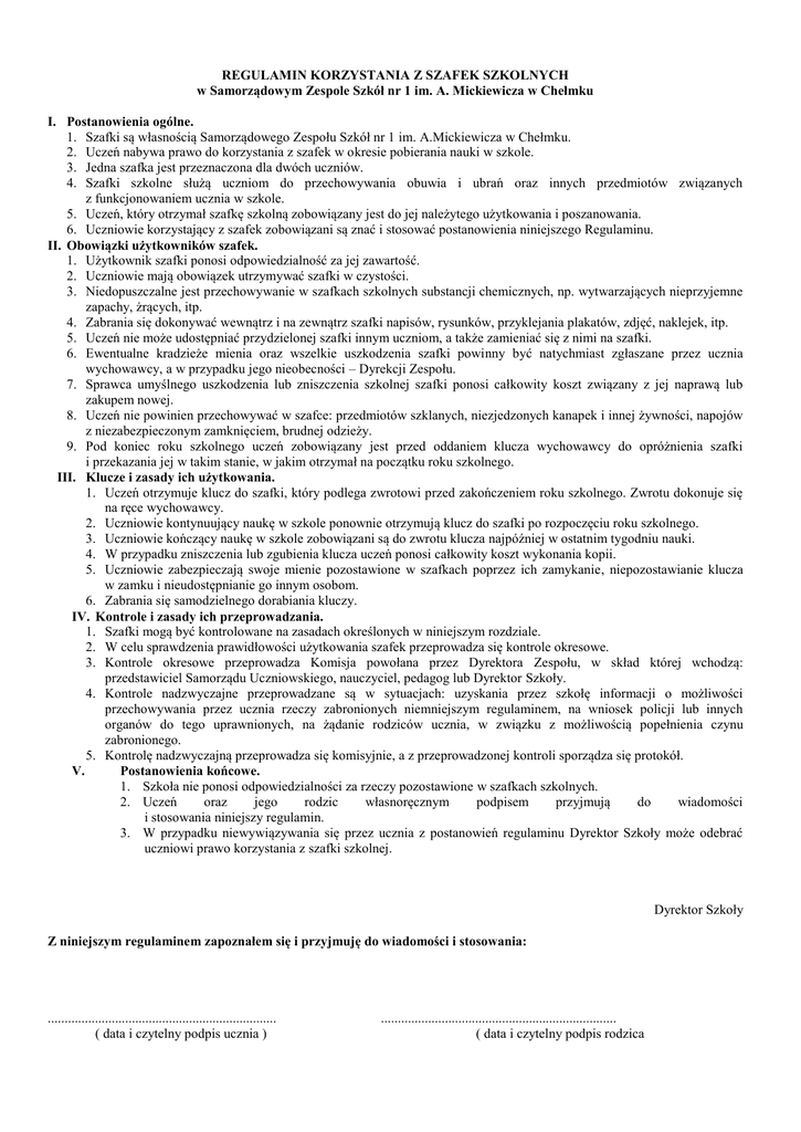 REGULAMIN KORZYSTANIA Z SZAFEK SZKOLNYCH w Samorządowym Zespole Szkół nr 1 im. A. Mickiewicza w Chełmku I. Postanowienia ogólne. 1. Szafki są własnością Samorządowego Zespołu Szkół nr 1 im. A.Mickiewicza w Chełmku. 2. Uczeń nabywa prawo do korzystania z szafek w okresie pobierania nauki w szkole. 3. Jedna szafka jest przeznaczona dla dwóch uczniów. 4. Szafki szkolne służą uczniom do przechowywania obuwia i ubrań oraz innych przedmiotów związanych z funkcjonowaniem ucznia w szkole. 5. Uczeń, który otrzymał szafkę szkolną zobowiązany jest do jej należytego użytkowania i poszanowania. 6. Uczniowie korzystający z szafek zobowiązani są znać i stosować postanowienia niniejszego Regulaminu. II. Obowiązki użytkowników szafek. 1. Użytkownik szafki ponosi odpowiedzialność za jej zawartość. 2. Uczniowie mają obowiązek utrzymywać szafki w czystości. 3. Niedopuszczalne jest przechowywanie w szafkach szkolnych substancji chemicznych, np. wytwarzających nieprzyjemne zapachy, żrących, itp. 4. Zabrania się dokonywać wewnątrz i na zewnątrz szafki napisów, rysunków, przyklejania plakatów, zdjęć, naklejek, itp. 5. Uczeń nie może udostępniać przydzielonej szafki innym uczniom, a także zamieniać się z nimi na szafki. 6. Ewentualne kradzieże mienia oraz wszelkie uszkodzenia szafki powinny być natychmiast zgłaszane przez ucznia wychowawcy, a w przypadku jego nieobecności – Dyrekcji Zespołu. 7. Sprawca umyślnego uszkodzenia lub zniszczenia szkolnej szafki ponosi całkowity koszt związany z jej naprawą lub zakupem nowej. 8. Uczeń nie powinien przechowywać w szafce: przedmiotów szklanych, niezjedzonych kanapek i innej żywności, napojów z niezabezpieczonym zamknięciem, brudnej odzieży. 9. Pod koniec roku szkolnego uczeń zobowiązany jest przed oddaniem klucza wychowawcy do opróżnienia szafki i przekazania jej w takim stanie, w jakim otrzymał na początku roku szkolnego. III. Klucze i zasady ich użytkowania. 1. Uczeń otrzymuje klucz do szafki, który podlega zwrotowi przed zakończeniem roku szkolnego. Zwrotu dokonuje się na ręce wychowawcy. 2. Uczniowie kontynuujący naukę w szkole ponownie otrzymują klucz do szafki po rozpoczęciu roku szkolnego. 3. Uczniowie kończący naukę w szkole zobowiązani są do zwrotu klucza najpóźniej w ostatnim tygodniu nauki. 4. W przypadku zniszczenia lub zgubienia klucza uczeń ponosi całkowity koszt wykonania kopii. 5. Uczniowie zabezpieczają swoje mienie pozostawione w szafkach poprzez ich zamykanie, niepozostawianie klucza w zamku i nieudostępnianie go innym osobom. 6. Zabrania się samodzielnego dorabiania kluczy. IV. Kontrole i zasady ich przeprowadzania. 1. Szafki mogą być kontrolowane na zasadach określonych w niniejszym rozdziale. 2. W celu sprawdzenia prawidłowości użytkowania szafek przeprowadza się kontrole okresowe. 3. Kontrole okresowe przeprowadza Komisja powołana przez Dyrektora Zespołu, w skład której wchodzą: przedstawiciel Samorządu Uczniowskiego, nauczyciel, pedagog lub Dyrektor Szkoły. 4. Kontrole nadzwyczajne przeprowadzane są w sytuacjach: uzyskania przez szkołę informacji o możliwości przechowywania przez ucznia rzeczy zabronionych niemniejszym regulaminem, na wniosek policji lub innych organów do tego uprawnionych, na żądanie rodziców ucznia, w związku z możliwością popełnienia czynu zabronionego. 5. Kontrolę nadzwyczajną przeprowadza się komisyjnie, a z przeprowadzonej kontroli sporządza się protokół. V. Postanowienia końcowe. 1. Szkoła nie ponosi odpowiedzialności za rzeczy pozostawione w szafkach szkolnych. 2. Uczeń oraz jego rodzic własnoręcznym podpisem przyjmują do wiadomości i stosowania niniejszy regulamin. 3. W przypadku niewywiązywania się przez ucznia z postanowień regulaminu Dyrektor Szkoły może odebrać uczniowi prawo korzystania z szafki szkolnej. Dyrektor Szkoły Z niniejszym regulaminem zapoznałem się i przyjmuję do wiadomości i stosowania: .................................................................... ( data i czytelny podpis ucznia ) ...................................................................... ( data i czytelny podpis rodzica