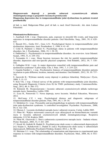 Diagnozowanie depresji z powodu zaburzeń czynnościowych układu stomatognatycznego u pacjentów leczonych protetycznie Diagnosing depression due to temporomandibular joint dysfunctions in patients treated prosthetically dr hab. n. med. Małgorzata Pihut, prof. dr hab. n. med. Józef Gierowski , lek. dent. Łukasz Palusiński Piśmiennictwo/References: 1. Auerbach S.M. i wsp.: Depression, pain, exposure to stressful life events, and long-term outcomes in temporomandibular disorder patients. Oral Maxillofac. Surg., 2001, 59, 6: 628– 633. 2. Bassett D.L., Gerke D.C., Goss A.N.: Psychological factors in temporomandibular joint dysfunction: depression. Aust. Prosthodont. J., 1990, 4: 41–45. 3. Celić R, Pandurić J, Dulcić N.: Psychologic status in patients with temporomandibular disorders. Int. J. Prosthodont., 2006, 19, 1: 28–29. 4. Dahlström L.: Psychometrics in temporomandibular disorders. An overview. Acta Odontol. Scand., 1993, 51, 6: 339–352. 5. Fernandes G. i wsp.: Sleep bruxism increases the risk for painful temporomandibular disorder, depression and non-specific physical symptoms. Oral Rehabil., 2012, 39, 7: 538– 544. 6. Gallagher R.M. i wsp.: Is major depression comorbid with temporomandibular pain and dysfunction syndrome? A pilot study. Clin. J. Pain. 1991, 7, 3: 219–225. 7. Guarda-Nardini L. i wsp.: Psychometric features of temporomandibular disorders patients in relation to pain diffusion, location, intensity and duration. Oral Rehabil., 2012, 39, 10: 737– 743. 8. Janowski K.: Wybrane metody oceny depresji w praktyce lekarskiej. Medycyna i Życie, 2009, 3: 11–15. 9. Kim Y.K. i wsp.: Clinical survey of the patients with temporomandibular joint disorders, using Research Diagnostic Criteria (Axis II) for TMD: preliminary study. Craniomaxillofac. Surg., 2012, 40, 4: 366–372. 10. Kleinrok M.: Rozpoznawanie i leczenie zaburzeń czynnościowych układu ruchowego narządu żucia. Sanmedica, Lublin 1990. 11. Łoza B., Parnowski T.: Nowa depresja, nowe leczenie. Medical Education, Warszawa 2012. 12. McCreary C.P. i wsp.: Psychological distress and diagnostic subgroups of temporomandibular disorder patients. Pain, 1991, 44, 1: 29–34. 13. Meldolesi G. i wsp.: Personality and psychopathology in patients with temporomandibular joint pain-dysfunction syndrome. A controlled investigation. Psychother. Psychosom., 2000, 69, 6: 322–328. 14. Okeson J.: Leczenie dysfunkcji narządu żucia i zaburzeń zwarcia. Czelej, Lublin 2005. 15. Pihut M.: Wpływ stosowania czasowych szyn okluzyjnych na biomechaniczne warunki żucia w leczeniu zaburzeń czynnościowych układu stomatognatycznego. Rozprawa doktorska. UJ CM, Kraków 2002. 16. Pihut M., Gierowski J.: Stres a zaburzenia czynnościowe narządu żucia – badania własne. Protet. Stomatol., 2003, 53, 5: 261–269. 17. Siwek M, Grabski B, Dudek D.: Psychiatryczne skale oceny w zaburzeniach depresyjnych [w]: Kiejna A., Rybakowski J., Dudek D. (red.): Psychiatryczne skale oceny w zaburzeniach depresyjnych, Biblioteka Psychiatrii Polskiej, Kraków 2012, s. 56–90. 18. Sherman J.J. i wsp.: The relationship of somatization and depression to experimental pain response in women with temporomandibular disorders. Psychosom. Med., 2004, 66, 6: 852– 860. 19. Takai K., Sone K.: Masked depression and the TMJ syndrome. Nihon Shika Ishikai Zasshi, 1985, 38, 2: 114–120. 20. Tejchman H., Majdańska Z.: Wpływ czynnika psychogennego na dolegliwości w układzie stomatognatycznym – wybrane przypadki. Protet. Stomatol., 2000, 50, 5: 277–288. 21. Tversky J. i wsp.: Role of depressive illness in the outcome of treatment of temporomandibular joint pain-dysfunction syndrome. Oral Surg. Oral Med. Oral Pathol., 1991, 71, 6: 696–699. 22. Vimpari S.S. i wsp.: Depressive symptoms associated with symptoms of the temporomandibular joint pain and dysfunction syndrome. Psychosom. Med., 1995, 57, 5: 439–444. 23. Wright J., Deary I.J., Geissler P.R.: Depression, hassles and somatic symptoms in mandibular dysfunction syndrome patients. J. Dent., 1991, 19, 6: 352–356.