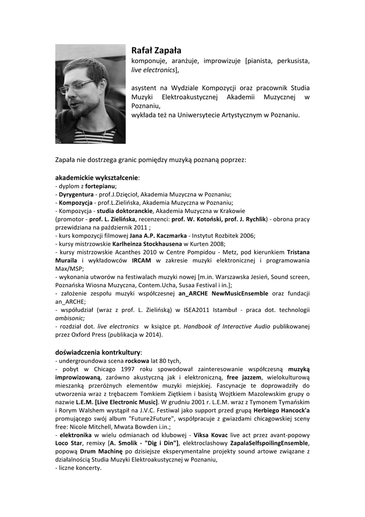 Rafał Zapała komponuje, aranżuje, improwizuje [pianista, perkusista, live electronics], asystent na Wydziale Kompozycji oraz pracownik Studia Muzyki Elektroakustycznej Akademii Muzycznej w Poznaniu, wykłada też na Uniwersytecie Artystycznym w Poznaniu. Zapała nie dostrzega granic pomiędzy muzyką poznaną poprzez: akademickie wykształcenie: -‐ dyplom z fortepianu; -‐ Dyrygentura -‐ prof.J.Dzięcioł, Akademia Muzyczna w Poznaniu; -‐ Kompozycja -‐ prof.L.Zielińska, Akademia Muzyczna w Poznaniu; -‐ Kompozycja -‐ studia doktoranckie, Akademia Muzyczna w Krakowie (promotor -‐ prof. L. Zielińska, recenzenci: prof. W. Kotoński, prof. J. Rychlik) -‐ obrona pracy przewidziana na październik 2011 ; -‐ kurs kompozycji filmowej Jana A.P. Kaczmarka -‐ Instytut Rozbitek 2006; -‐ kursy mistrzowskie Karlheinza Stockhausena w Kurten 2008; -‐ kursy mistrzowskie Acanthes 2010 w Centre Pompidou -‐ Metz, pod kierunkiem Tristana Muraila i wykładowców IRCAM w zakresie muzyki elektronicznej i programowania Max/MSP; -‐ wykonania utworów na festiwalach muzyki nowej [m.in. Warszawska Jesień, Sound screen, Poznańska Wiosna Muzyczna, Contem.Ucha, Susaa Festival i in.]; -‐ założenie zespołu muzyki współczesnej an_ARCHE NewMusicEnsemble oraz fundacji an_ARCHE; -‐ współudział (wraz z prof. L. Zielińską) w ISEA2011 Istambuł -‐ praca dot. technologii ambisonic; -‐ rozdział dot. live electronics w książce pt. Handbook of Interactive Audio publikowanej przez Oxford Press (publikacja w 2014). doświadczenia kontrkultury: -‐ undergroundowa scena rockowa lat 80 tych, -‐ pobyt w Chicago 1997 roku spowodował zainteresowanie współczesną muzyką improwizowaną, zarówno akustyczną jak i elektroniczną, free jazzem, wielokulturową mieszanką przeróżnych elementów muzyki miejskiej. Fascynacje te doprowadziły do utworzenia wraz z trębaczem Tomkiem Ziętkiem i basistą Wojtkiem Mazolewskim grupy o nazwie L.E.M. [Live Electronic Music]. W grudniu 2001 r. L.E.M. wraz z Tymonem Tymańskim i Rorym Walshem wystąpił na J.V.C. Festiwal jako support przed grupą Herbiego Hancock'a promującego swój album "Future2Future", współpracuje z gwiazdami chicagowskiej sceny free: Nicole Mitchell, Mwata Bowden i.in.; -‐ elektronika w wielu odmianach od klubowej -‐ Viksa Kovac live act przez avant-‐popowy Loco Star, remixy [A. Smolik -‐ "Dig i Din"], elektroclashowy ZapalaSelfspoilingEnsemble, popową Drum Machinę po dzisiejsze eksperymentalne projekty sound artowe związane z działalnością Studia Muzyki Elektroakustycznej w Poznaniu, -‐ liczne koncerty. doświadczenia współpracy z artystami innych obszarów sztuki -‐ muzyka do przedstawień teatralnych [z reż. J. Moszkowiczem], baletowych, filmu [m.in. trailer oraz "Making of" do filmu "Świadectwo" reż. P.Pitera], programów dokumentalnych i reklam, udział w projektach: Rogera Watersa -‐ "Ca Ira", Raya Wilsona (Genesis), -‐ współpraca z projektantami mody -‐ m.in. 3 -‐ letnia dyrekcja muzyczna festiwalu Art&Fashion [Stary Browar Poznań], -‐ z plastykami -‐ projekt i s o | a t i o n z Kobasem Laksą; współpraca z Ewą Łowżył. kontakt: [email protected] +48 506 050 417 www.zapala.com.pl