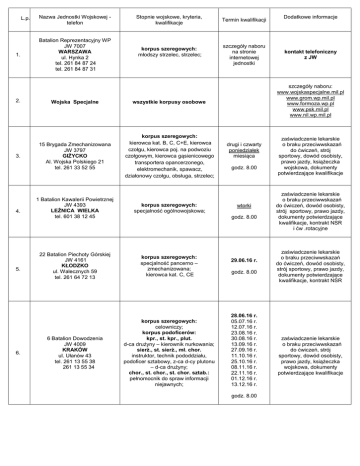 L.p. 1. 2. 3. 4. 5. 6. Nazwa Jednostki Wojskowej telefon Batalion Reprezentacyjny WP JW 7007 WARSZAWA ul. Hynka 2 tel. 261 84 87 24 tel. 261 84 87 31 Stopnie wojskowe, kryteria, kwalifikacje Termin kwalifikacji korpus szeregowych: młodszy strzelec, strzelec; szczegóły naboru na stronie internetowej jednostki Wojska Specjalne wszystkie korpusy osobowe 15 Brygada Zmechanizowana JW 3797 GIŻYCKO Al. Wojska Polskiego 21 tel. 261 33 52 55 korpus szeregowych: kierowca kat. B, C, C+E, kierowca czołgu, kierowca poj. na podwoziu czołgowym, kierowca gąsienicowego transportera opancerzonego, elektromechanik, spawacz, działonowy czołgu, obsługa, strzelec; 1 Batalion Kawalerii Powietrznej JW 4393 LEŹNICA WIELKA tel. 601 38 12 45 korpus szeregowych: specjalność ogólnowojskowa; 22 Batalion Piechoty Górskiej JW 4161 KŁODZKO ul. Walecznych 59 tel. 261 64 72 13 korpus szeregowych: specjalność pancerno – zmechanizowana; kierowca kat. C, CE 6 Batalion Dowodzenia JW 4009 KRAKÓW ul. Ułanów 43 tel. 261 13 55 38 261 13 55 34 korpus szeregowych: celowniczy; korpus podoficerów: kpr., st. kpr., plut. d-ca drużyny – kierownik nurkowania; sierż., st. sierż., mł. chor. instruktor, technik pododdziału, podoficer sztabowy, z-ca d-cy plutonu – d-ca drużyny; chor., st. chor., st. chor. sztab.: pełnomocnik do spraw informacji niejawnych; Dodatkowe informacje kontakt telefoniczny z JW szczegóły naboru: www.wojskaspecjalne.mil.pl www.grom.wp.mil.pl www.formoza.wp.pl www.psk.mil.pl www.nil.wp.mil.pl drugi i czwarty poniedziałek miesiąca godz. 8.00 wtorki godz. 8.00 29.06.16 r. godz. 8.00 28.06.16 r. 05.07.16 r. 12.07.16 r. 23.08.16 r. 30.08.16 r. 13.09.16 r. 27.09.16 r. 11.10.16 r. 25.10.16 r. 08.11.16 r. 22.11.16 r. 01.12.16 r. 13.12.16 r. godz. 8.00 zaświadczenie lekarskie o braku przeciwwskazań do ćwiczeń, strój sportowy, dowód osobisty, prawo jazdy, książeczka wojskowa, dokumenty potwierdzające kwalifikacje zaświadczenie lekarskie o braku przeciwwskazań do ćwiczeń, dowód osobisty, strój sportowy, prawo jazdy, dokumenty potwierdzające kwalifikacje, kontrakt NSR i ćw .rotacyjne zaświadczenie lekarskie o braku przeciwwskazań do ćwiczeń, dowód osobisty, strój sportowy, prawo jazdy, dokumenty potwierdzające kwalifikacje, kontrakt NSR zaświadczenie lekarskie o braku przeciwwskazań do ćwiczeń, strój sportowy, dowód osobisty, prawo jazdy, książeczka wojskowa, dokumenty potwierdzające kwalifikacje 7. 8. 10 Brygada Kawalerii Pancernej JW 2399 ŚWIĘTOSZÓW ul. Sztabowa 1 tel. 261 68 62 41 12 Brygada Zmechanizowana JW 1749 SZCZECIN ul. Wojska Polskiego 250 tel. 261 45 53 56 korpus szeregowych: wszystkie specjalności; czwartki godz. 8.00 korpus szeregowych: kierowca kat. C, C+E wtorki godz. 8.00 zaświadczenie lekarskie o braku przeciwwskazań do ćwiczeń, dowód osobisty, strój sportowy, prawo jazdy, dokumenty potwierdzające kwalifikacje zaświadczenie lekarskie o braku przeciwwskazań do ćwiczeń, książeczkę wojskową, strój sportowy, prawo jazdy, dokumenty potwierdzające kwalifikacje, świadectwo szkolne, kontrakt NSR, zaświadczenie o odbytych ćwiczeniach w NSR, opinię z ćwiczeń rotacyjnych (sł. przygotowawcza) 100 Batalion Łączności korpus szeregowych: kierowca kat. C+E korpus podoficerów: sierż., st. sierż., mł. chor.: dowódca aparatowni, dowódca radiostacji, dowódca terminala, technik terminala satelitarnego, technik ADR 100 Batalion Łączności JW 4092 WAŁCZ ul. Kościuszki 24 tel. 261 47 20 10 9. 104 Batalion Logistyczny tel. 261 47 31 13 102 Batalion Ochrony tel. 261 46 11 13 104 Batalion Logistyczny korpus oficerów: por./kpt.: dowódca zespołu- lekarz ppor./por.: lekarz 102 Batalion Ochrony Bielików korpus podoficerów: kpr., st. kpr., plut.: kancelista, dowódca drużyny, dowódca wozu dowodzenia, dowódca obsługi, ratownik medyczny sierż., st. sierż., mł. chor.: kierownik kancelarii, podoficer sztabowy, instruktor, technik kompanii, dowódca drużyny remontowej- kierownik warsztatu chor., st. chor., st. chor. sztab.: kierownik grupy kontakt telefoniczny z JW korpus szeregowych: kierowca kołowego transportera opancerzonego, kierowca kat. C, C+E 10. 23 Pułk Artylerii JW 1145 BOLESŁAWIEC ul. Wojska Polskiego tel. 261 64 66 08 korpus szeregowych: tokarz, celowniczy, kierowca kołowego transportera opancerzonego; kontakt telefoniczny z JW 11. 12. 13. 14. 15. 11 Batalion Dowodzenia JW 4071 ŻAGAŃ ul. Żarska tel. 261 68 84 57 korpus szeregowych: kierowca kat. C, C+E, T, środy korpus podoficerów: sierż., st. sierż., mł. chor.: w korpusach osobowych: Wojsk Lądowych, Łączności i Informatyki, Inżynierii Wojskowej, Logistyki, Wychowawczym; godz. 7:45 (przy biurze przepustek 34 BKPanc) 11 Pułk Artylerii JW 2568 WĘGORZEWO ul. gen. J. Bema 7 tel. 261 33 71 32 korpus szeregowych: strzelec, obsługa, kucharz, kierowca kat. B, C, C+E ; Agat JW 3940 GLIWICE ul. Andersa 47 tel. 261 11 13 13 korpus szeregowych, podoficerów, oficerów 9 Brygada Kawalerii Pancernej JW 2980 BRANIEWO ul. Sikorskiego 41 tel. 261 31 52 73 NIL JW 4724 KRAKÓW ul. Tyniecka 45 tel. 261 13 25 05 korpus szeregowych: mechanik, kucharz, zwiadowca, strzelec, strzelec wyborowy, celowniczy, kierowca kat. B, C, C+E, kierowca pojazdu na podwoziu czołgowym, kierowca gąsienicowego transportera opancerzonego; korpus podoficerów: kpr., st. kpr., plut.: starszy ratownik medyczny sierż., st. sierż., mł. chor.: magazynier, operator, starszy technik, podoficer eksploatacji chor., st. chor., st. chor. sztab.: technik- magazynier, dowódca sekcji, podoficer specjalista, starszy technik, starszy operator środy godz. 7.30 zaświadczenie lekarskie o braku przeciwwskazań do ćwiczeń, książeczkę wojskową, strój sportowy, prawo jazdy, dowód osobisty dokumenty potwierdzające kwalifikacje, świadectwo szkolne, zaśw. o uk. służby przygotowawczej, świadectwo ukończenia szkolenia podstawowego (NSR) zaświadczenie lekarskie o braku przeciwwskazań do ćwi